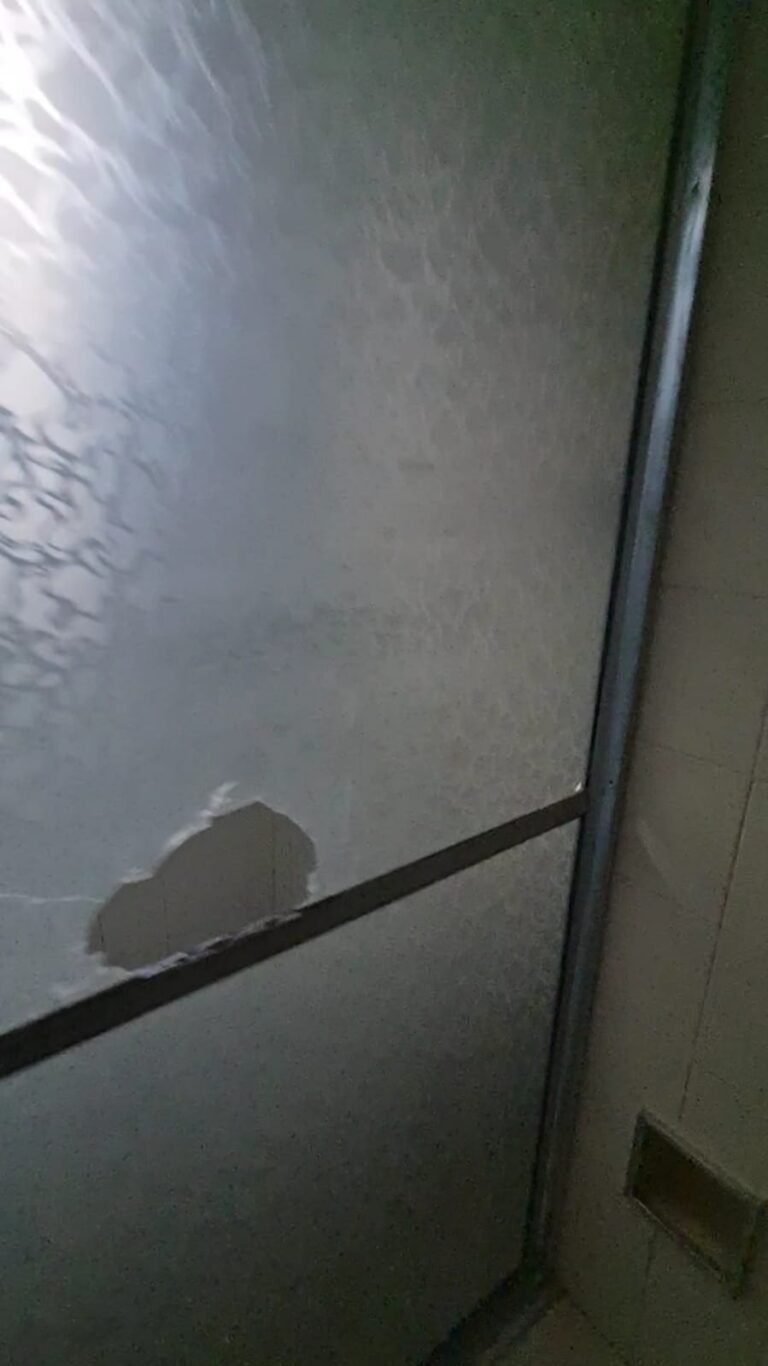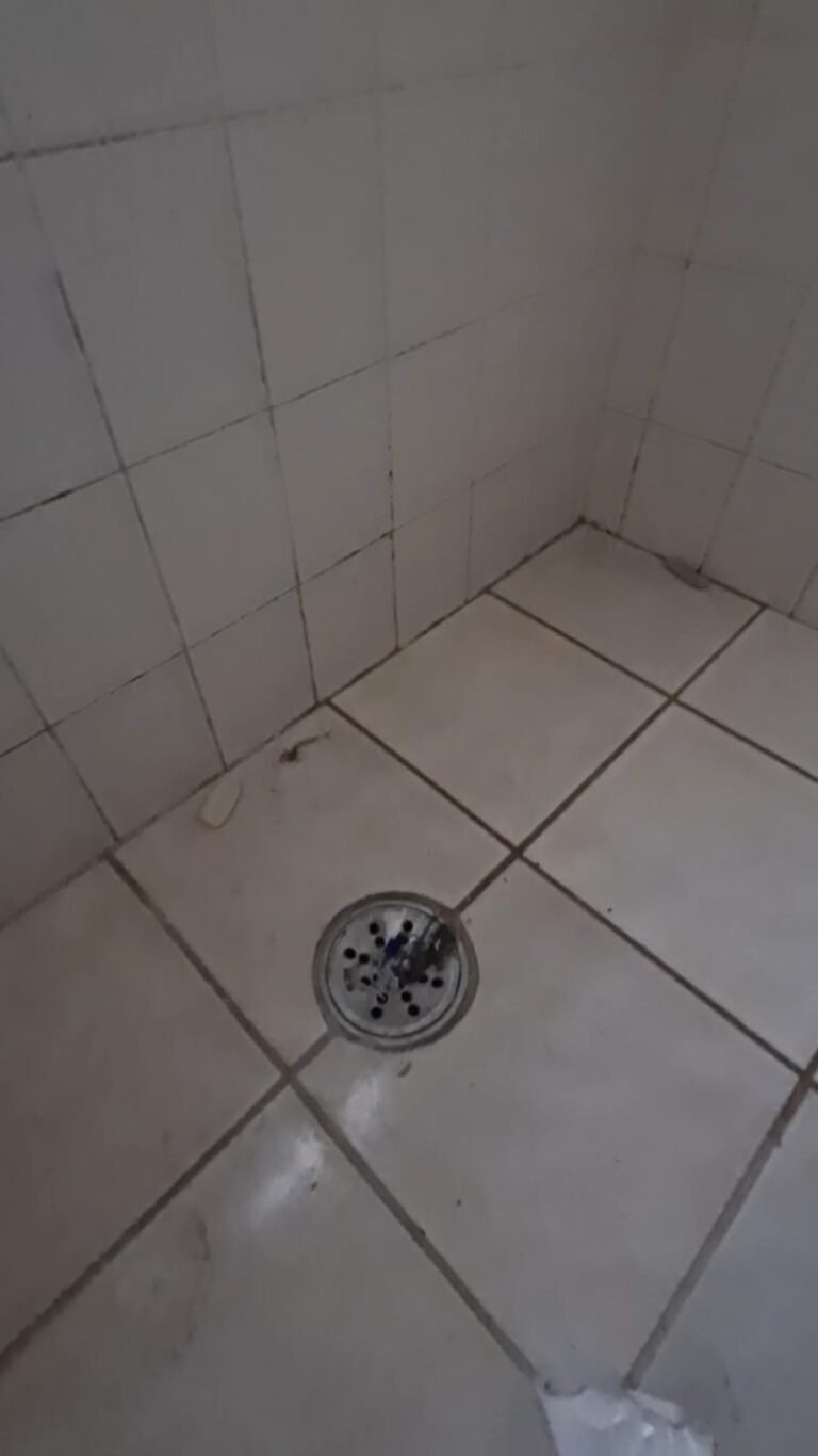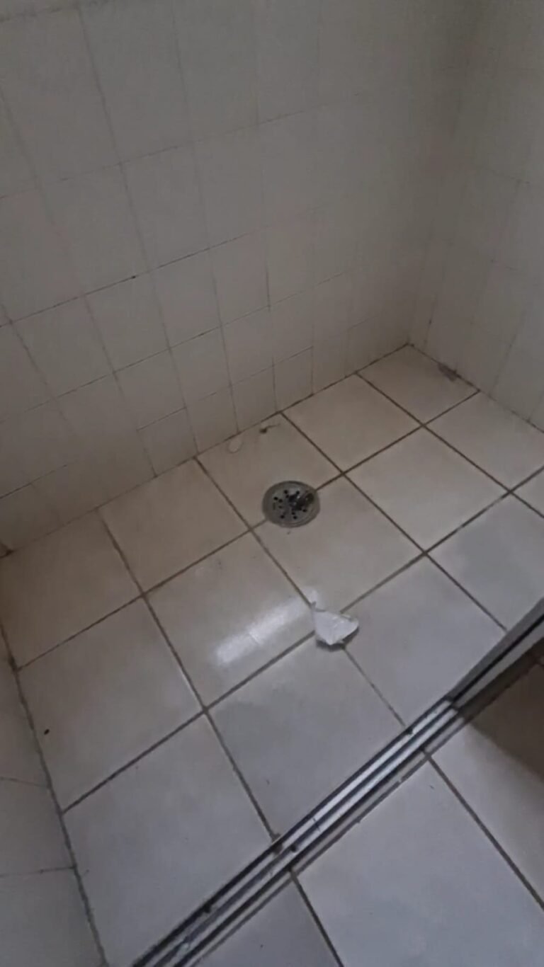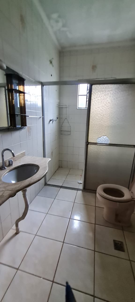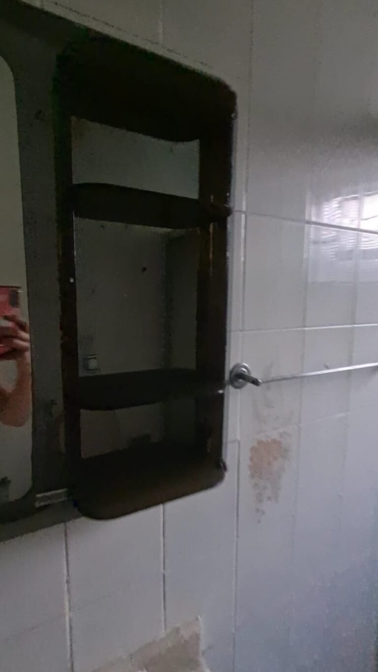 WC:- Teto sujo, armarinho do banheiro com uma porta quebrada, lâmpada queimada, Box de acrílico com uma folha quebrada, banheiro sujo com sabonete e cabelos no chão.