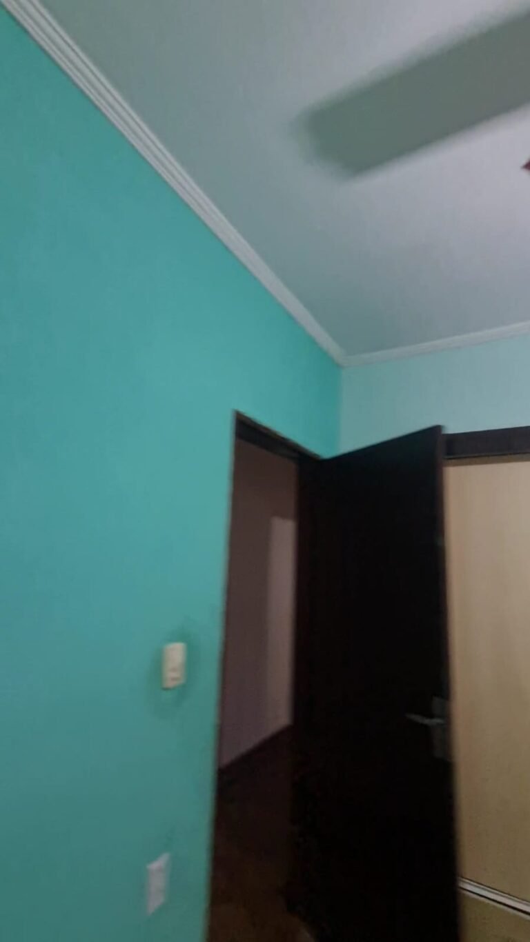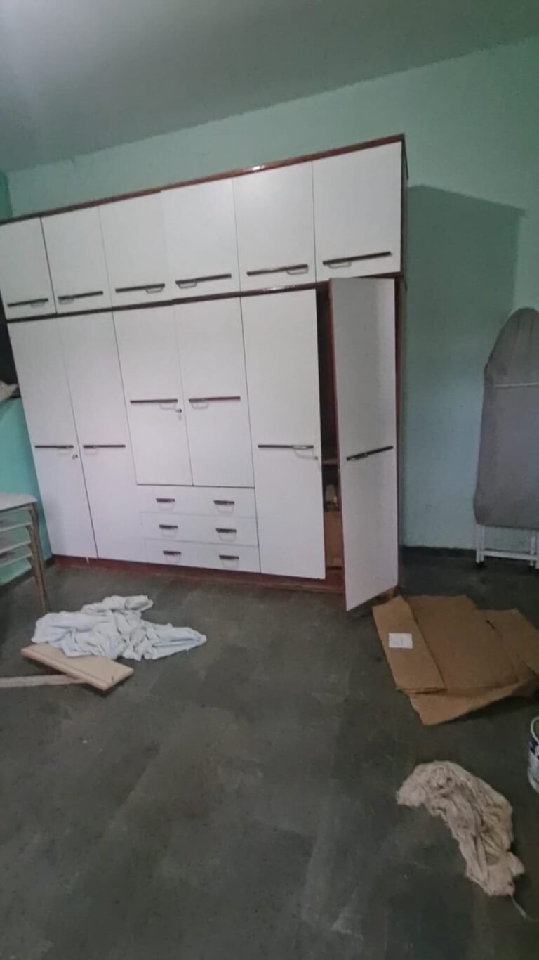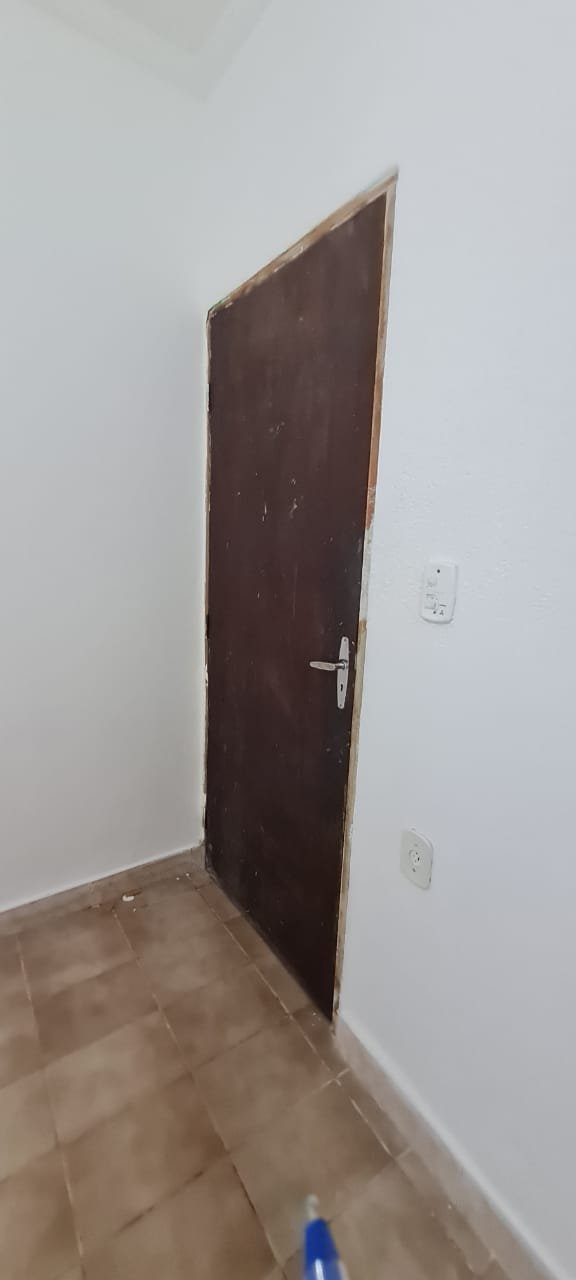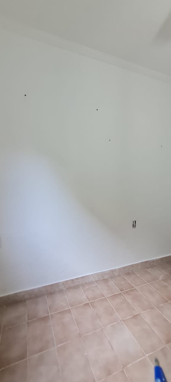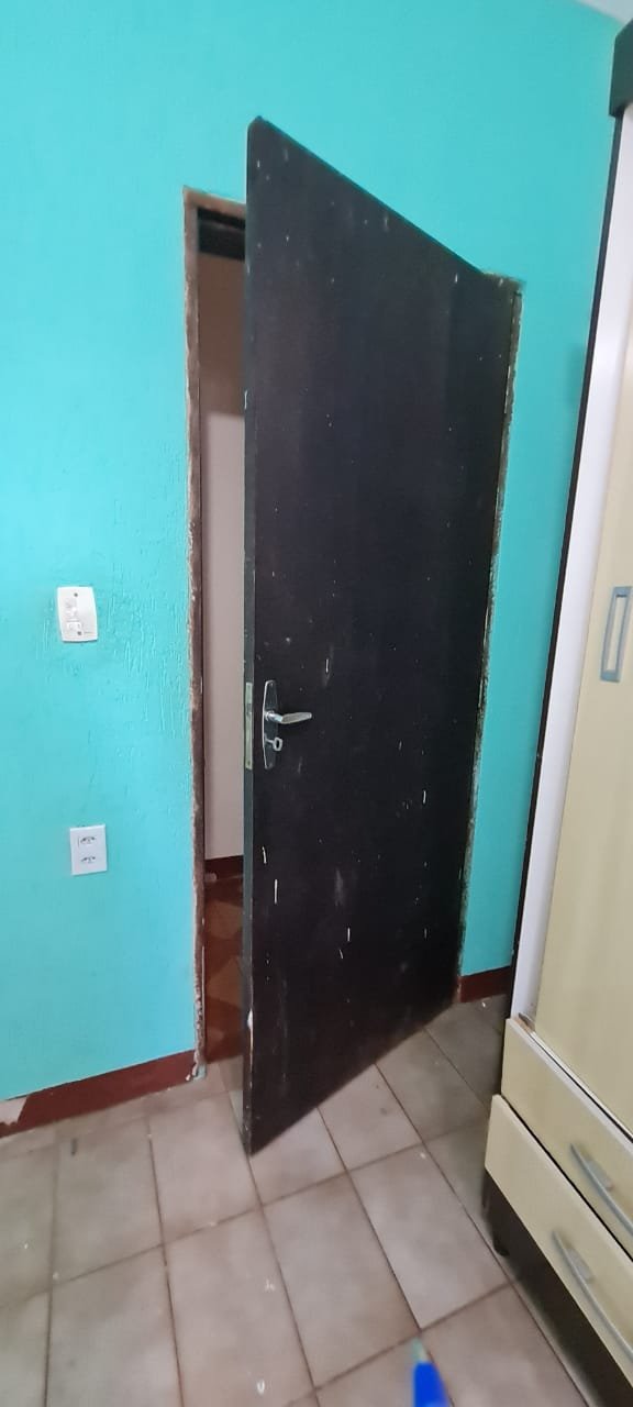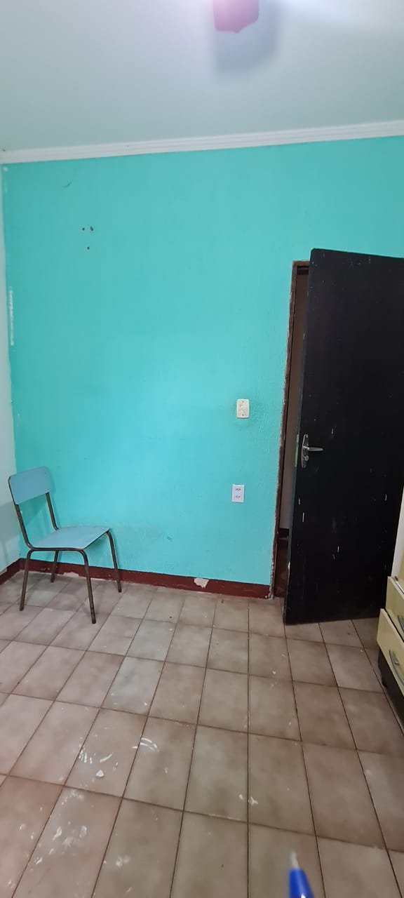 1 Quarto:- Paredes verde suja faltando pintura, parede clara com manchas rolo e descascando na parte de baixo e a sua cor original era verde, piso com sujeira de tinta, rodapés com sujeira de tinta, armário com as 03 portas quebradas, 03 gavetas quebradas, faltando puxador e a tampa da gaveta, cadeado da janela sem a chave.