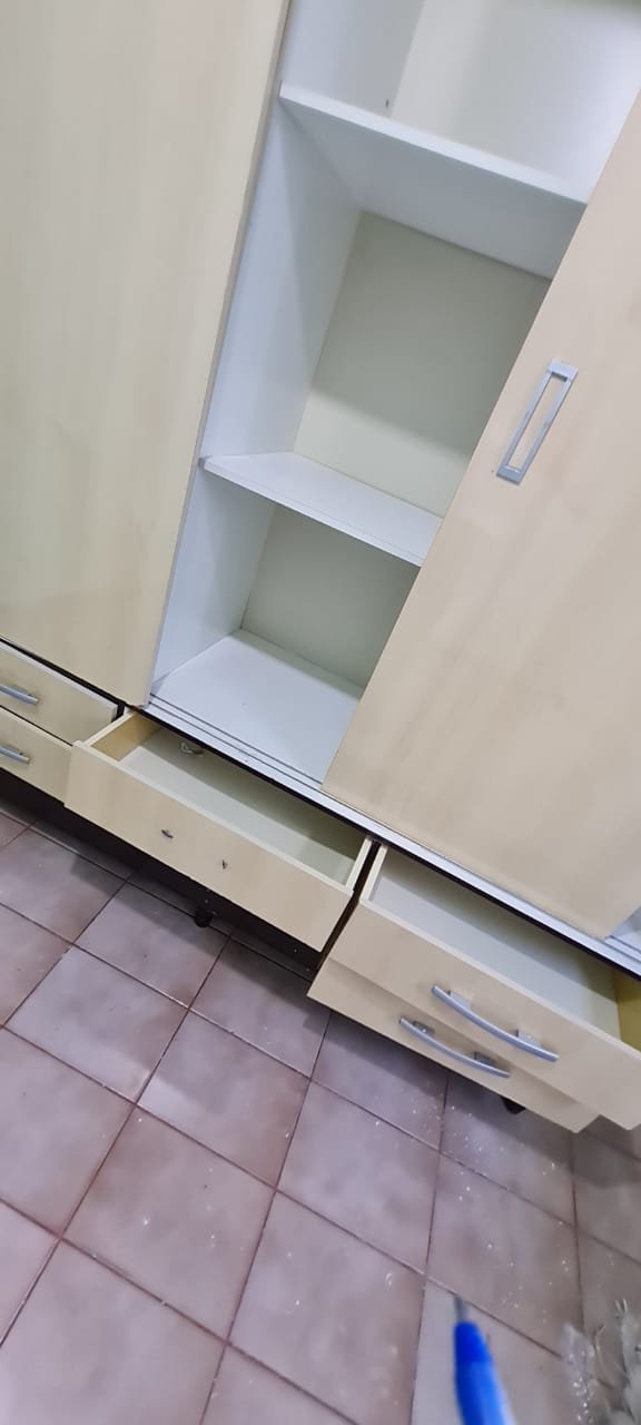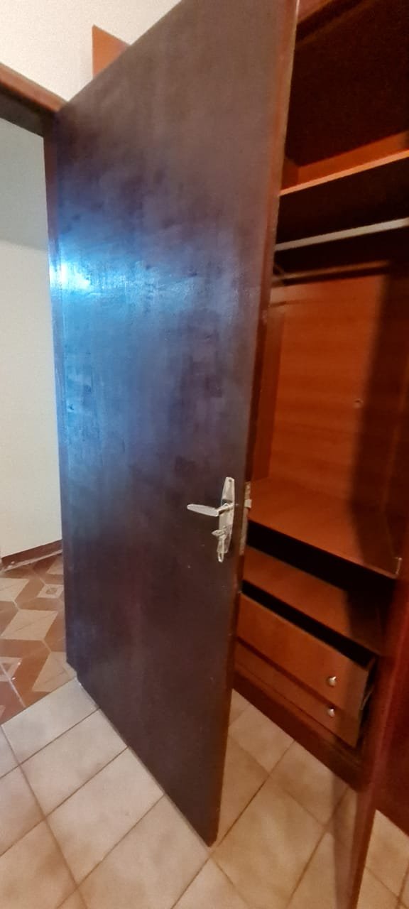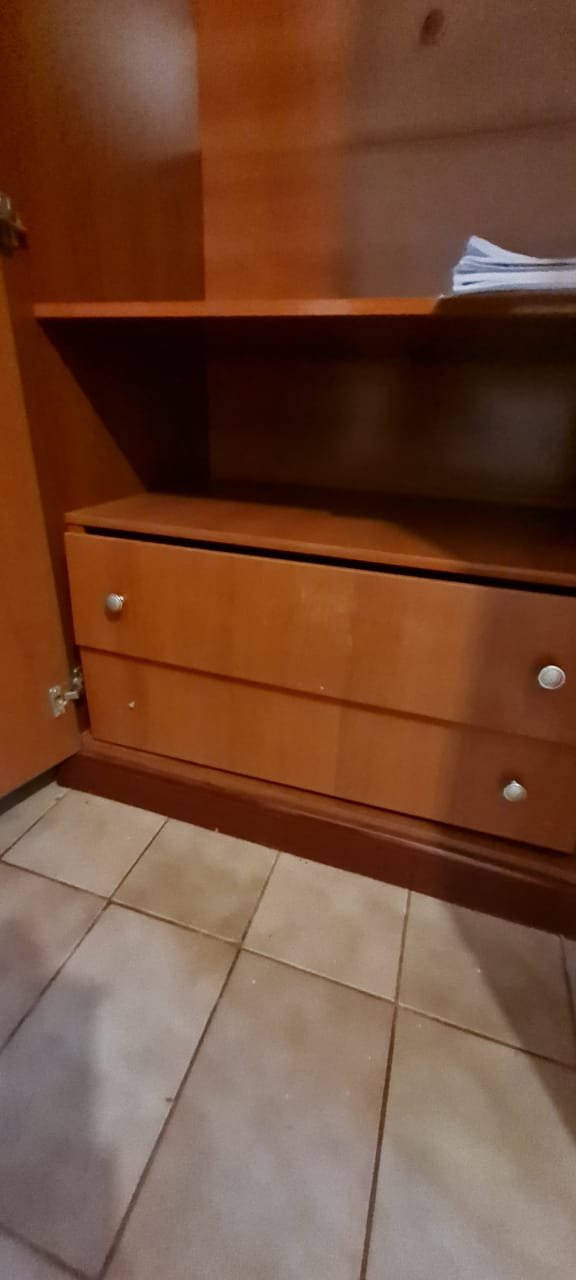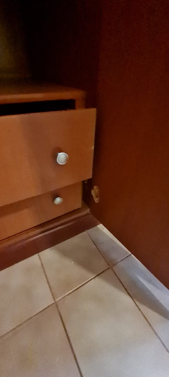 Quarto Suíte:- Parede sem a pintura original, piso com manchas de sujeira, guarda roupas com a base estufada, 04 dobradiças quebradas, 02 gavetas emperradas, faltando 01 puxador na gaveta.