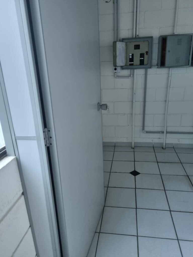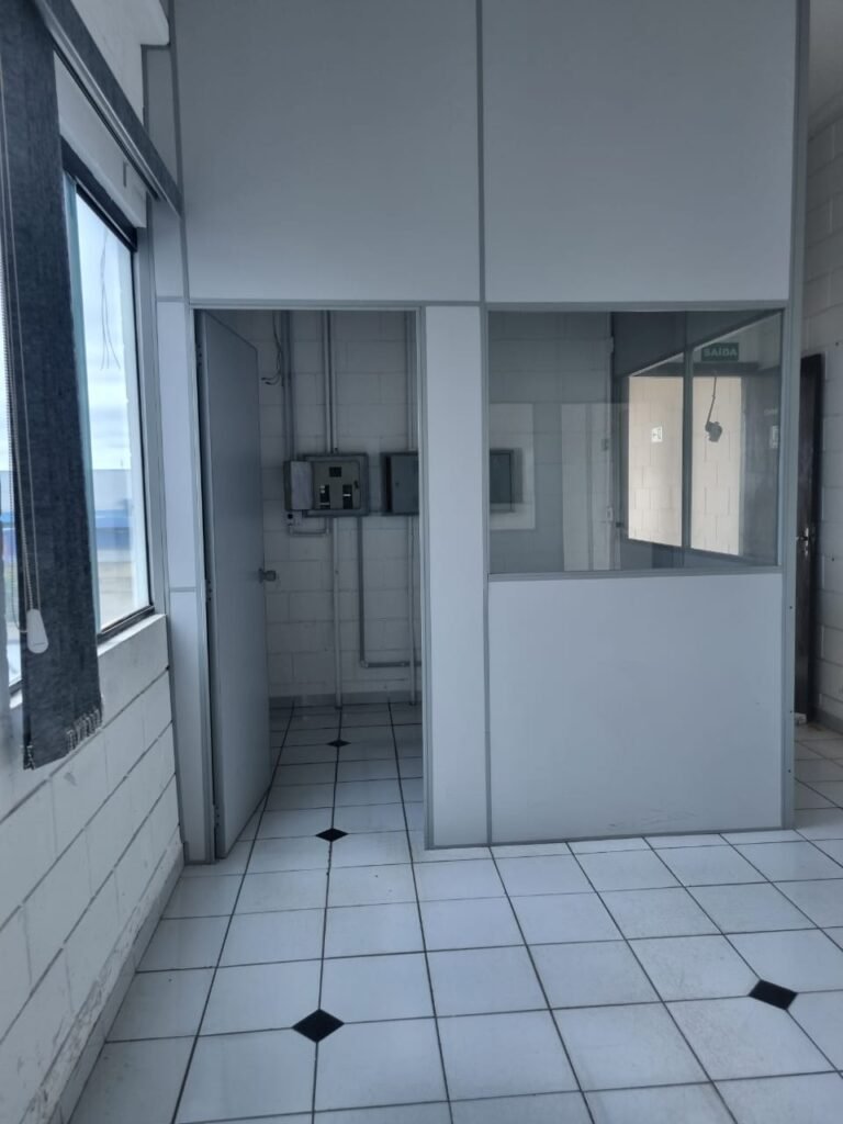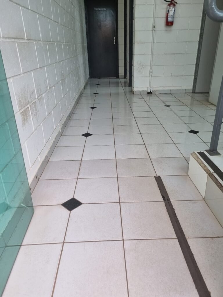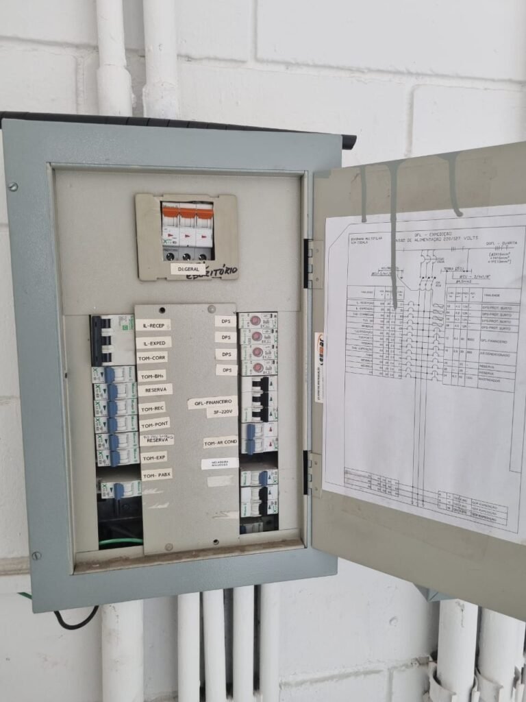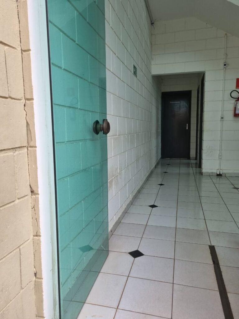 SALA ADMINISTRTIVO:- Piso frio cerâmico, paredes de bloco aparente com pintura na cor branco claro com desgaste e manchas, 02 vitrô de correr com vidros blindex e 02 fechaduras com chaves em ordem, 03 luminárias duplas com 06 lâmpadas LED em ordem, 01 lâmpada de emergência em ordem, teto e gola de gesso com pintura com pintura na cor branco neve, caixa de disjuntores com 19 disjuntores em ordem, porta de madeira de saída para o galpão travada sem chave e maçanetas, porta de madeira saída para a recepção em ordem, maçanetas e fechadura em ordem.