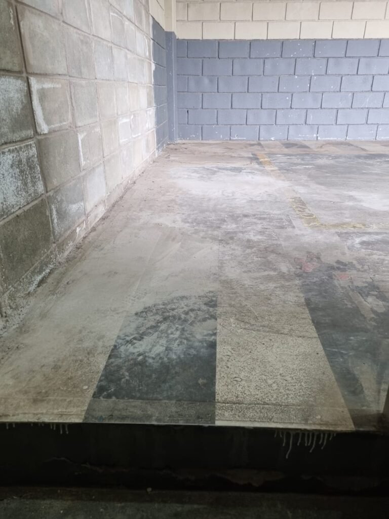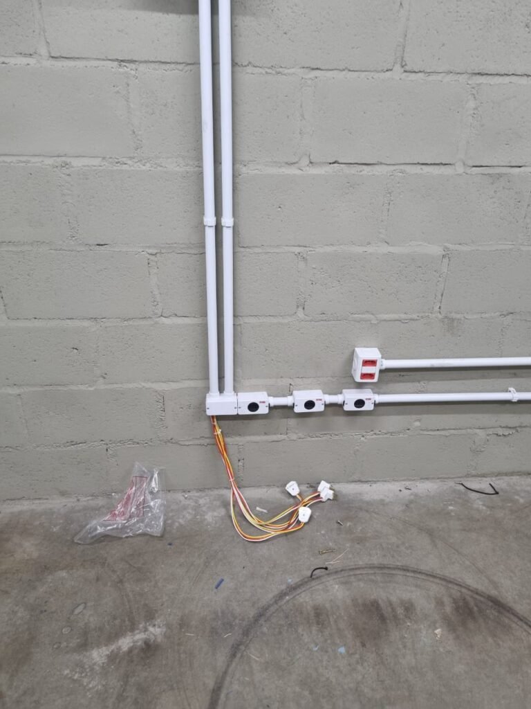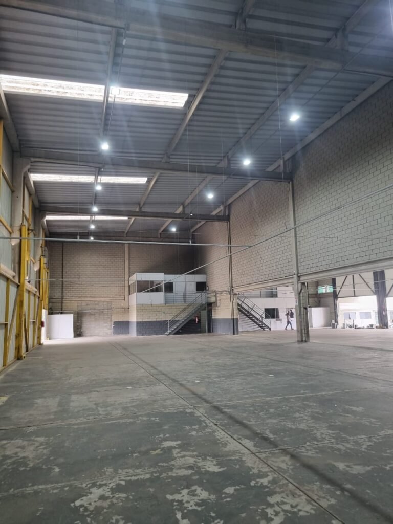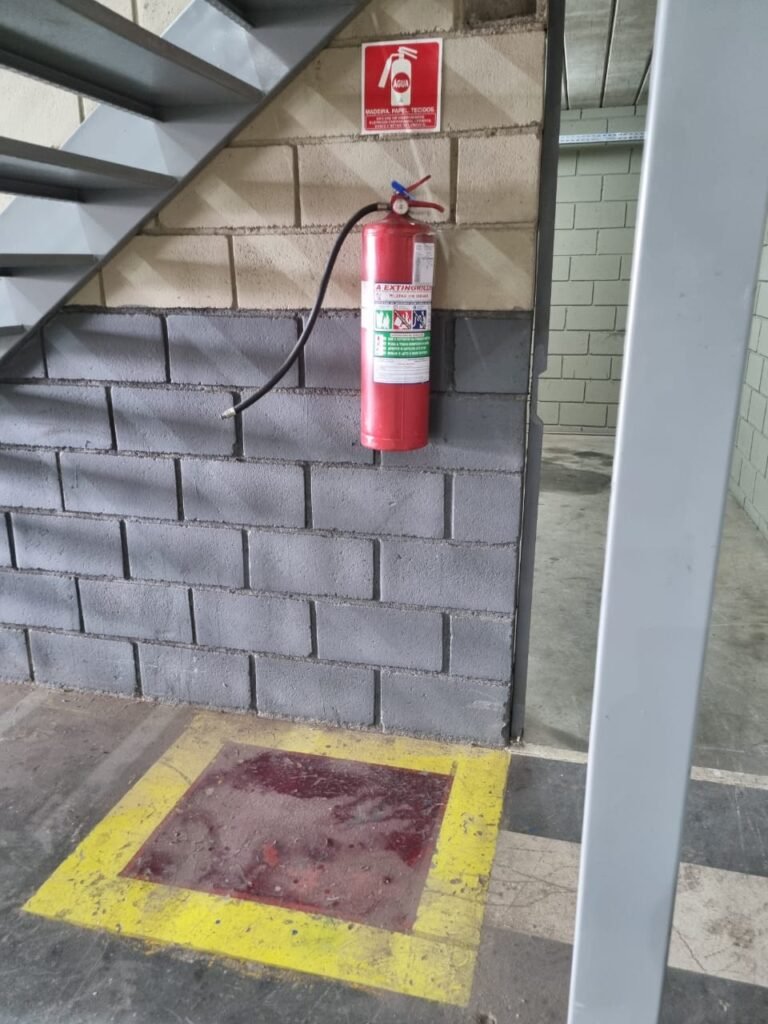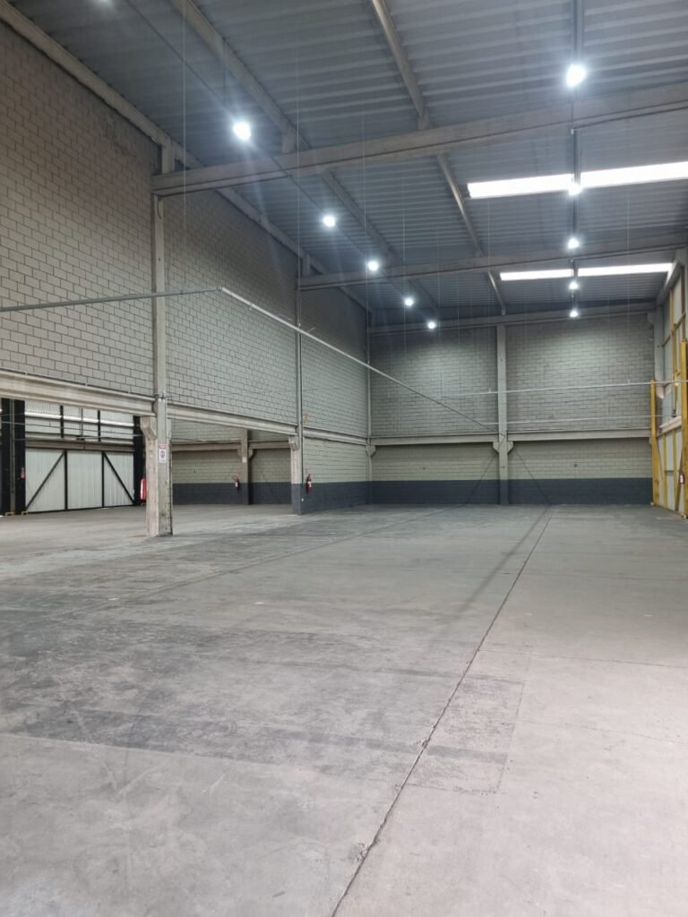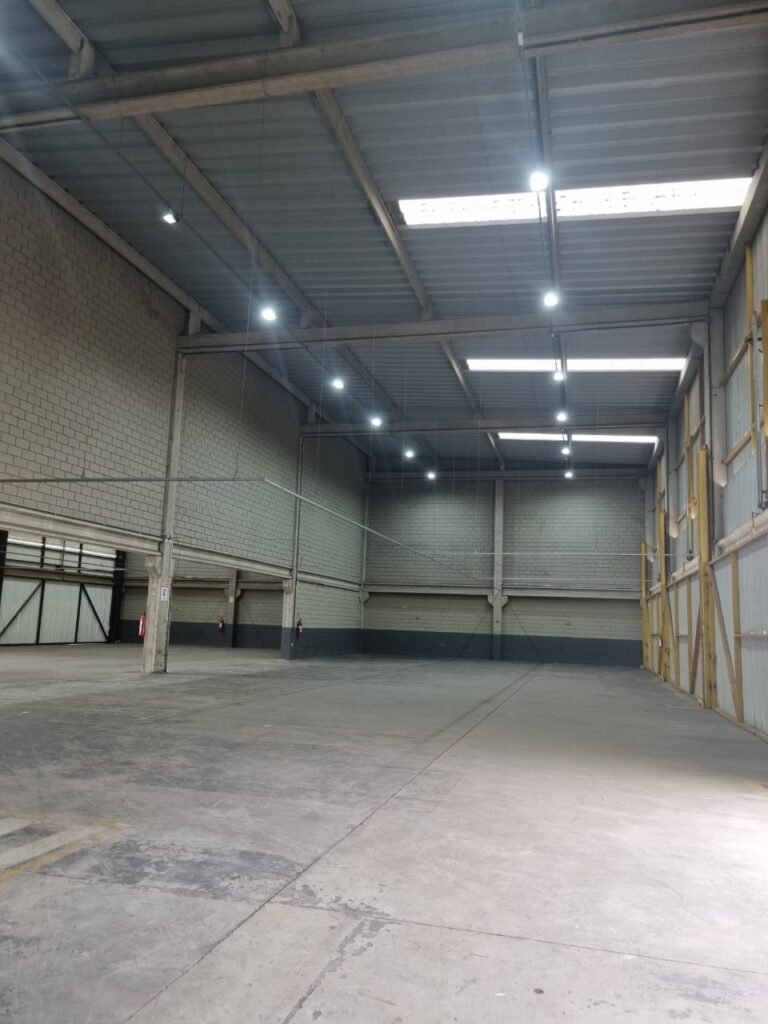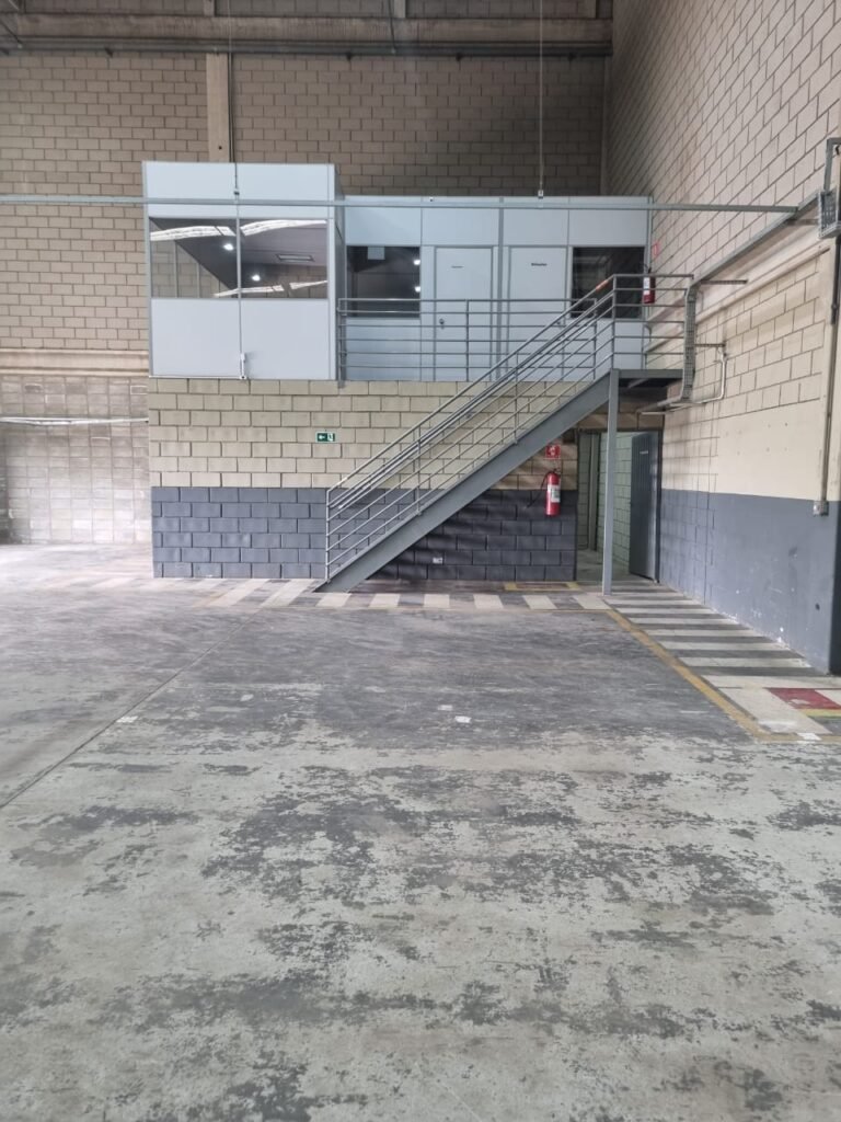 GALPÃO:- Piso concreto usinado com demarcações com tinta na cor amarela, paredes de bloco aparente pintura com barrado na cor cinza e restante na cor bege acinzentado em ordem, 04 portas tipo guilhotina com telhas galvanizadas roldanas e contrapesos em ordem, 01 como de bloco aparente com laje e porta de ferro enroscando, 02 lâmpadas em ordem, escada de ferro com degraus em chapa xadrez e corrimão de ferro tubular em ordem, instalações elétricas do galpão por conduletes, caixa de disjuntores com 17 disjuntores em ordem, 15 holofotes LED sendo que 02 estão piscando restante em ordem.