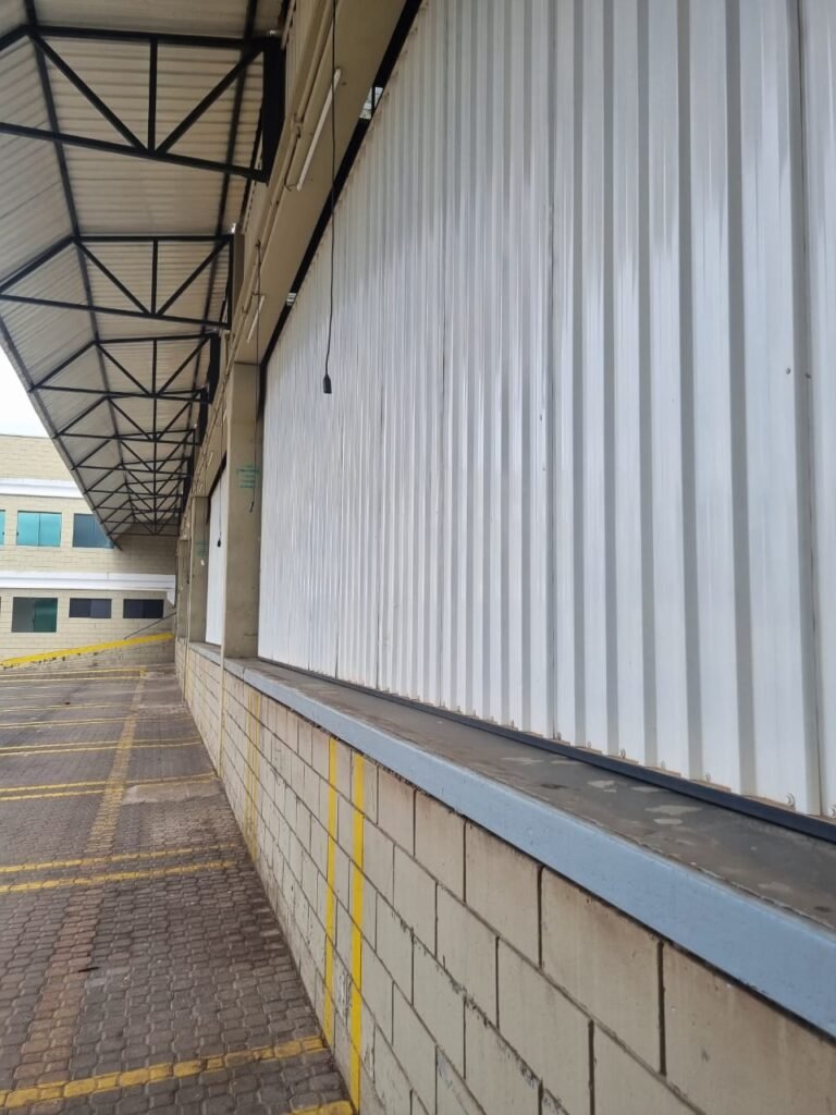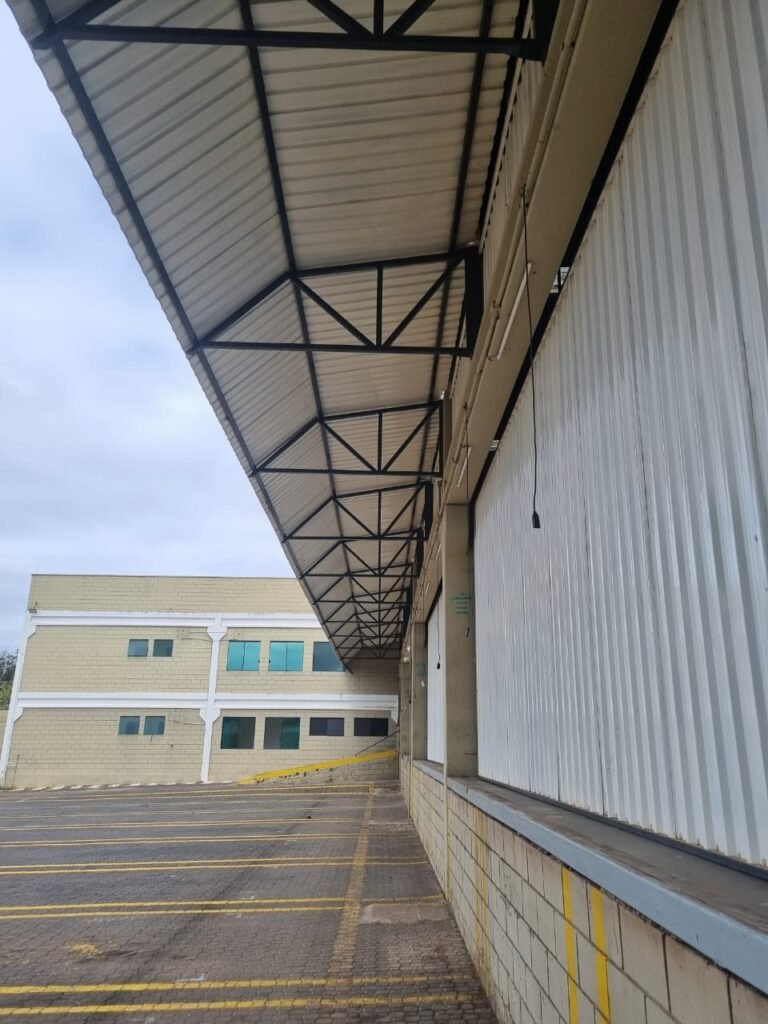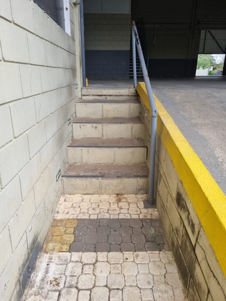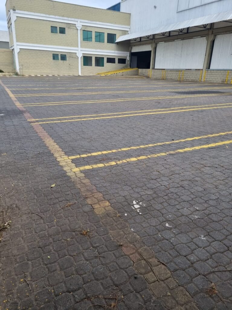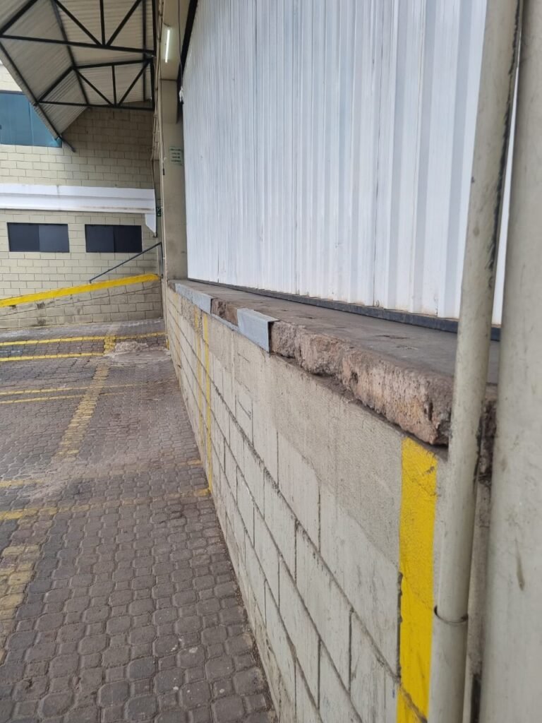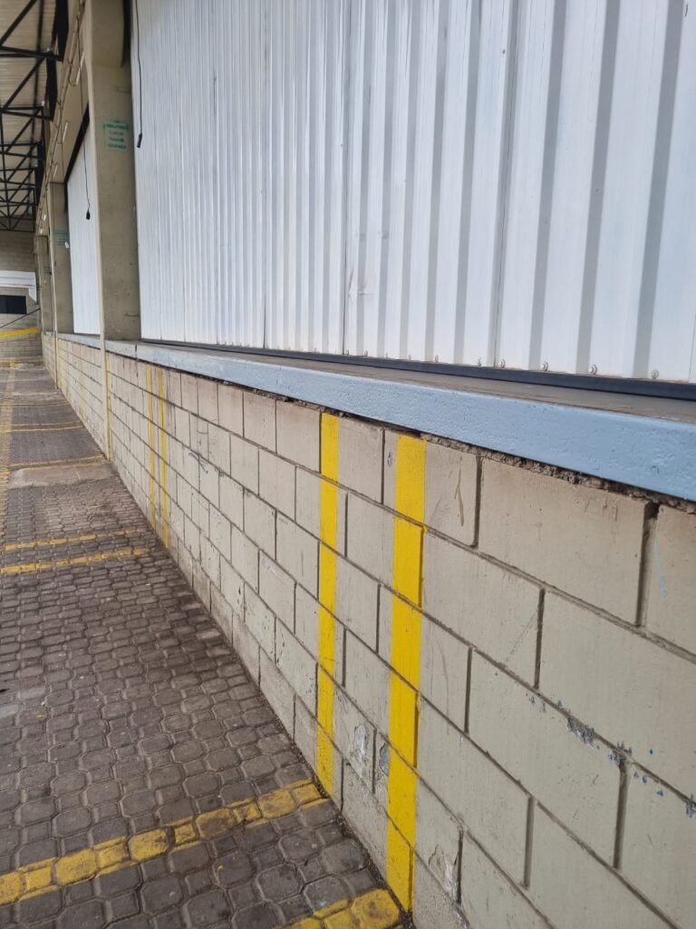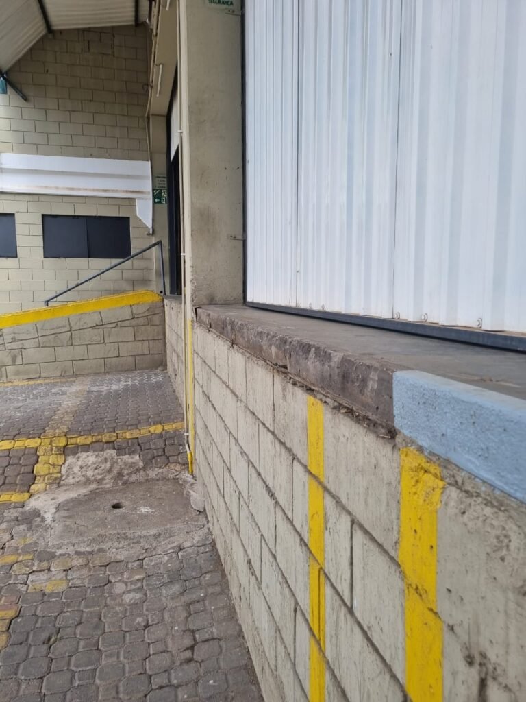 FACHADA:- Calçada piso bloquete Inter travado em ordem, muros de bloco aparente sem pintura, 03 portões deslizante de chapa galvanizada com pintura na cor branco com desgaste, roldanas em ordem, pátio piso de bloquete Inter travado com demarcações de vagas com pintura na cor amarelo com desgaste, parede do prédio administrativo e muros com pintura barrado nas cores bege e branco ambos com mancha e desgaste, 06 refletores com lâmpadas, fachada telhas chapa galvanizadas com pintura na cor branco com desgaste, docas faltando dormentes de madeira para batedores, rampa de alvenaria para acesso de empilhadeiras, escada de alvenaria com 04 degraus, corrimão em ordem.