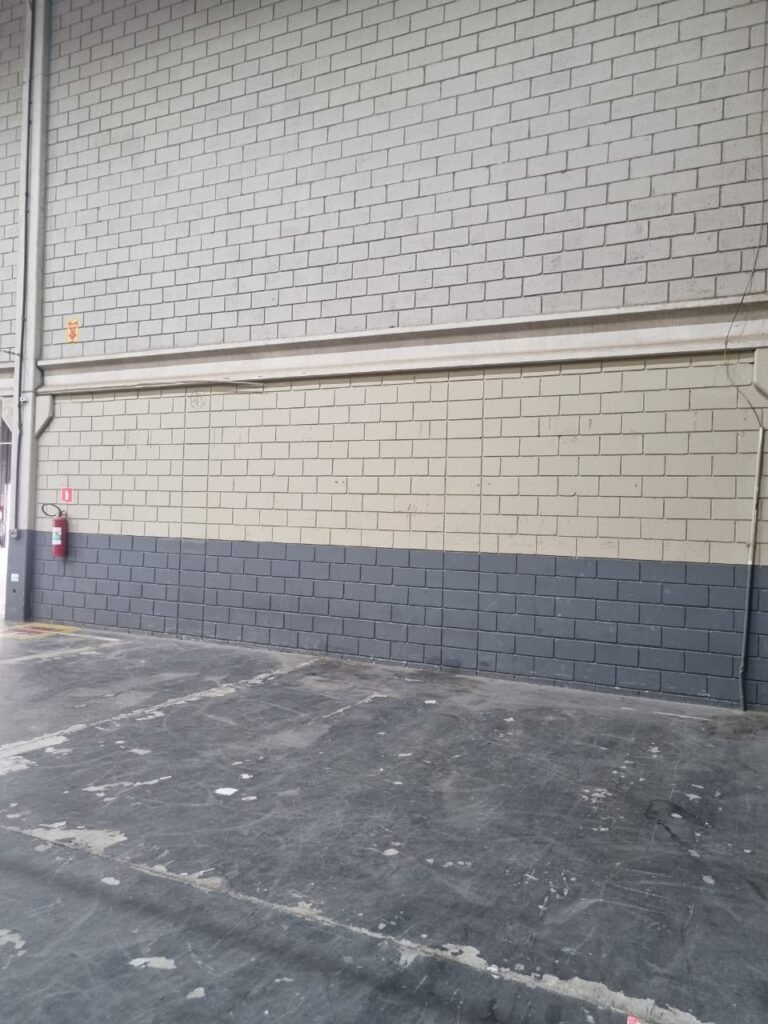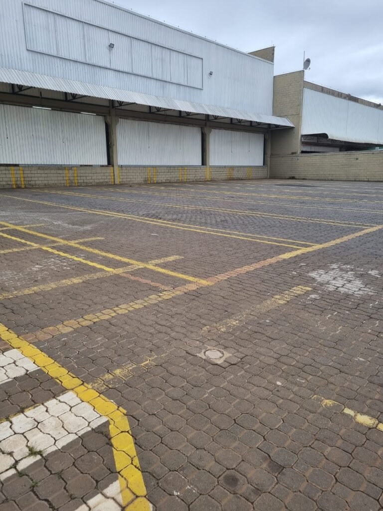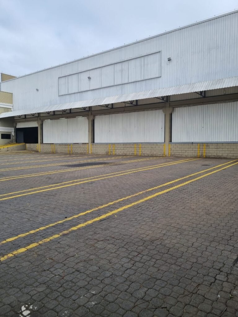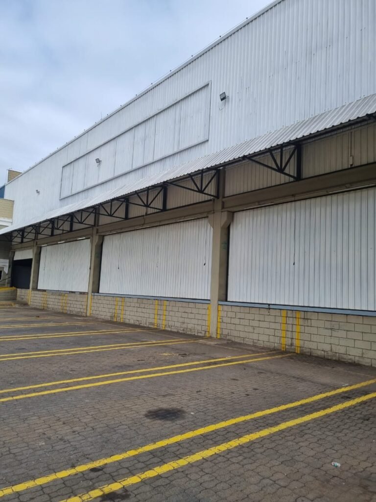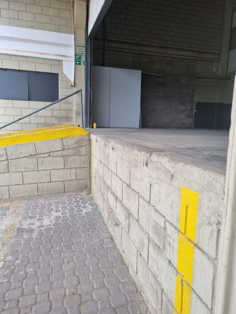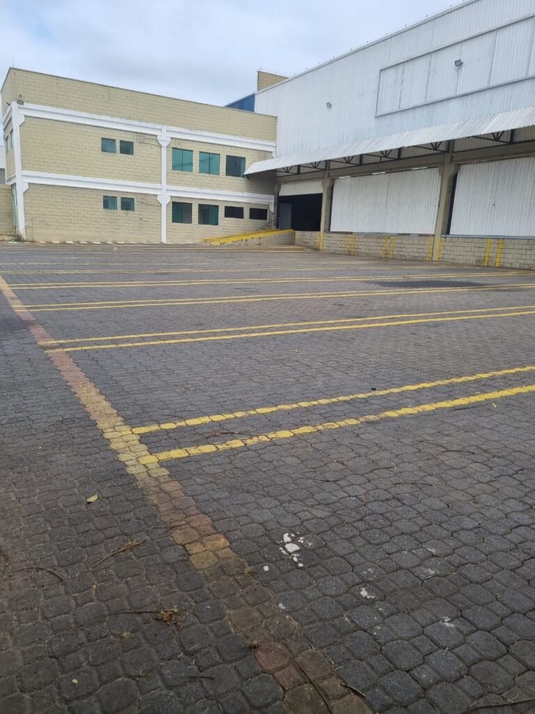 FACHADA:- Calçada piso bloquete Inter travado em ordem, muros de bloco aparente sem pintura, 03 portões deslizante de chapa galvanizada com pintura na cor branco com desgaste, roldanas em ordem, pátio piso de bloquete Inter travado com demarcações de vagas com pintura na cor amarelo com desgaste, parede do prédio administrativo e muros com pintura barrado nas cores bege e branco ambos com mancha e desgaste, 06 refletores com lâmpadas, fachada telhas chapa galvanizadas com pintura na cor branco com desgaste, docas faltando dormentes de madeira para batedores, rampa de alvenaria para acesso de empilhadeiras, escada de alvenaria com 04 degraus, corrimão em ordem.