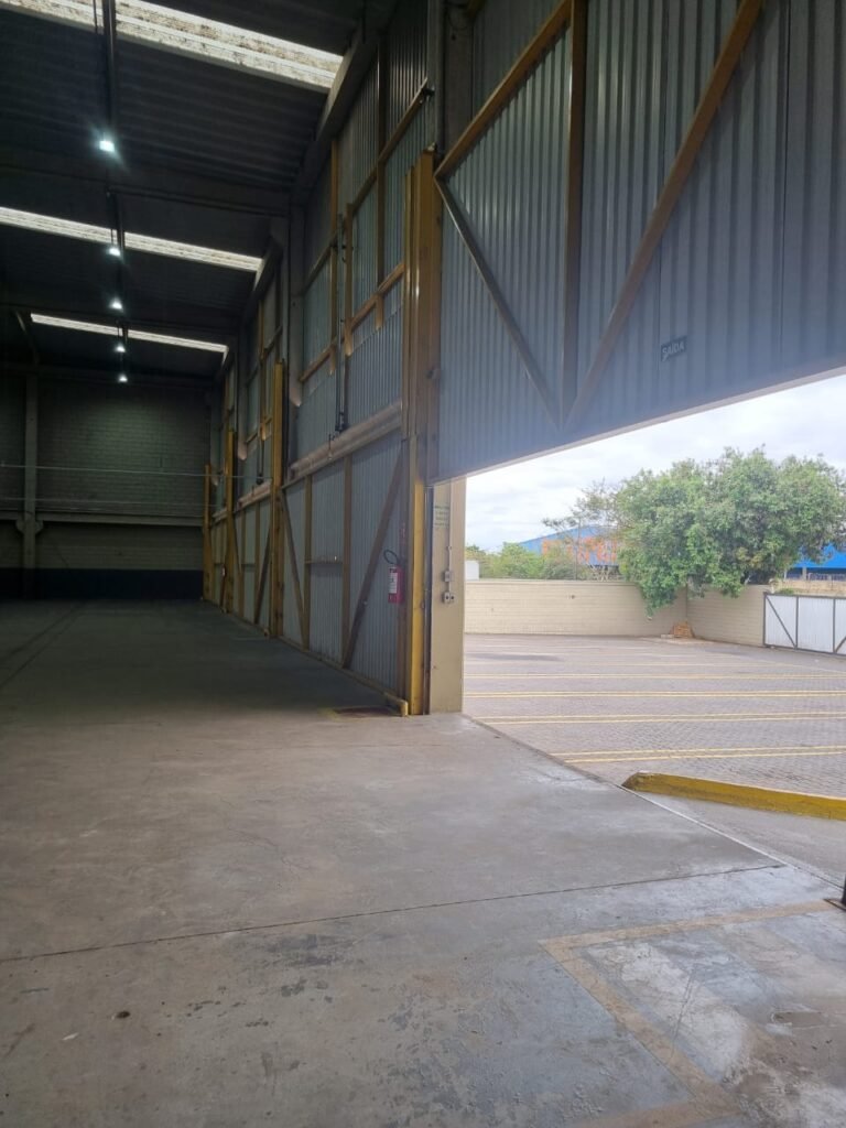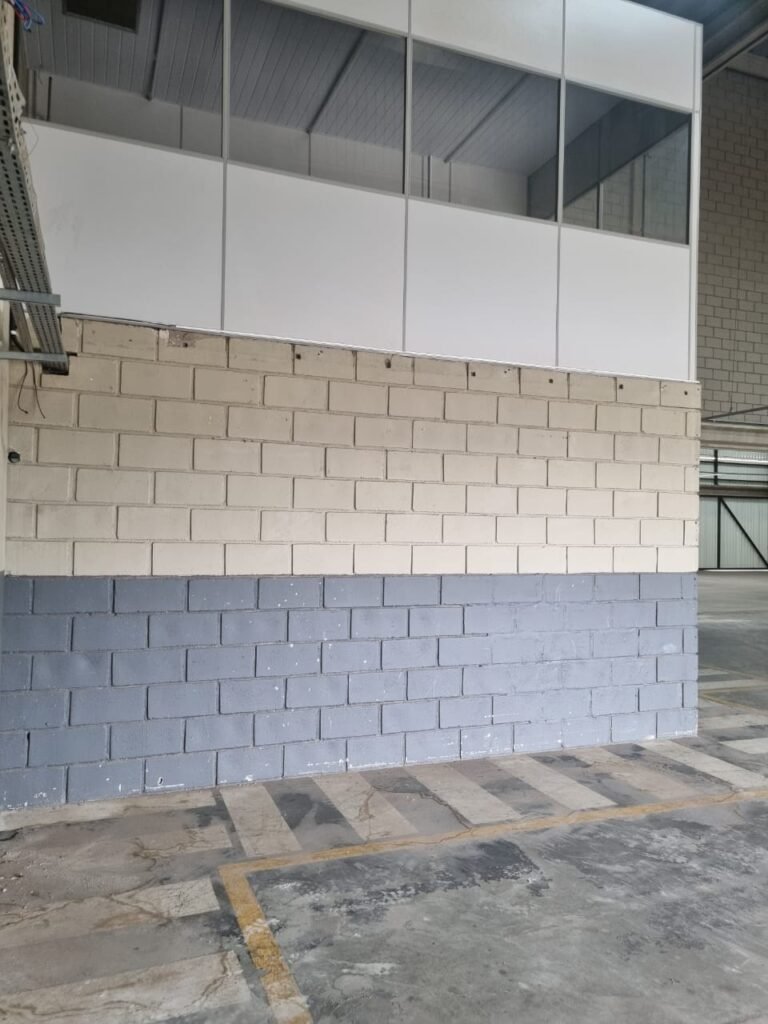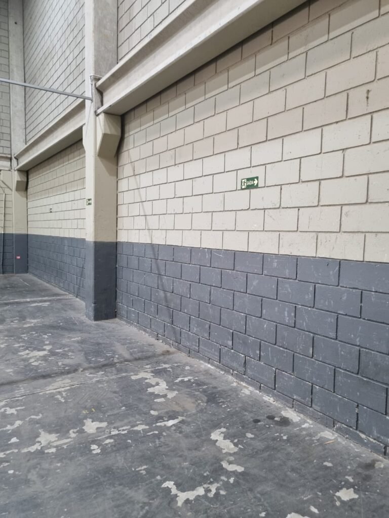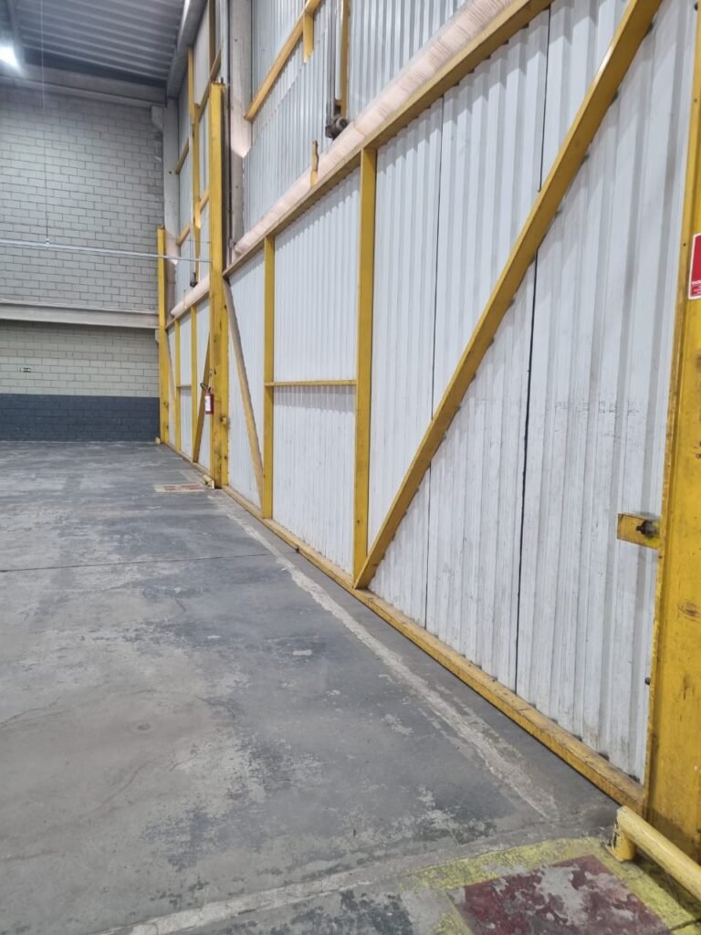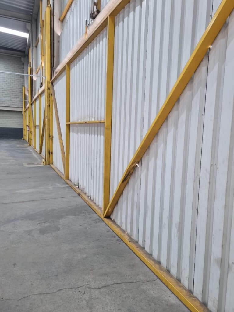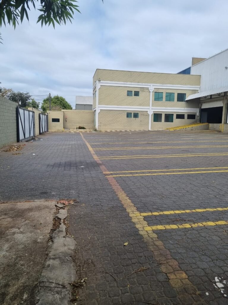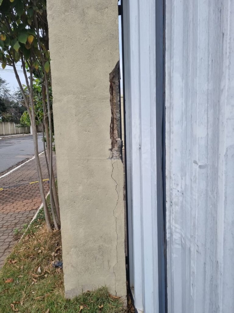 FACHADA:- Calçada piso bloquete Inter travado em ordem, muros de bloco aparente sem pintura, 03 portões deslizante de chapa galvanizada com pintura na cor branco com desgaste, roldanas em ordem, pátio piso de bloquete Inter travado com demarcações de vagas com pintura na cor amarelo com desgaste, parede do prédio administrativo e muros com pintura barrado nas cores bege e branco ambos com mancha e desgaste, 06 refletores com lâmpadas, fachada telhas chapa galvanizadas com pintura na cor branco com desgaste, docas faltando dormentes de madeira para batedores, rampa de alvenaria para acesso de empilhadeiras, escada de alvenaria com 04 degraus, corrimão em ordem.