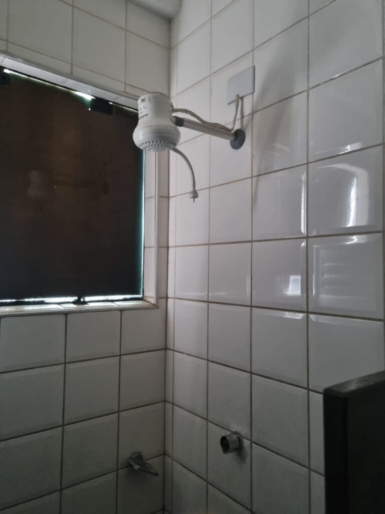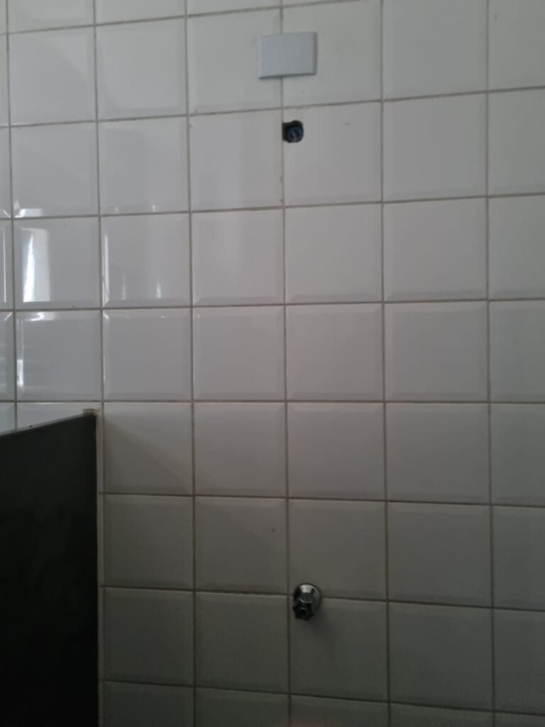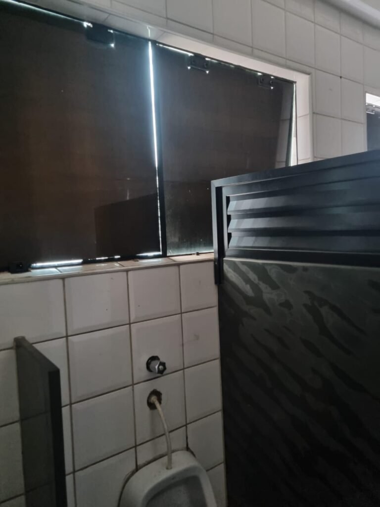 VESTIÁRIO:- Piso frio cerâmico com manchas restante em ordem, 02 ralos com tampa e desentupidos, 05 divisórias de pedra ardósia em ordem, 01 chuveiro Lorenzetti, 02 luminárias duplas somente 02 lâmpadas em ordem, 03 registros em ordem, 02 conjunto de vaso sanitário com caixa acoplada de descarga em ordem, pia de mármore branco encardido, cuba cerâmica em ordem, torneira em ordem, sifão universal em ordem, porta de madeira, maçaneta quebrada, gola de gesso e teto com pintura na cor branco neve, 02 vitrô com vidro blindex e vidros lisos transparentes com insulfilme preto, 01 mictório cerâmica branca em ordem.