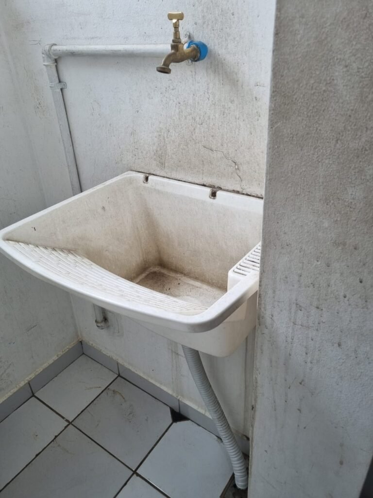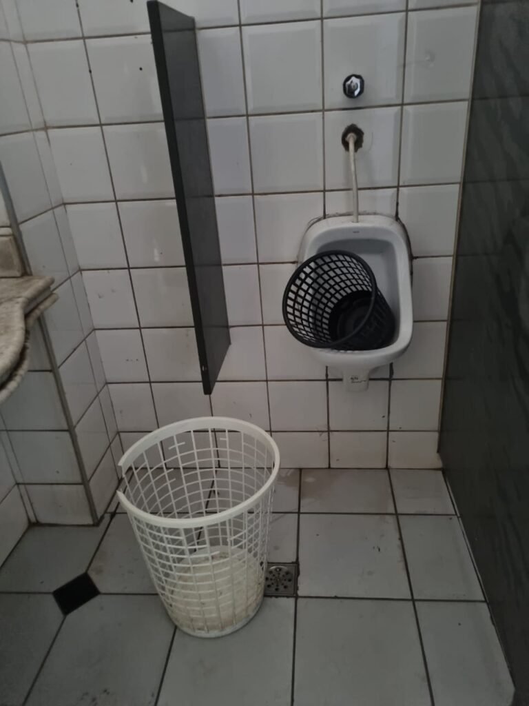 BANHEIRO MASCULINO:– Piso frio cerâmico em ordem, 01 ralo com tampa em ordem, paredes amaciadas com pintura na cor branco, 01 luminária dupla com lâmpadas fluorescentes tubular em ordem, 01 bocal com lâmpada fluorescente compacta em ordem, 02 interruptores em ordem, pia mármore branco em ordem, torneira sem torneira, sem sifão, sem conjunto vaso sanitário e caixa acoplada de descarga, vitrô basculante com puxador/trava quebrado, vidro blindex liso transparente, teto com pintura na cor branco, porta de madeira em ordem, maçanetas em ordem, fechadura e chave em ordem, 01 tanque de plástico em ordem.