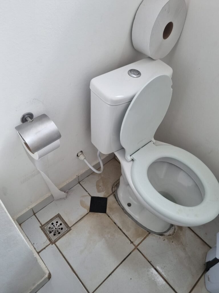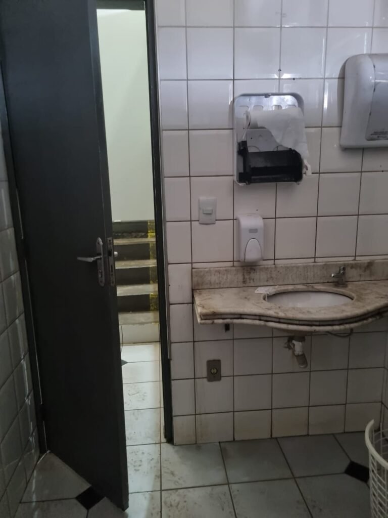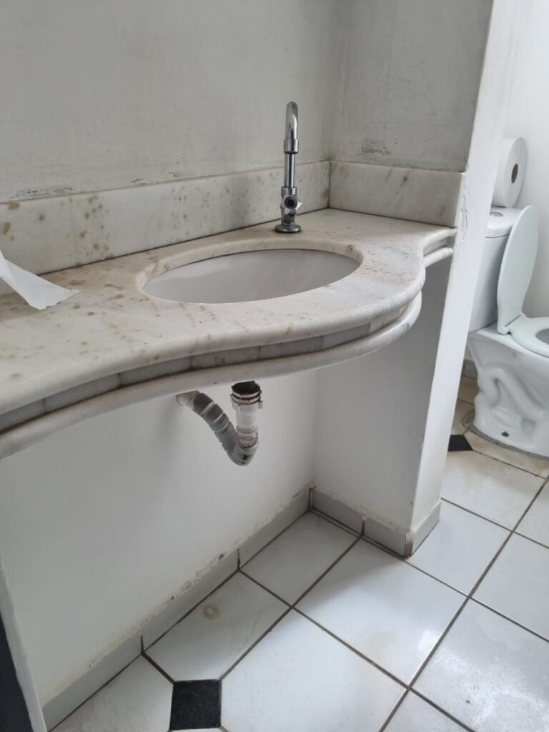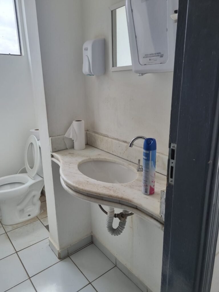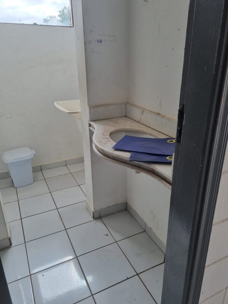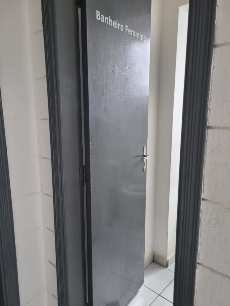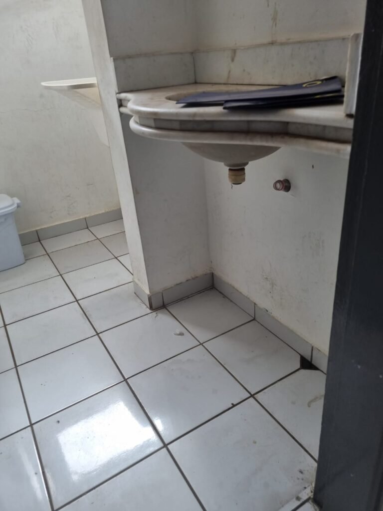 BANHEIRO FEMININO:- Piso frio cerâmico em ordem, 01 ralo com tampa em ordem, paredes amaciadas com pintura na cor branco neve, 01 luminária dupla com lâmpadas fluorescentes tubular em ordem, 02 bocais com lâmpada LED compacta em ordem, 02 interruptores em ordem, pia mármore branco em ordem, torneira fortiti, sifão universal em ordem, conjunto vaso sanitário e caixa acoplada de descarga cerâmica branca acionador da descarga quebrado, vitrô basculante com puxador/trava em ordem, vidro blindex, teto com buraco, porta de madeira em ordem, maçanetas em ordem, fechadura sem chave.