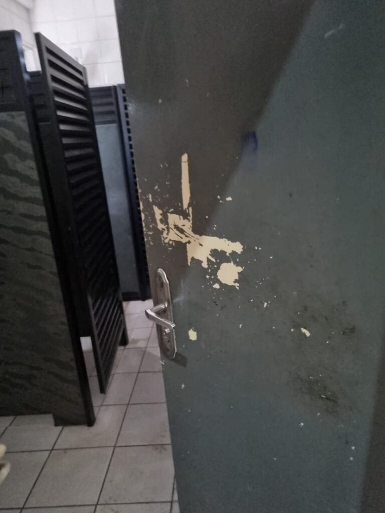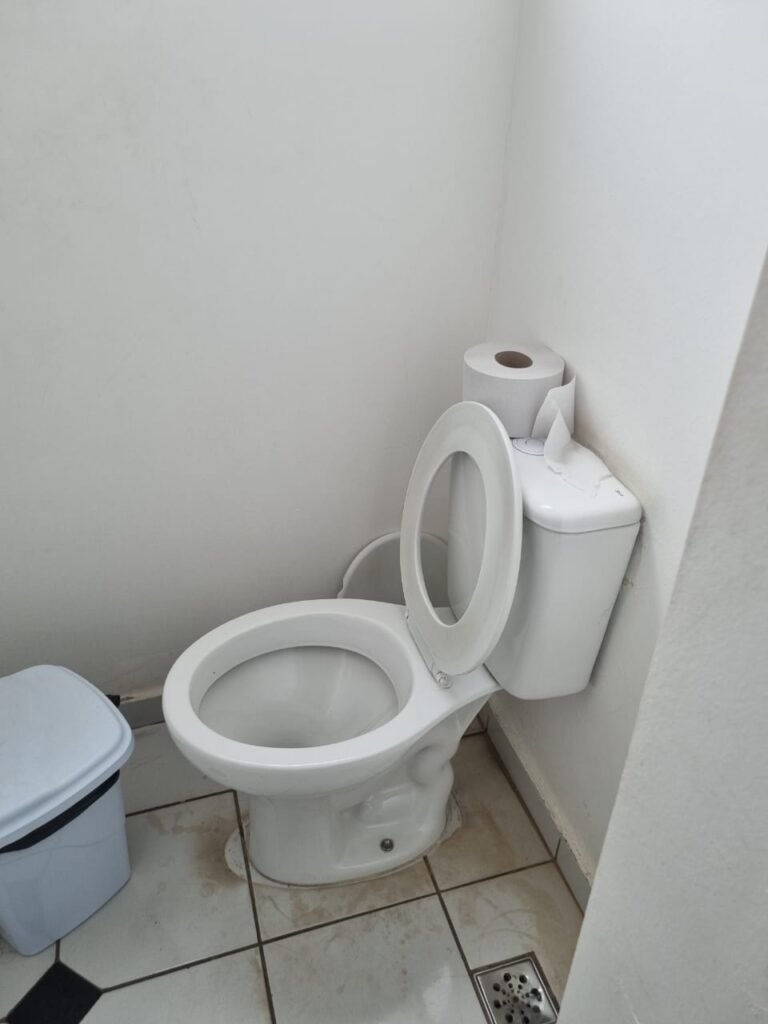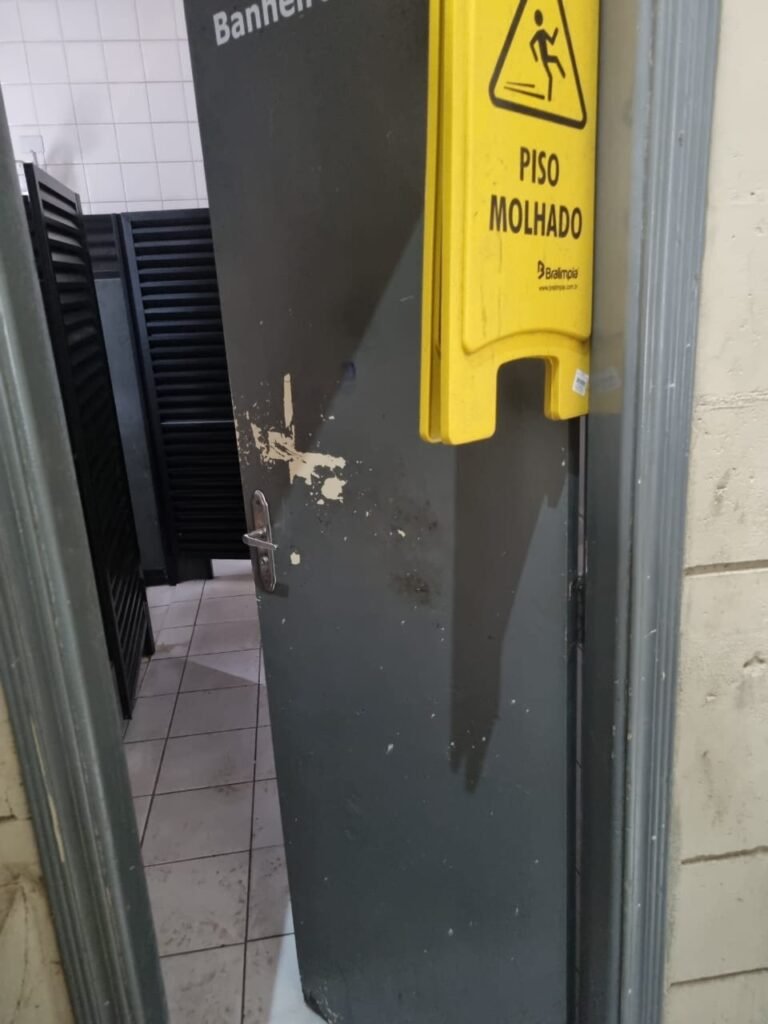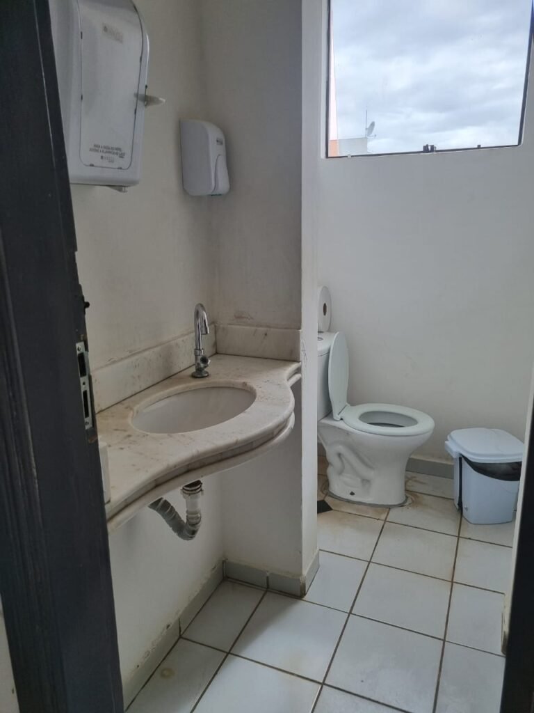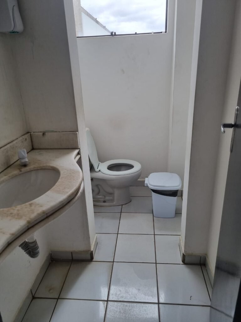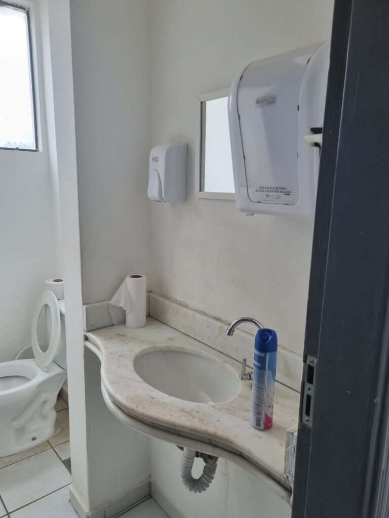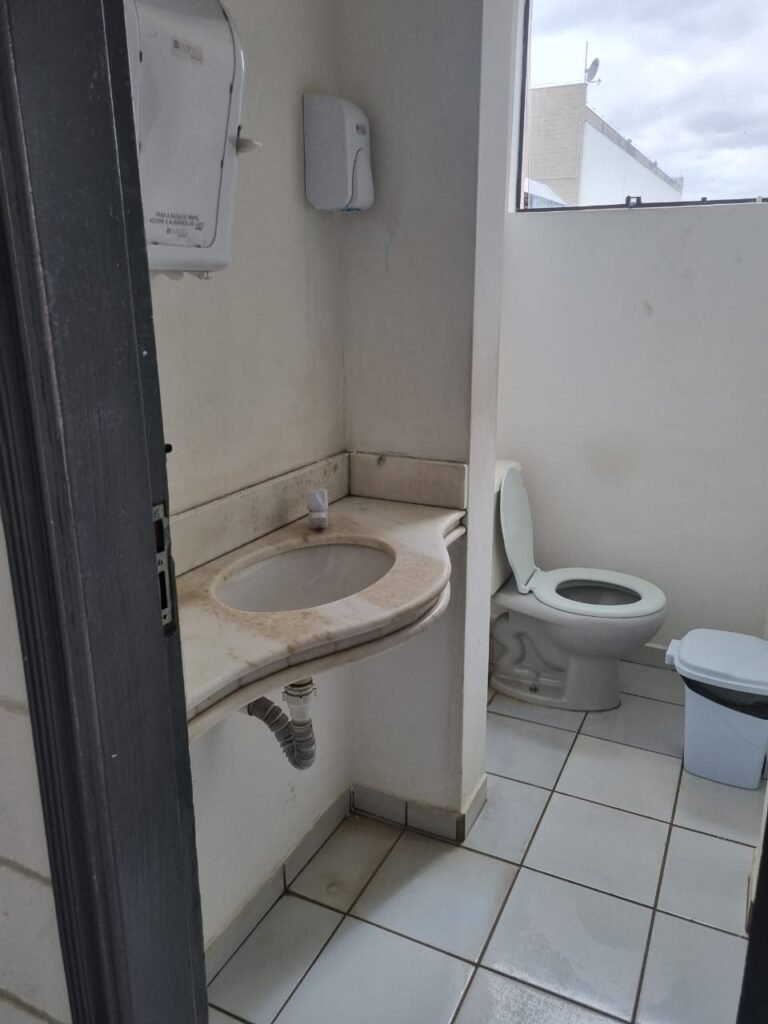 BANHEIRO FEMININO:- Piso frio cerâmico em ordem, 01 ralo com tampa em ordem, paredes amaciadas com pintura na cor branco neve, 01 luminária dupla com lâmpadas fluorescentes tubular em ordem, 02 bocais com lâmpada LED compacta em ordem, 02 interruptores em ordem, pia mármore branco em ordem, torneira fortiti, sifão universal em ordem, conjunto vaso sanitário e caixa acoplada de descarga cerâmica branca acionador da descarga quebrado, vitrô basculante com puxador/trava em ordem, vidro blindex, teto com buraco, porta de madeira em ordem, maçanetas em ordem, fechadura sem chave.