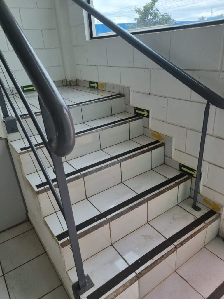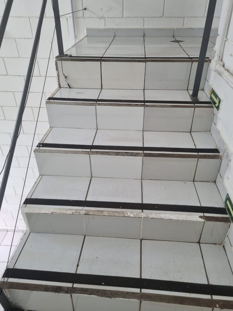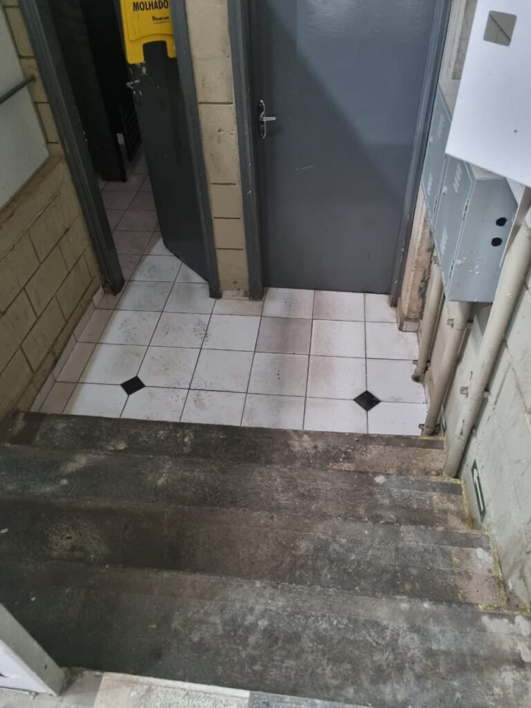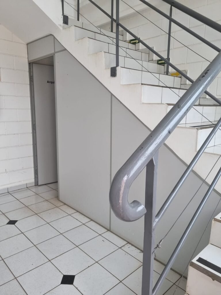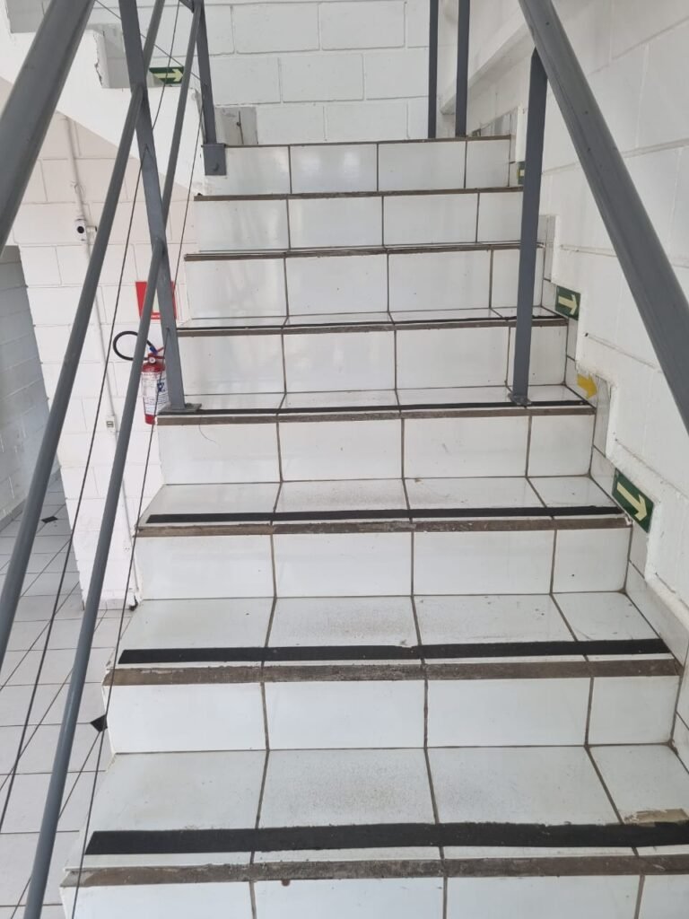 RECEPÇÃO:- Piso frio cerâmico em ordem, paredes de blocos aparente com pintura na cor branca, escada de alvenaria com degraus revestidos de piso frio cerâmico, corrimão e guarda corpo em ordem, 01 interruptor em ordem, 04 lâmpadas LED tubular em ordem, porta de vidro blindex transparente com insulfilme preto, maçanetas e fechadura em ordem, chave em ordem.