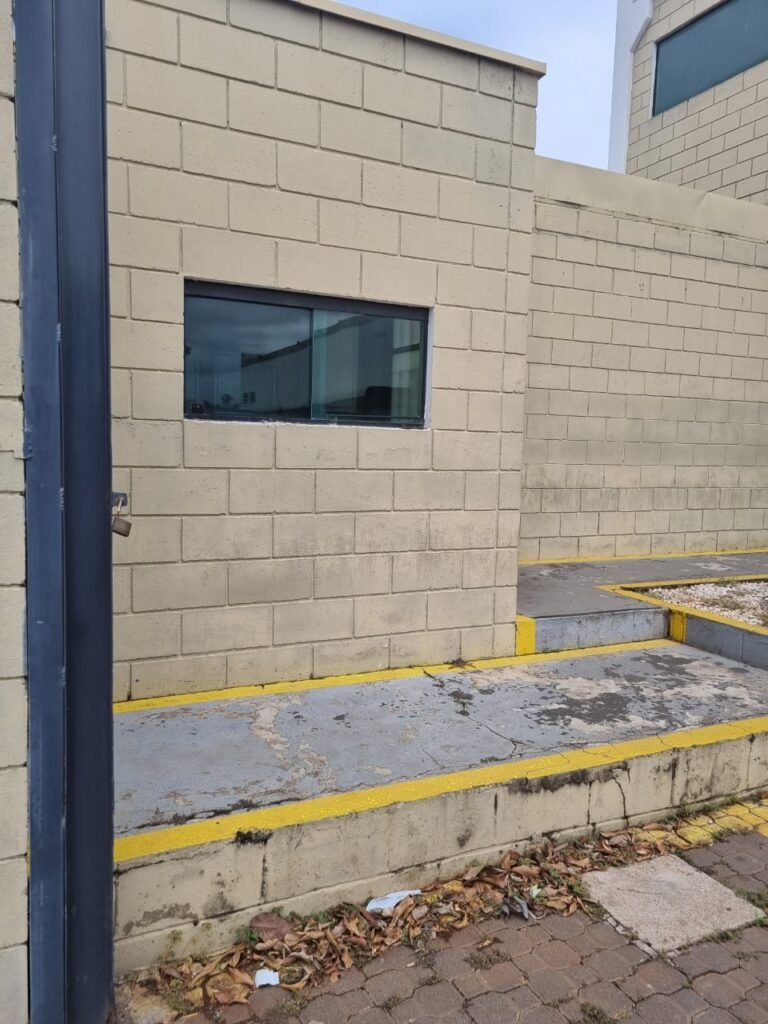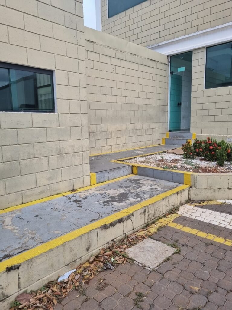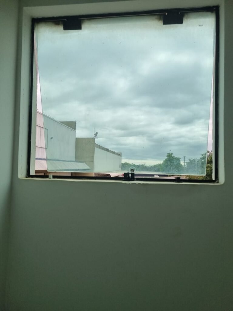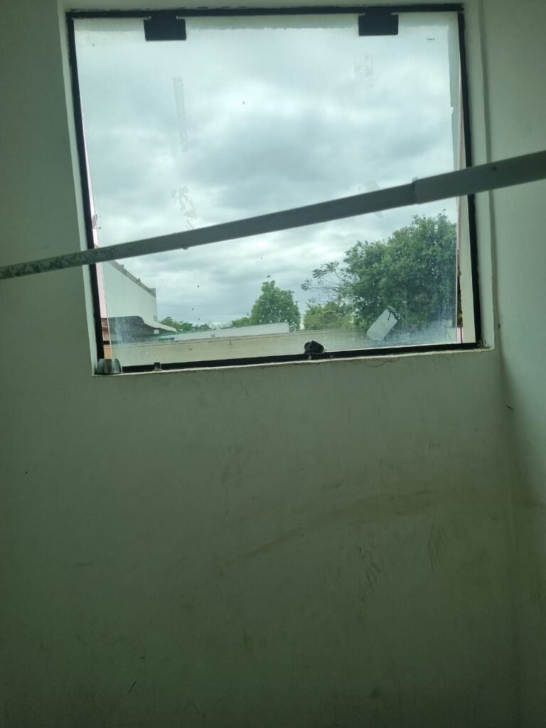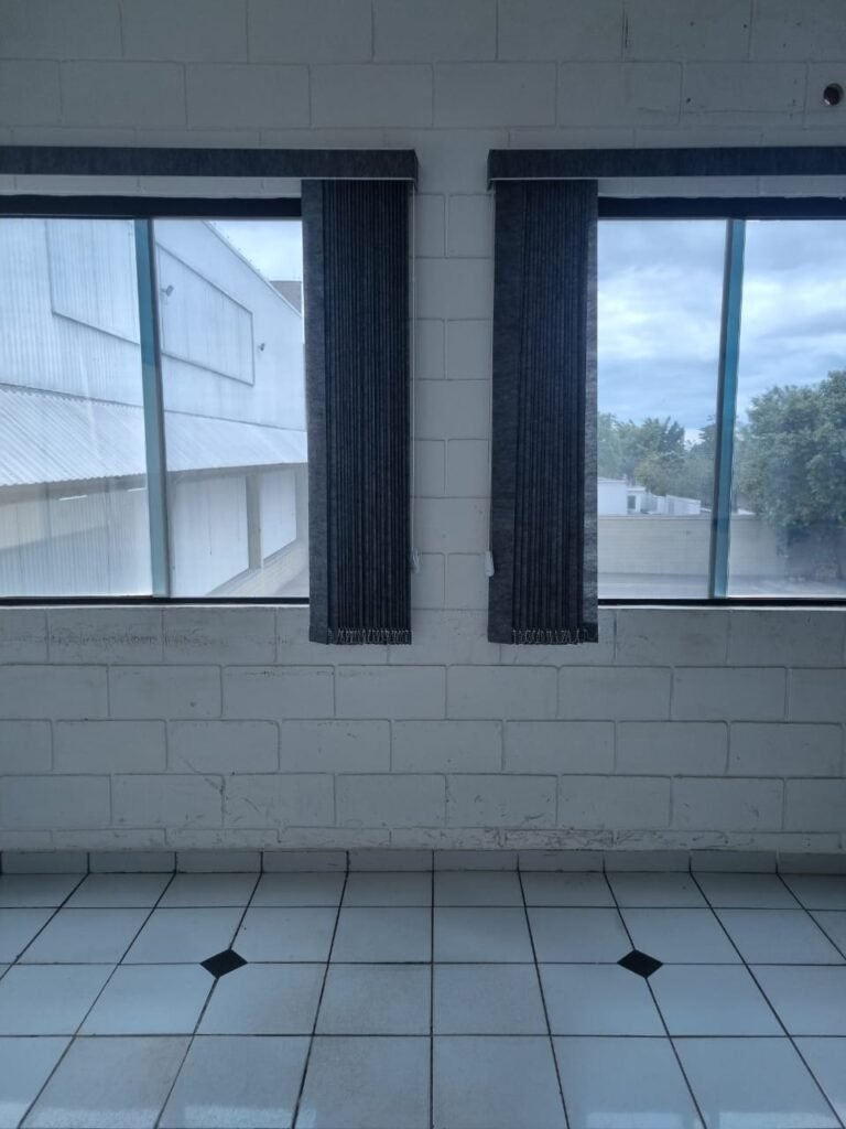 SALA ADMINISTRATIVO:- Piso frio cerâmico, paredes de bloco aparente parte com pintura branco claro e parte na cor branco com manchas e desgaste, teto e gola de gesso com pintura na cor branco neve, 05 vitrô de correr com fechadura e chaves em ordem, 02 buracos para ar condicionado, instalação elétrica por conduletes em ordem, 01 lâmpada de emergência em ordem, porta de madeira em ordem, maçanetas em ordem, fechadura sem chave, 08lâmpadas de LED, caixa de disjuntores com 09 disjuntores GE em ordem, 01 interruptor solto, 03 persianas verticais na cor cinza em ordem.
