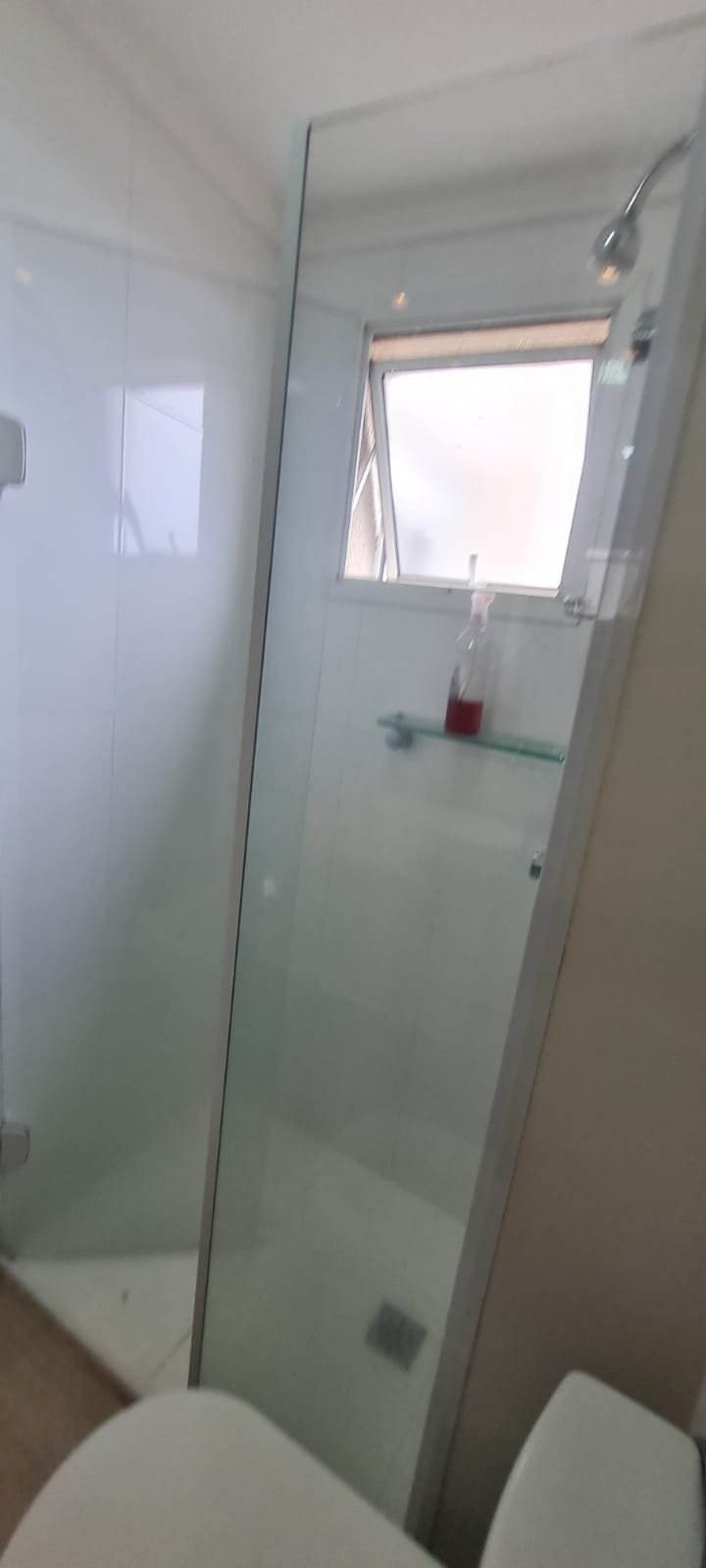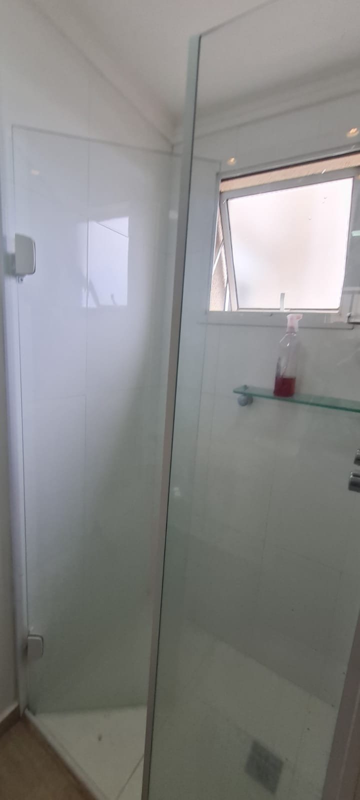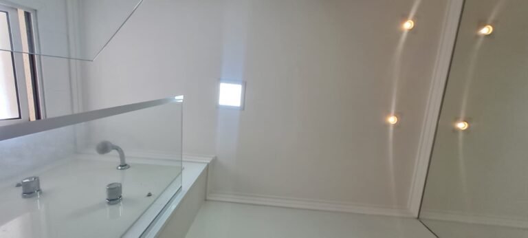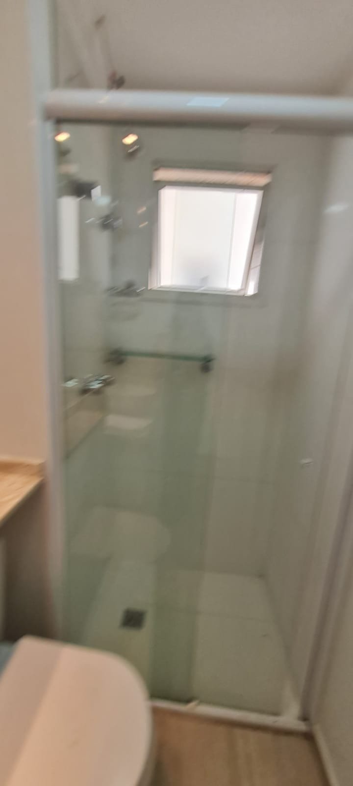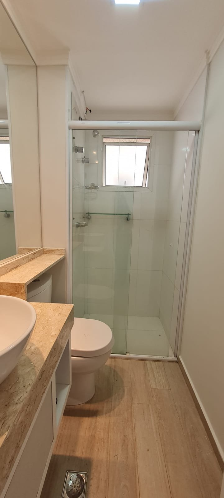 WC Suíte:- Porta de madeira com a pintura na cor branco em ordem, guarnição em ambos os lados em ordem, maçaneta em ordem, dobradiças em ordem, chave embutida em ordem, Piso porcelanato mesclado em ordem, rodapés piso porcelanato em ordem, filete de soleira em granito Travertino em ordem, paredes recém-pintadas na cor branco gelo em ordem, teto com a pintura na cor branco neve em ordem, gola de gesso com a pintura na cor branco neve em ordem, 01 luminária embutida de led em ordem, 02 spot embutidos com lâmpada dicroica em ordem, Pia em granito em granito Travertino com frontão em ordem, 01 cuba de sobrepor Elite em ordem, válvula em ordem, 01 sifão desentupido em ordem, 01 tampinha em ordem, 01 torneira de pia bica alta cromada marca roca em ordem, um armário embutido em madeira MDF contendo 01 porta em MDF linho couro com um lascado na lateral o restante em ordem, 02 dobradiças em ordem, 01 pistão pneumático em ordem, 02 nichos com a lateral da parte superior lascada o restante em ordem, 02 ralos de inox desentupido em ordem, 01 espelho lapidado em ordem, 01 porta papel higiênico com manchas de tinta o restante em ordem, 01 porta toalhas em ordem, 01 saboneteira em ordem, 01 porta shampoo de vidro em ordem, 01 Box blidex incolor contendo 02 filhas sendo uma de abrir e 01 folha fixa em ordem, paredes do Box com revestimento cerâmico branco ate o teto na cor branco em ordem, piso em revestimento cerâmico na cor banco em ordem, 02 pisos porcelanato bege na parede do chuveiro com 04 parafusos em ordem, 04 registros Deca em ordem, 01 chuveiro de parede Deca em ordem, 01 janela basculante em alumínio com a pintura na cor branco em ordem, 01 vaso sanitário com caixa acoplada cerâmica branca da marca Celite em ordem, 01 ducha higiênica sem o suporte da parede o restante em ordem, 01 interruptor com espelho em ordem.