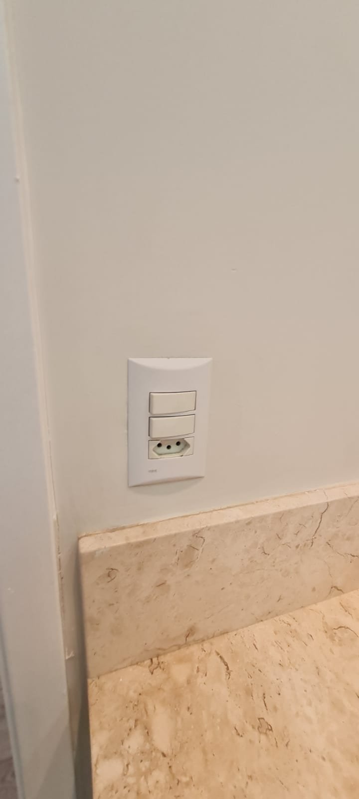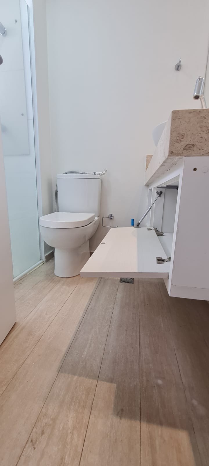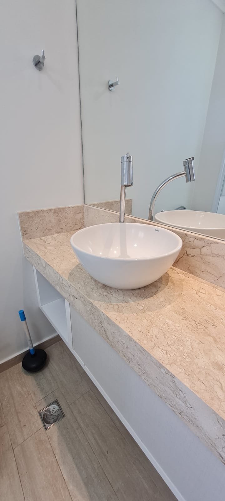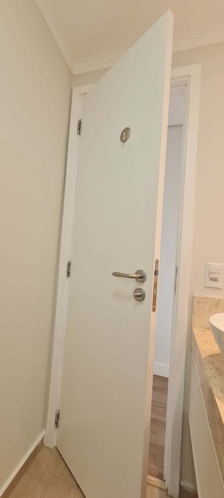 WC Suíte:- Porta de madeira com a pintura na cor branco em ordem, guarnição em ambos os lados em ordem, maçaneta em ordem, dobradiças em ordem, chave embutida em ordem, Piso porcelanato mesclado em ordem, rodapés piso porcelanato em ordem, filete de soleira em granito Travertino em ordem, paredes recém-pintadas na cor branco gelo em ordem, teto com a pintura na cor branco neve em ordem, gola de gesso com a pintura na cor branco neve em ordem, 01 luminária embutida de led em ordem, 02 spot embutidos com lâmpada dicroica em ordem, Pia em granito em granito Travertino com frontão em ordem, 01 cuba de sobrepor Elite em ordem, válvula em ordem, 01 sifão desentupido em ordem, 01 tampinha em ordem, 01 torneira de pia bica alta cromada marca roca em ordem, um armário embutido em madeira MDF contendo 01 porta em MDF linho couro com um lascado na lateral o restante em ordem, 02 dobradiças em ordem, 01 pistão pneumático em ordem, 02 nichos com a lateral da parte superior lascada o restante em ordem, 02 ralos de inox desentupido em ordem, 01 espelho lapidado em ordem, 01 porta papel higiênico com manchas de tinta o restante em ordem, 01 porta toalhas em ordem, 01 saboneteira em ordem, 01 porta shampoo de vidro em ordem, 01 Box blidex incolor contendo 02 filhas sendo uma de abrir e 01 folha fixa em ordem, paredes do Box com revestimento cerâmico branco ate o teto na cor branco em ordem, piso em revestimento cerâmico na cor banco em ordem, 02 pisos porcelanato bege na parede do chuveiro com 04 parafusos em ordem, 04 registros Deca em ordem, 01 chuveiro de parede Deca em ordem, 01 janela basculante em alumínio com a pintura na cor branco em ordem, 01 vaso sanitário com caixa acoplada cerâmica branca da marca Celite em ordem, 01 ducha higiênica sem o suporte da parede o restante em ordem, 01 interruptor com espelho em ordem.