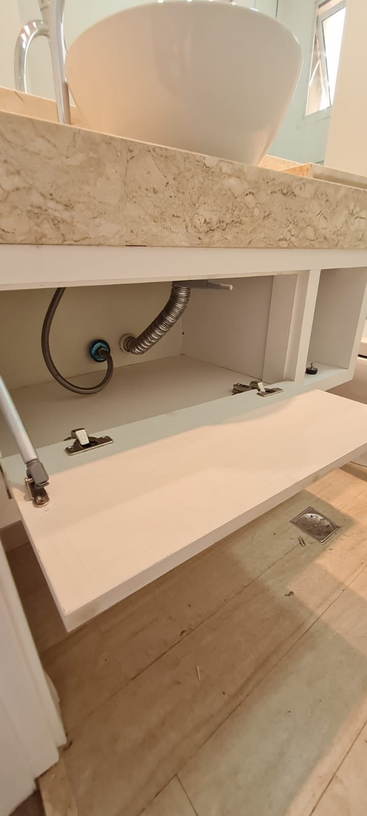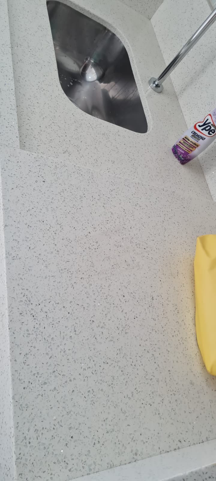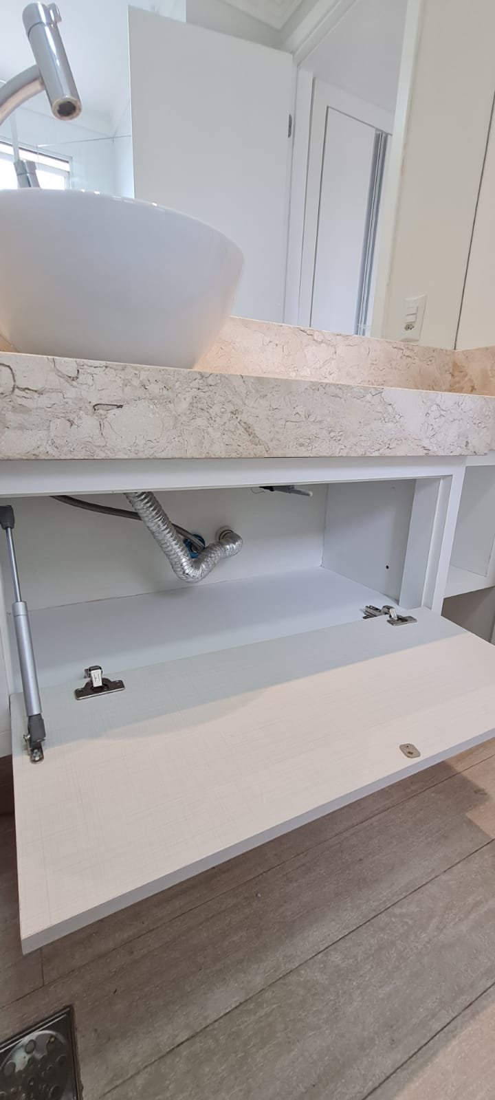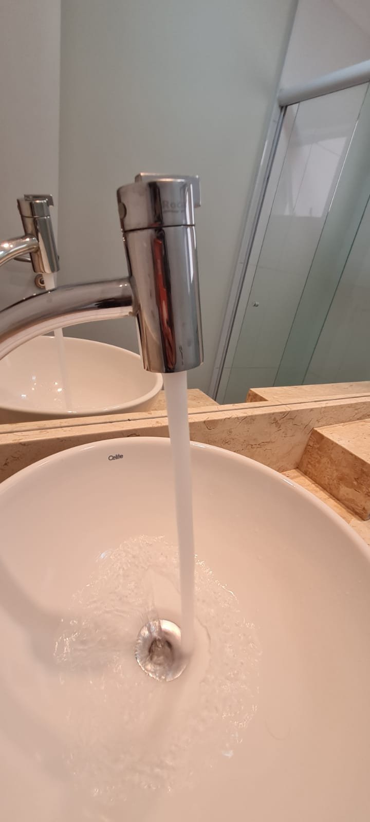 WC Suíte:- Porta de madeira com a pintura na cor branco em ordem, guarnição em ambos os lados em ordem, maçaneta em ordem, dobradiças em ordem, chave embutida em ordem, Piso porcelanato mesclado em ordem, rodapés piso porcelanato em ordem, filete de soleira em granito Travertino em ordem, paredes recém-pintadas na cor branco gelo em ordem, teto com a pintura na cor branco neve em ordem, gola de gesso com a pintura na cor branco neve em ordem, 01 luminária embutida de led em ordem, 02 spot embutidos com lâmpada dicroica em ordem, Pia em granito em granito Travertino com frontão em ordem, 01 cuba de sobrepor Elite em ordem, válvula em ordem, 01 sifão desentupido em ordem, 01 tampinha em ordem, 01 torneira de pia bica alta cromada marca roca em ordem, um armário embutido em madeira MDF contendo 01 porta em MDF linho couro com um lascado na lateral o restante em ordem, 02 dobradiças em ordem, 01 pistão pneumático em ordem, 02 nichos com a lateral da parte superior lascada o restante em ordem, 02 ralos de inox desentupido em ordem, 01 espelho lapidado em ordem, 01 porta papel higiênico com manchas de tinta o restante em ordem, 01 porta toalhas em ordem, 01 saboneteira em ordem, 01 porta shampoo de vidro em ordem, 01 Box blidex incolor contendo 02 filhas sendo uma de abrir e 01 folha fixa em ordem, paredes do Box com revestimento cerâmico branco ate o teto na cor branco em ordem, piso em revestimento cerâmico na cor banco em ordem, 02 pisos porcelanato bege na parede do chuveiro com 04 parafusos em ordem, 04 registros Deca em ordem, 01 chuveiro de parede Deca em ordem, 01 janela basculante em alumínio com a pintura na cor branco em ordem, 01 vaso sanitário com caixa acoplada cerâmica branca da marca Celite em ordem, 01 ducha higiênica sem o suporte da parede o restante em ordem, 01 interruptor com espelho em ordem.