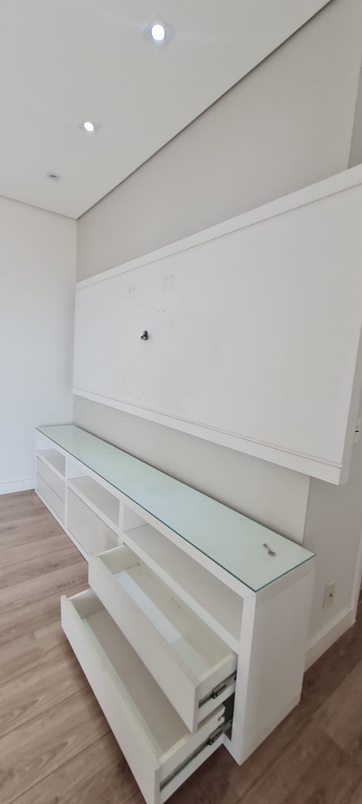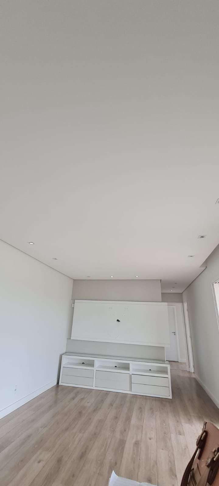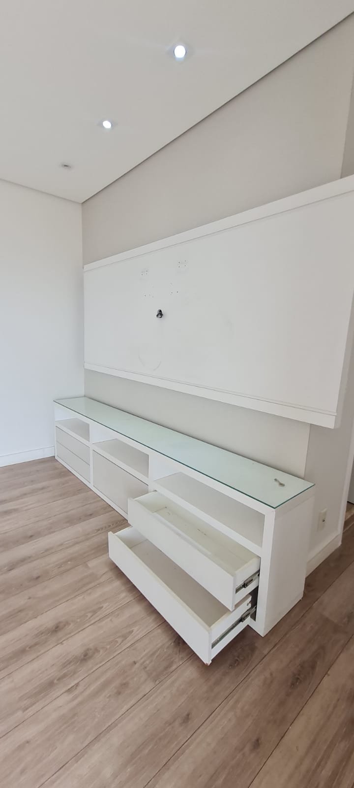 Sala:- Piso laminado de madeira mesclado em ordem, rodapés com manchas de sujeira o restante em ordem, paredes com a pintura nova na cor branco gelo em ordem, teto com a pintura nova na cor branco neve em ordem, gola de gesso em ordem, sanca de gesso em ordem, painel de tv em madeira MDF com a pintura na cor branco com manchas de sujeira o restante me ordem, rack de tv contendo 06 gavetas de correr com manchas de sujeira e emperrando o restante em ordem, película de vidro para proteção do rack em ordem, suporte de madeira para apoio das chaves na cor branco em ordem, interfone Intel Brás em ordem, 05 espelhos de luz sendo dois cegos, 03 interruptores de luz, 12 spot embutido contendo 07 queimados o restante em ordem,