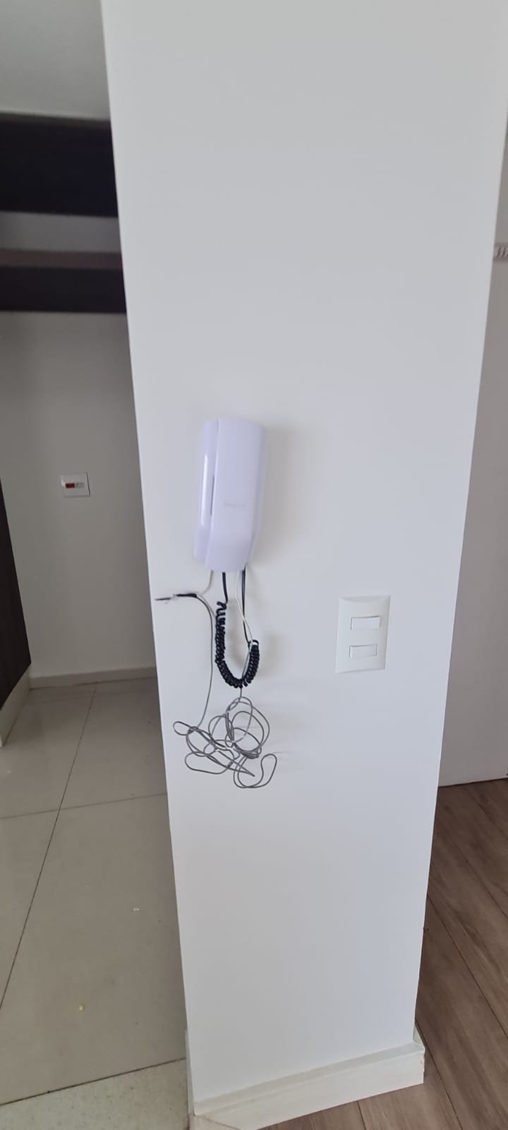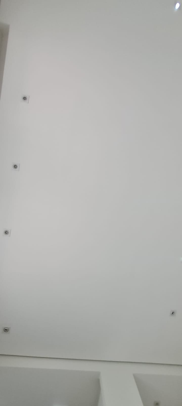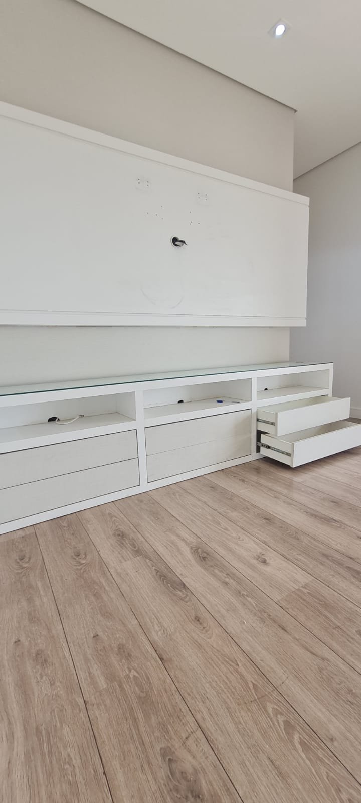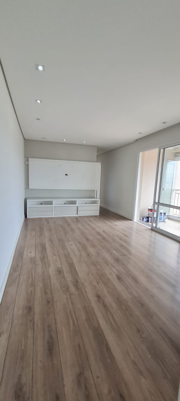 Sala:- Piso laminado de madeira mesclado em ordem, rodapés com manchas de sujeira o restante em ordem, paredes com a pintura nova na cor branco gelo em ordem, teto com a pintura nova na cor branco neve em ordem, gola de gesso em ordem, sanca de gesso em ordem, painel de tv em madeira MDF com a pintura na cor branco com manchas de sujeira o restante me ordem, rack de tv contendo 06 gavetas de correr com manchas de sujeira e emperrando o restante em ordem, película de vidro para proteção do rack em ordem, suporte de madeira para apoio das chaves na cor branco em ordem, interfone Intel Brás em ordem, 05 espelhos de luz sendo dois cegos, 03 interruptores de luz, 12 spot embutido contendo 07 queimados o restante em ordem,