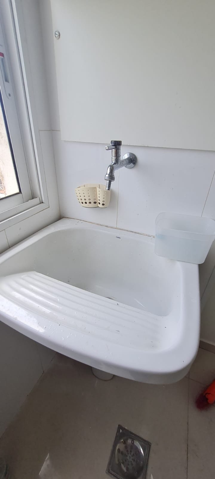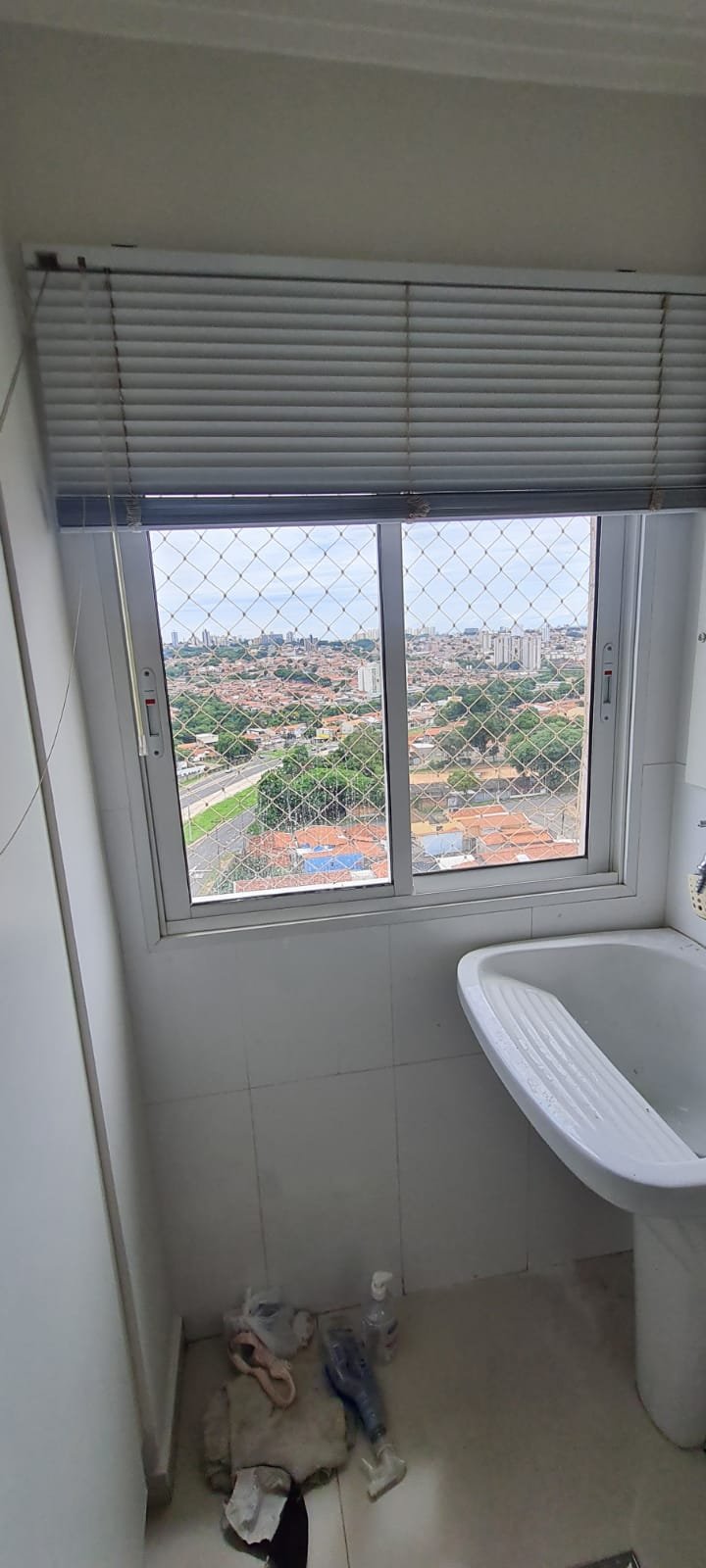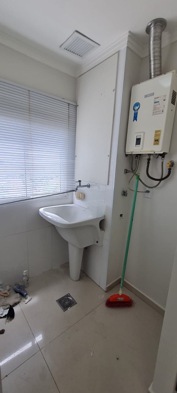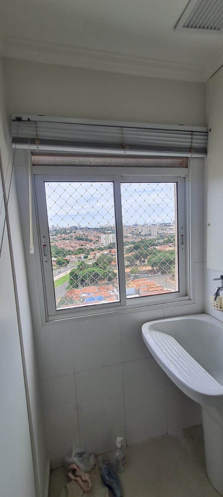 Lavanderia:- Piso cerâmico na cor branco em ordem, rodapés cerâmicos em ordem, paredes com a pintura na cor branco em ordem, parede da janela e do tanque com revestimento cerâmico na cor branco em ordem, gola de gesso recém pintada na cor branco com teto com a pintura na cor branco neve em ordem, um armário embutido em madeira MDF com a pintura na cor branco em ordem, puxadores embutidos em ordem, 05 prateleiras em ordem, um suporte fixado no armário em ordem, um gaveteiro em ordem, 04 dobradiças em ordem, uma janela de correr alumínio pintado branco blackout linha Lidinese com 02 folhas de vidro faltando às travas e enroscando o restante em ordem, uma persiana com a trava quebrada restante em ordem, um tanque de cerâmica branca Celite em ordem, uma torneira de rosca em ordem, um ralo de inox desentupido ordem, um porta sabão embutido em ordem, caixa de disjuntores com 09 disjuntores Steck sendo 01 disjuntor geral, 07 disjuntores unipolar e 01 disjuntor bipolar, uma porta em alumínio com a pintura na cor branco contendo duas folhas de vidro chaves em ordem, 0.