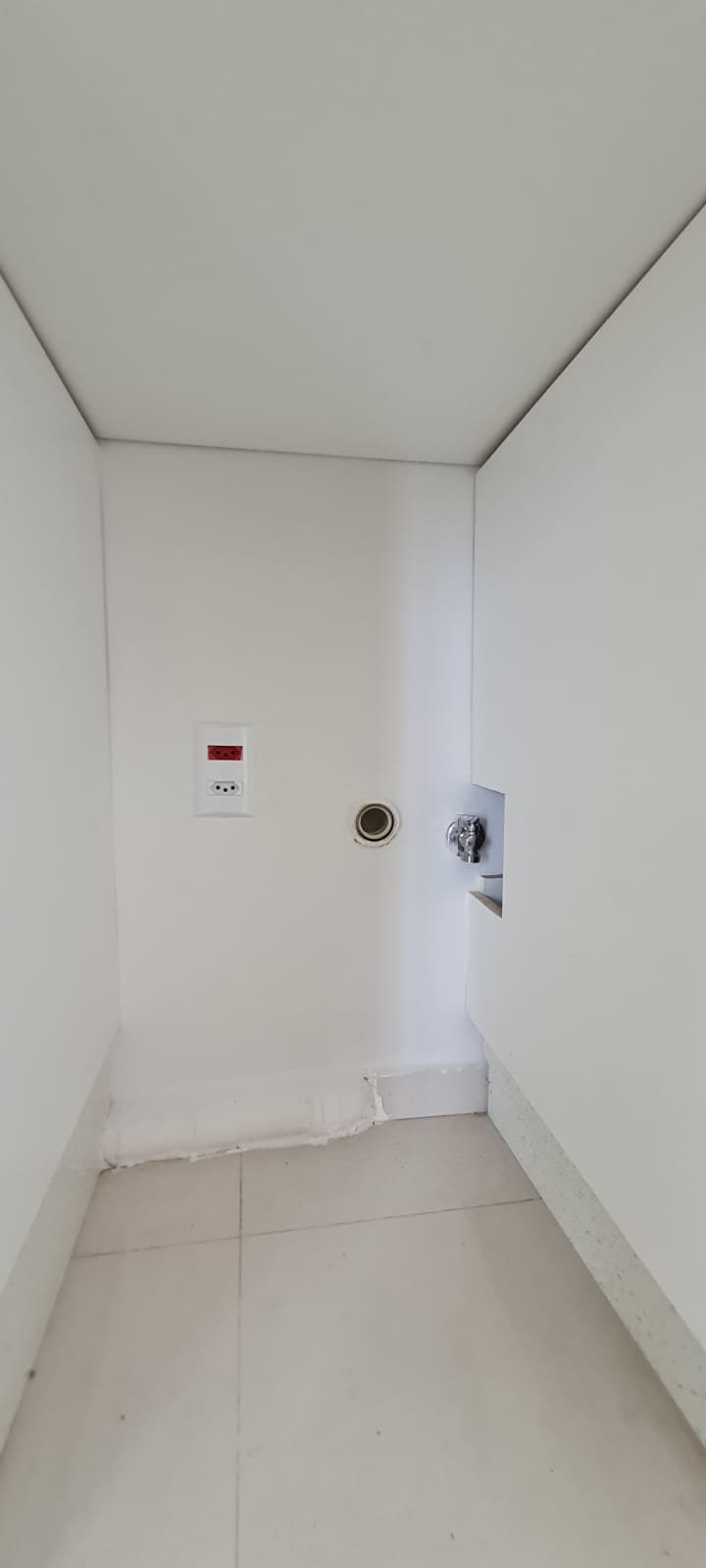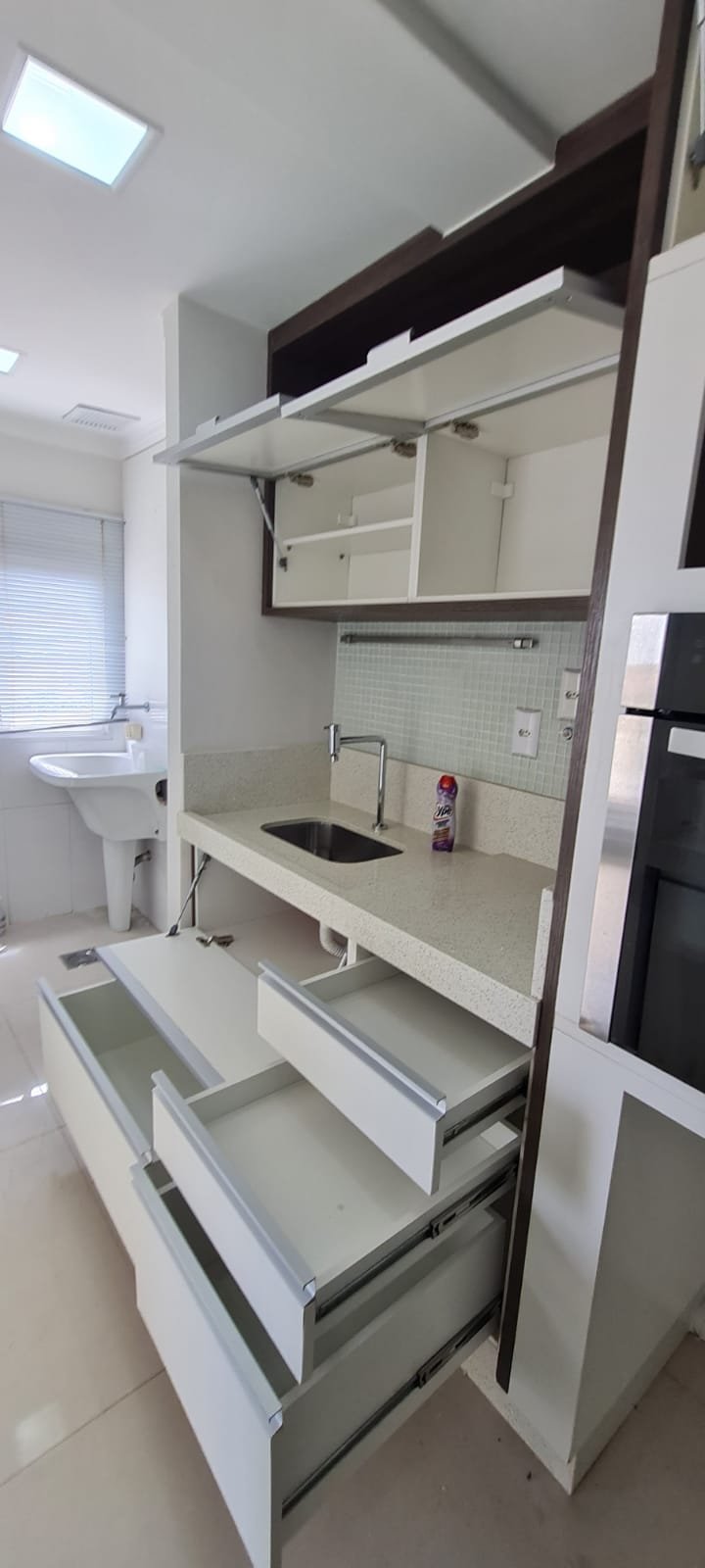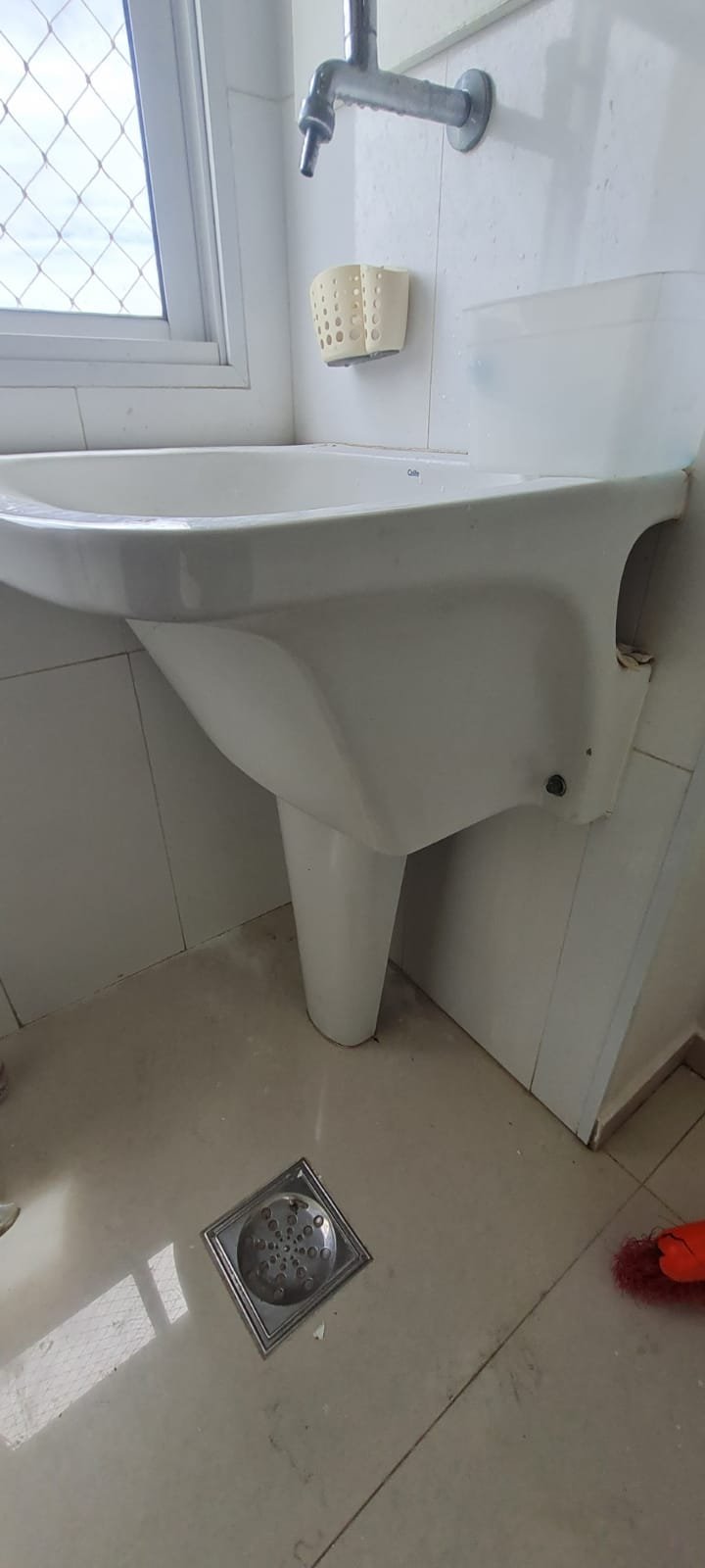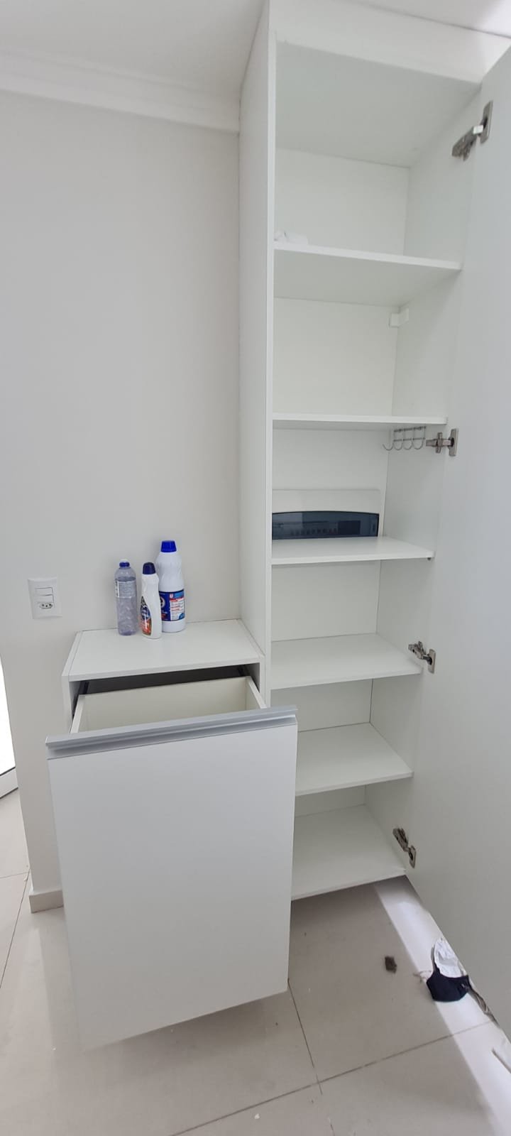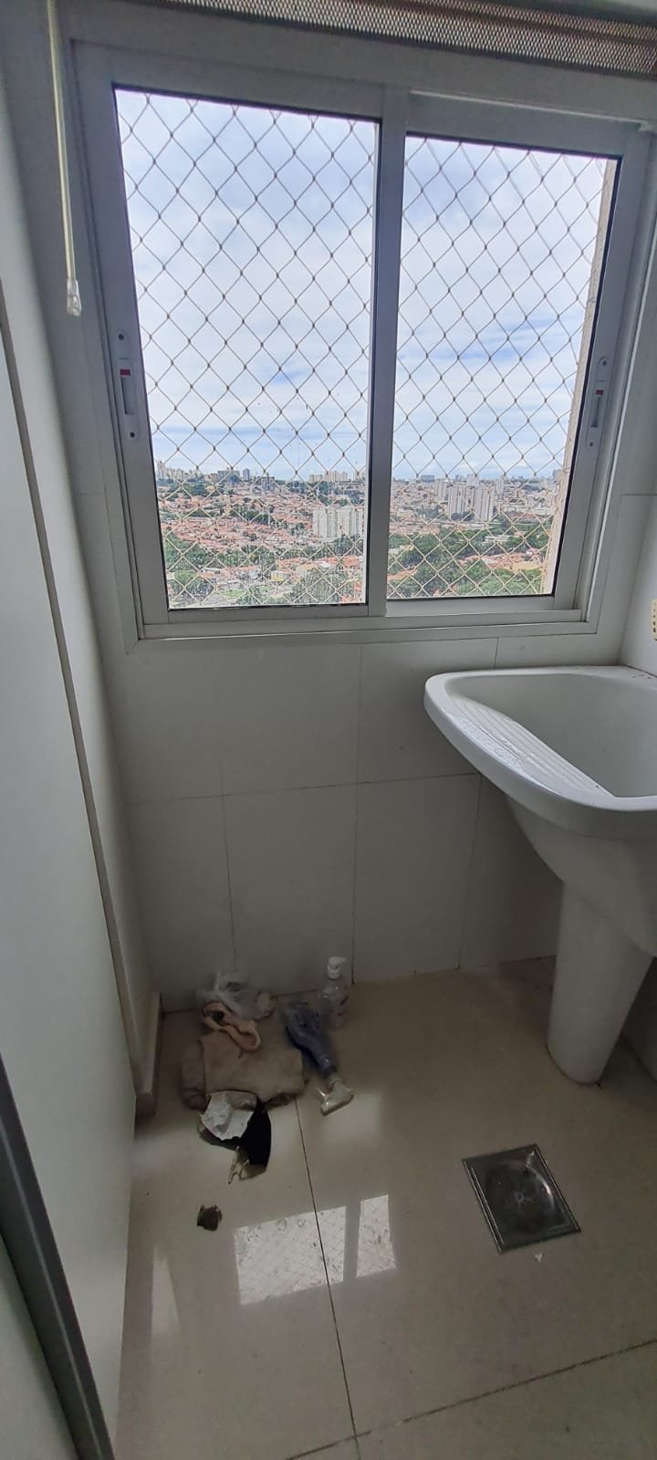 Lavanderia:- Piso cerâmico na cor branco em ordem, rodapés cerâmicos em ordem, paredes com a pintura na cor branco em ordem, parede da janela e do tanque com revestimento cerâmico na cor branco em ordem, gola de gesso recém pintada na cor branco com teto com a pintura na cor branco neve em ordem, um armário embutido em madeira MDF com a pintura na cor branco em ordem, puxadores embutidos em ordem, 05 prateleiras em ordem, um suporte fixado no armário em ordem, um gaveteiro em ordem, 04 dobradiças em ordem, uma janela de correr alumínio pintado branco blackout linha Lidinese com 02 folhas de vidro faltando às travas e enroscando o restante em ordem, uma persiana com a trava quebrada restante em ordem, um tanque de cerâmica branca Celite em ordem, uma torneira de rosca em ordem, um ralo de inox desentupido ordem, um porta sabão embutido em ordem, caixa de disjuntores com 09 disjuntores Steck sendo 01 disjuntor geral, 07 disjuntores unipolar e 01 disjuntor bipolar, uma porta em alumínio com a pintura na cor branco contendo duas folhas de vidro chaves em ordem, 0.