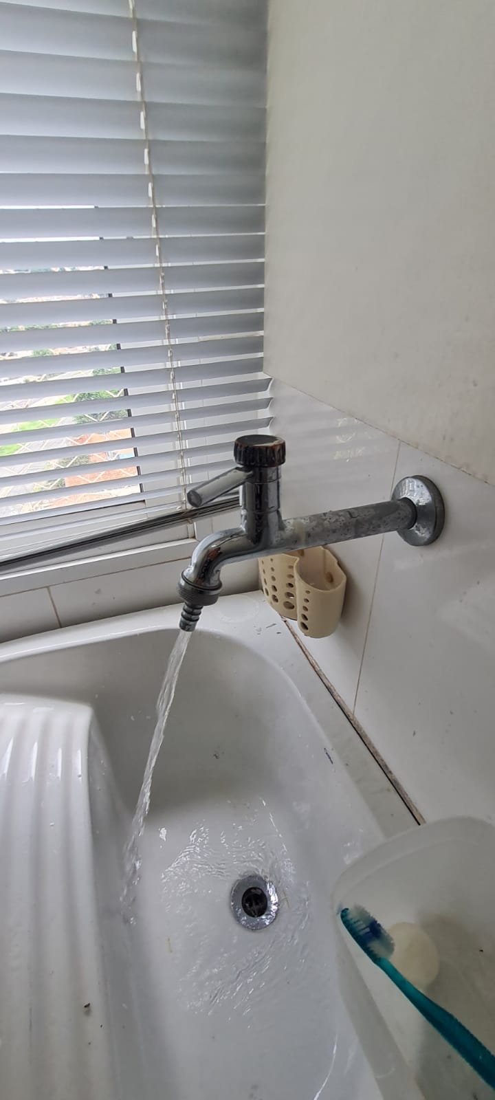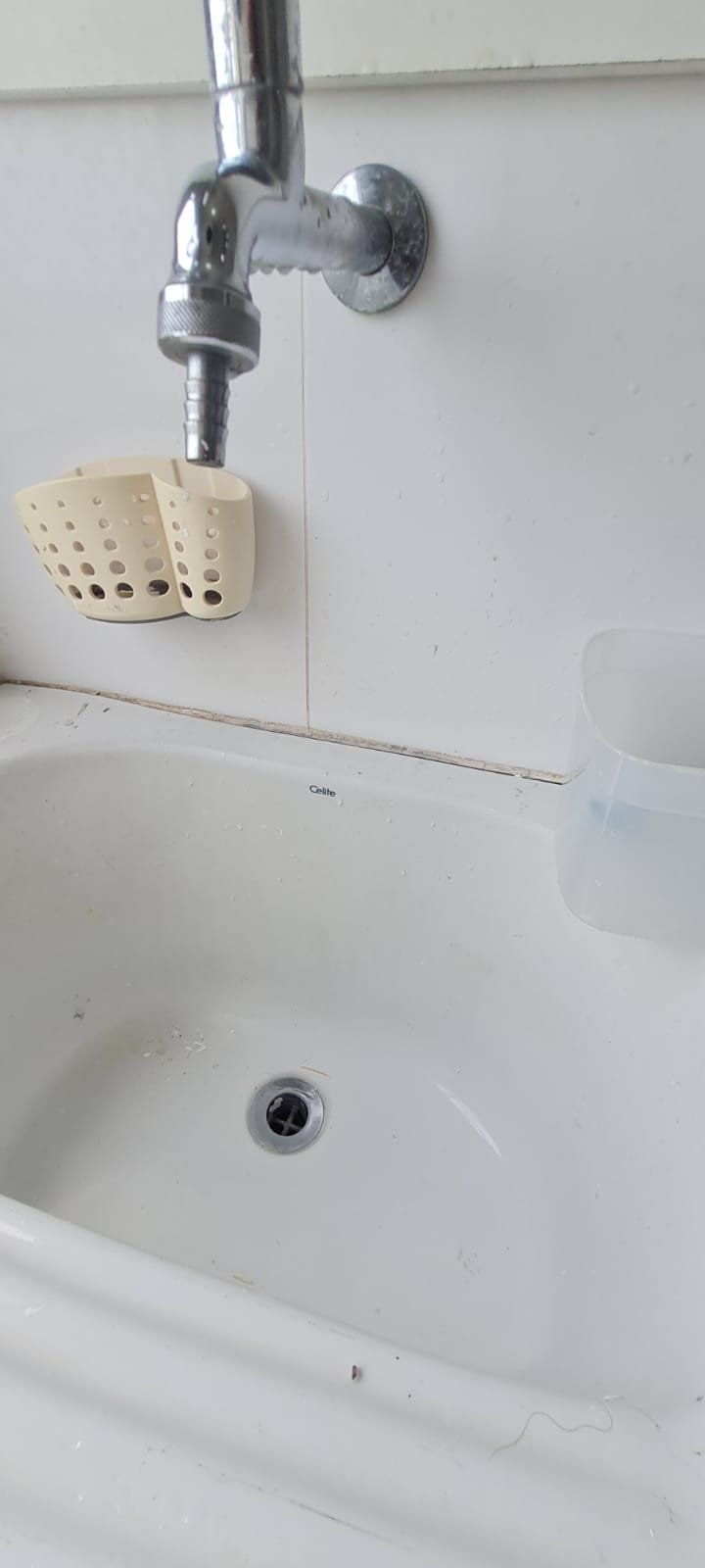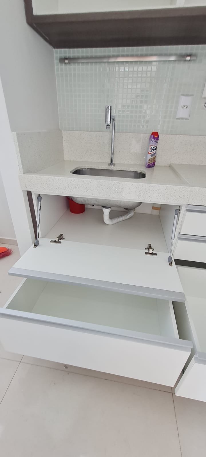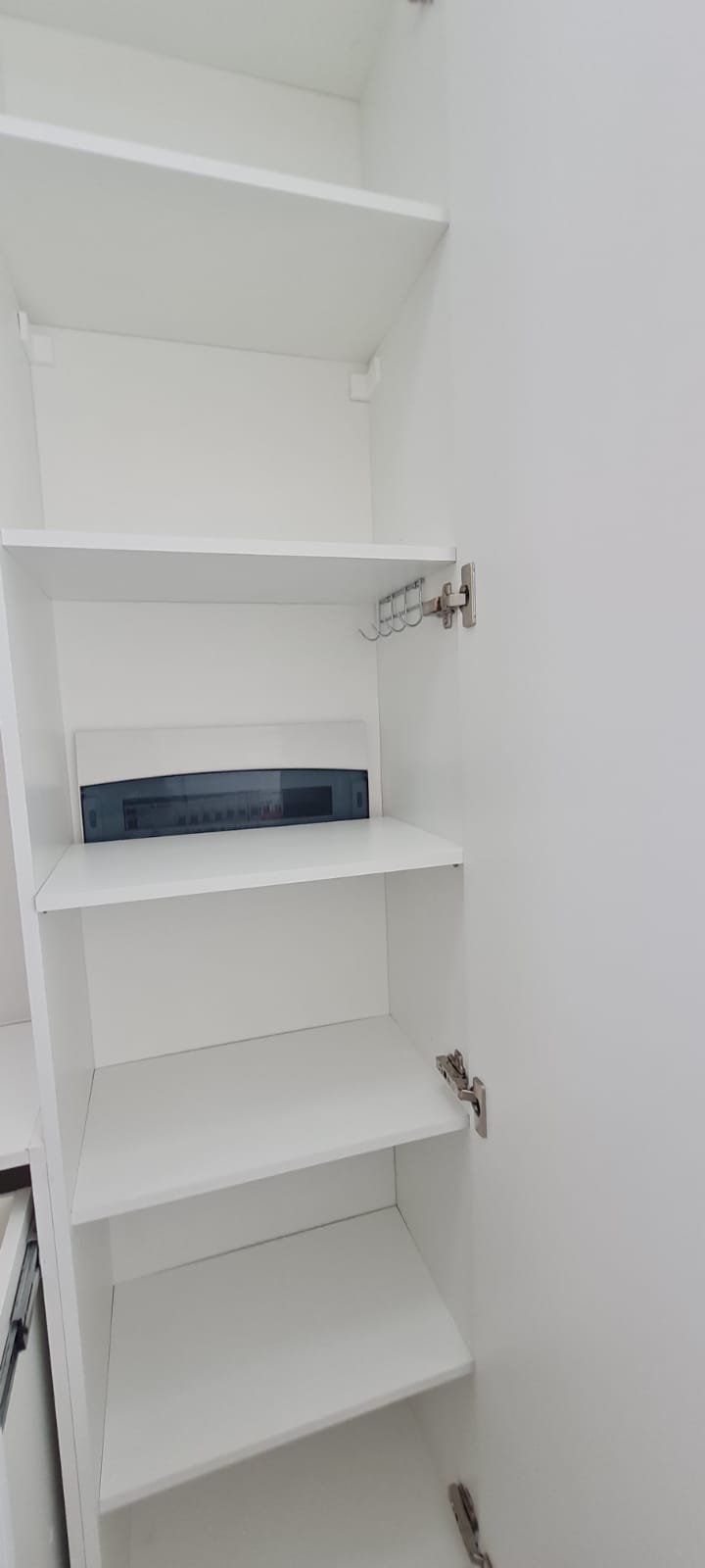 Lavanderia:- Piso cerâmico na cor branco em ordem, rodapés cerâmicos em ordem, paredes com a pintura na cor branco em ordem, parede da janela e do tanque com revestimento cerâmico na cor branco em ordem, gola de gesso recém pintada na cor branco com teto com a pintura na cor branco neve em ordem, um armário embutido em madeira MDF com a pintura na cor branco em ordem, puxadores embutidos em ordem, 05 prateleiras em ordem, um suporte fixado no armário em ordem, um gaveteiro em ordem, 04 dobradiças em ordem, uma janela de correr alumínio pintado branco blackout linha Lidinese com 02 folhas de vidro faltando às travas e enroscando o restante em ordem, uma persiana com a trava quebrada restante em ordem, um tanque de cerâmica branca Celite em ordem, uma torneira de rosca em ordem, um ralo de inox desentupido ordem, um porta sabão embutido em ordem, caixa de disjuntores com 09 disjuntores Steck sendo 01 disjuntor geral, 07 disjuntores unipolar e 01 disjuntor bipolar, uma porta em alumínio com a pintura na cor branco contendo duas folhas de vidro chaves em ordem, 0.