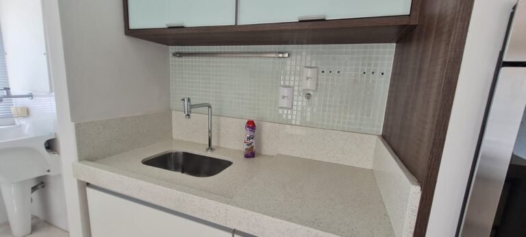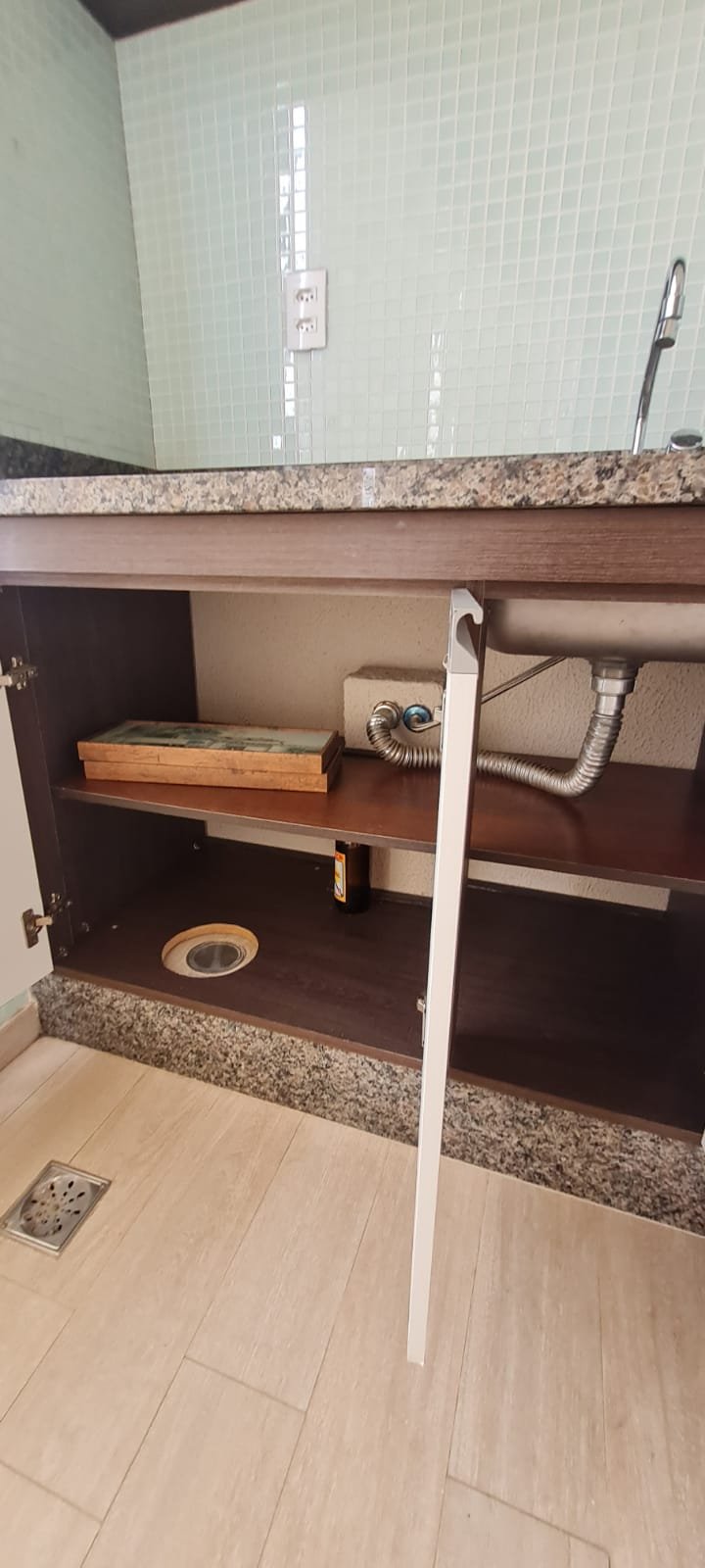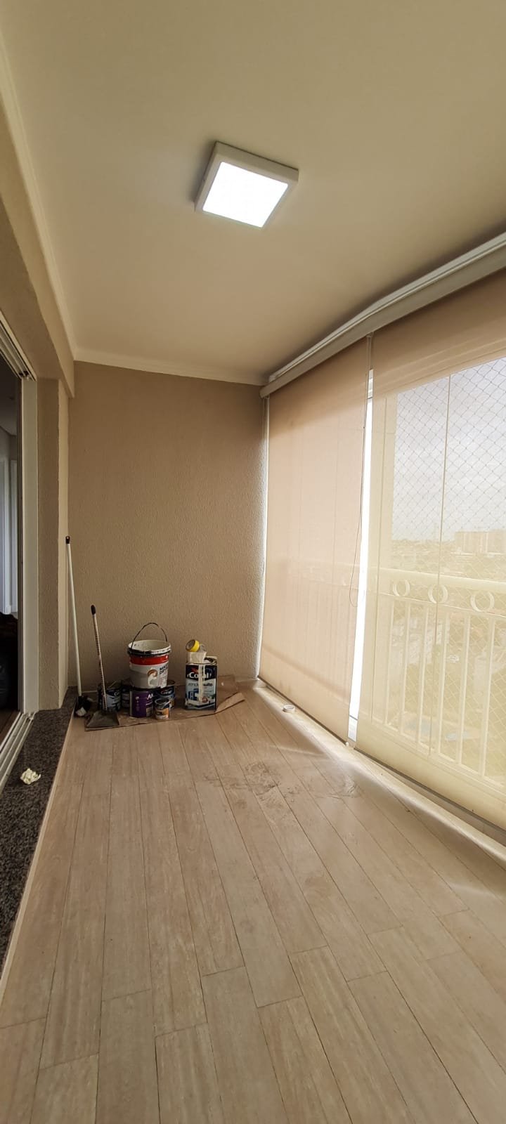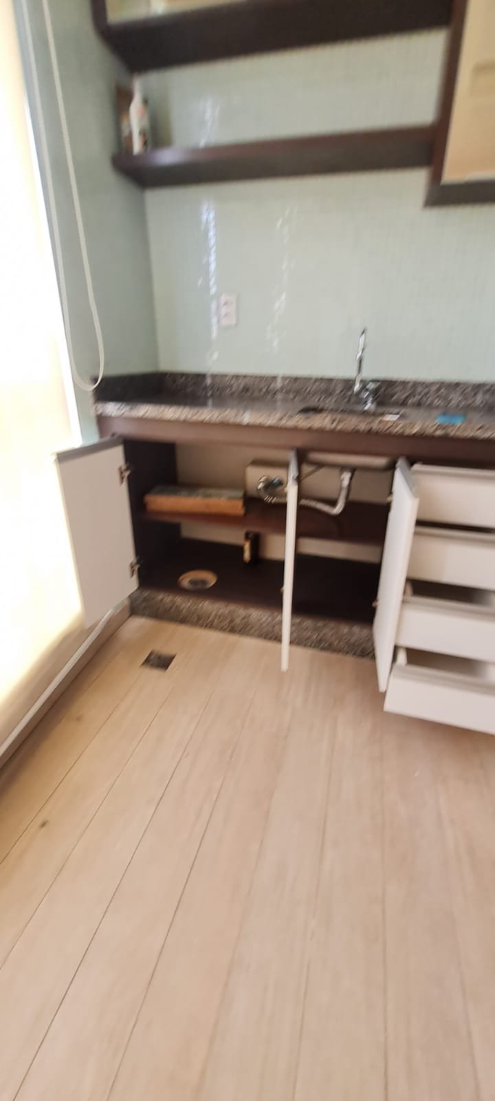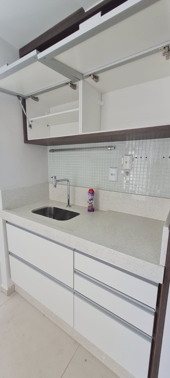 Sacada Gourmet:- Piso porcelanato em ordem, rodapés em ordem, soleira em mármore cinza Corumbá em ordem, paredes recém-pintadas com grafito na cor areia em ordem, teto com a pintura na cor branco neve em ordem, gola de gesso com a pintura na cor branco neve em ordem, um plafon embutido em ordem, uma porta de correr em alumínio escovado com a pintura na cor branco em ordem, contendo 03 folhas de correr de vidro em ordem, um parapeito em ferro com a pintura na cor branco em ordem, rede de proteção em ordem, 09 folhas de vidro de correr enroscando o restante em ordem, com cortina de rolô tela solar em ordem, uma armário embutido em madeira MDF na cor, marrom com duas portas basculante de vidro jateado em ordem, 02 puxadores em ordem, 02 dobradiças em ordem, 02 pistão pneumáticos em ordem, duas prateleiras de vidro em ordem, um nicho em ordem, um gabinete embutido de pia em madeira MDF com a pintura na cor branco em ordem, puxadores embutidos em ordem, contendo uma prateleira em ordem, 04 gavetas de correr em ordem, três portas em ordem 06 dobradiças em ordem, uma pia em mármore cinza Corumbá em ordem, frontão em ordem, rodapé em ordem, torneira em ordem, cuba em ordem, sifão em ordem, ralo em inox desentupido em ordem, parede da pia com revestimento em pastilhas em ordem uma tomada com espelho em ordem.