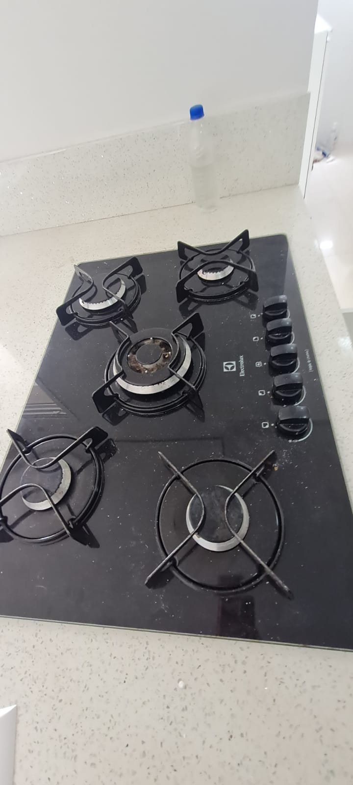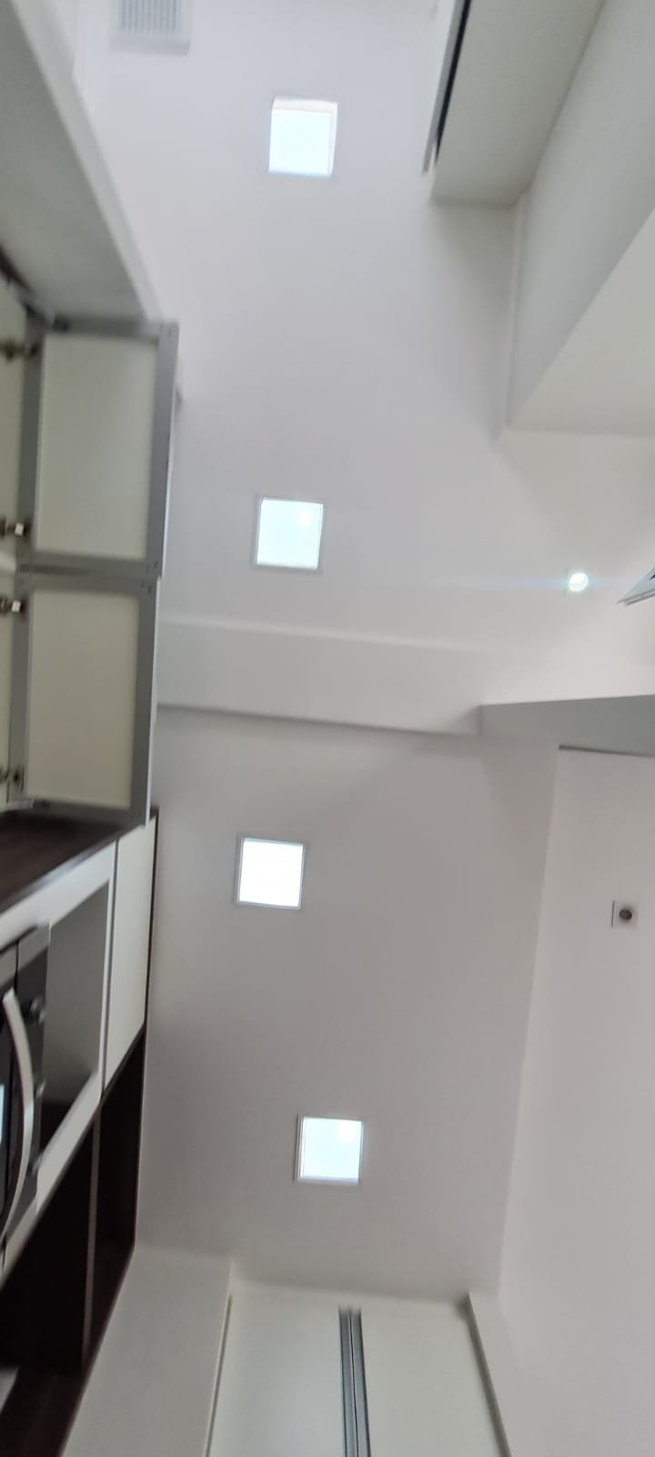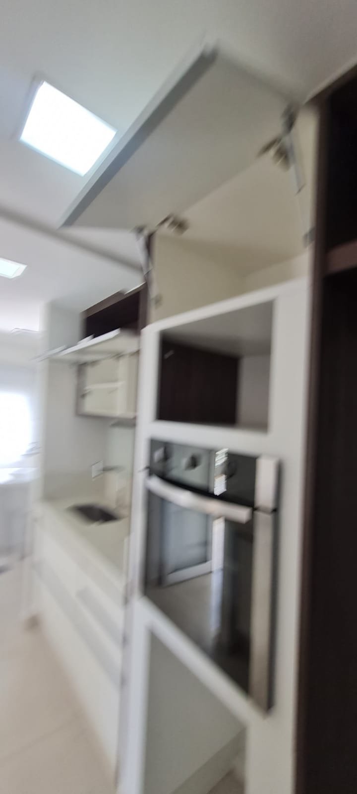 Cozinha:- Piso cerâmico na cor branco em ordem, 01 filete na entrada da cozinha em piso laminado mesclado lascado o restante em ordem, 01 soleira em Quartzo branco em ordem, paredes com a pintura nova na cor branco gelo em ordem, teto com a pintura nova na cor branco neve em ordem, gola de gesso em ordem, sanca de gesso em ordem, 01 ilha com frontão em Quartzo branco em ordem, com revestimento cerâmico na parte interior em ordem, 01 Cooktop 05 bocas marca Electrolux em ordem, 01 forno elétrico marca Electrolux em ordem, um armário embutido em madeira MDF com a pintura na cor branco contendo duas portas em ordem, puxadores embutidos em ordem, 08 dobradiças em ordem, 04 prateleiras em ordem, armário embutido contendo dois gaveteiros de correr contendo manchas de sujeira o restante em ordem, puxadores embutidos em ordem, pia em quartzo branco com frontão, parede da pia com revestimento em pastilhas contendo dois furos o restante em ordem, 01 cuba inox em ordem, 01 torneira Deca de inox em ordem, 01 sifão sanfonado em ordem, um gabinete embutido em madeira MDF na cor branca contendo 04 gavetas com puxadores embutido em ordem, uma porta basculante com duas dobradiças em ordem, dois pistão pneumáticos em ordem, um armário embutido em madeira MDF com a pintura na cor branco contendo três portas basculantes com vidro jateado em ordem, uma prateleira em ordem, 03 puxadores em ordem, 06 dobradiças em ordem, 04 pistão pneumáticos em ordem, três nichos em madeira MDF na cor marrom em ordem, armário para geladeira em madeira MDF na cor marrom em ordem, 05 tomadas com espelho em ordem, um painel porta talheres em inox em ordem, 04 plafon embutidos em ordem,
