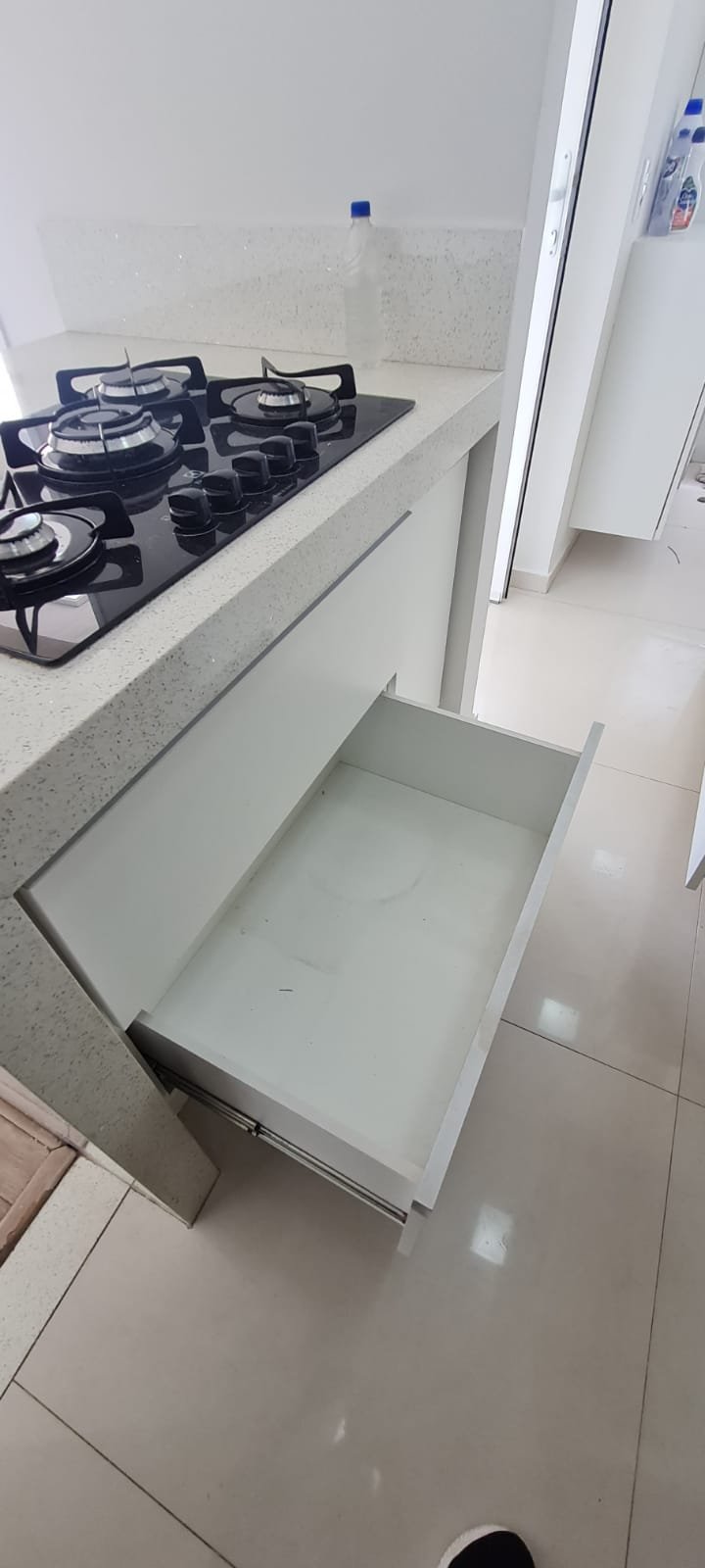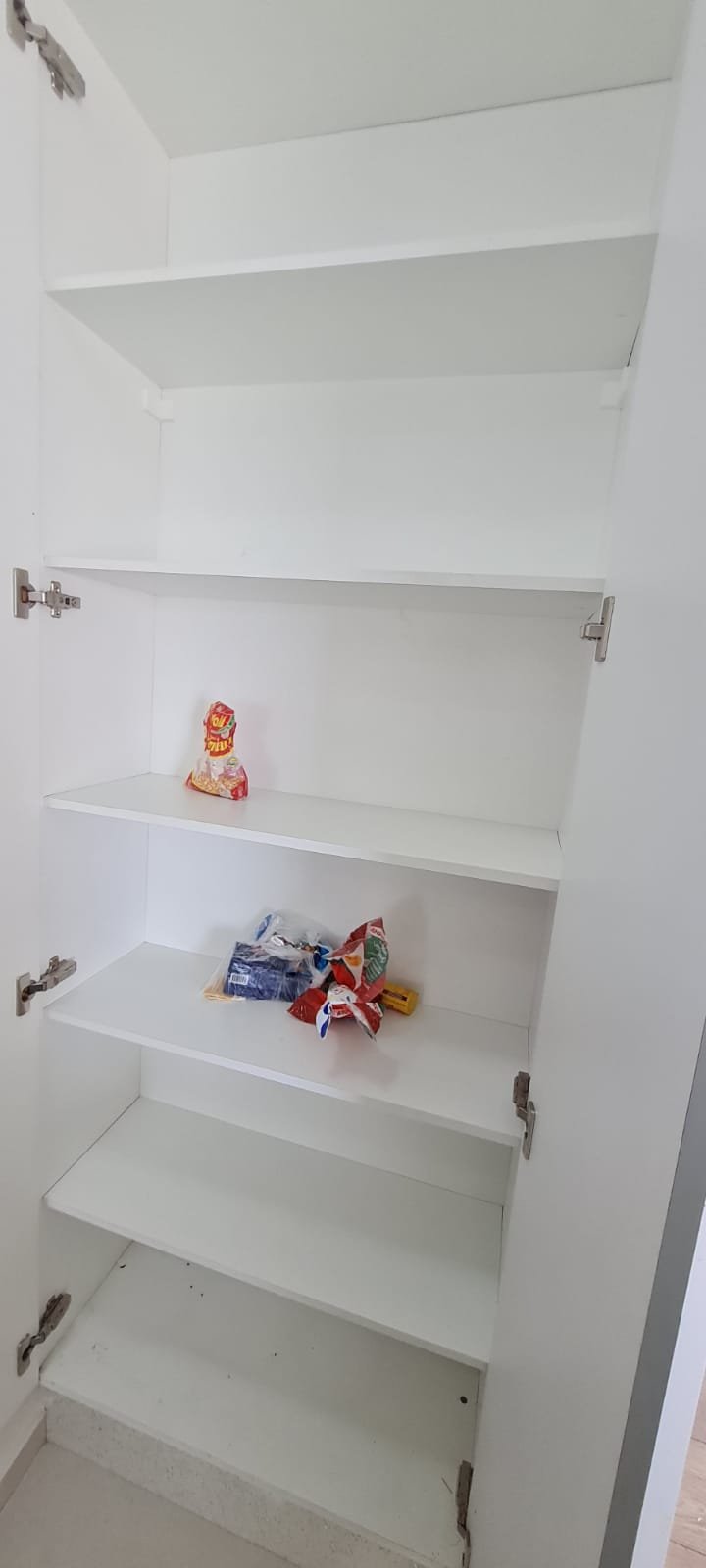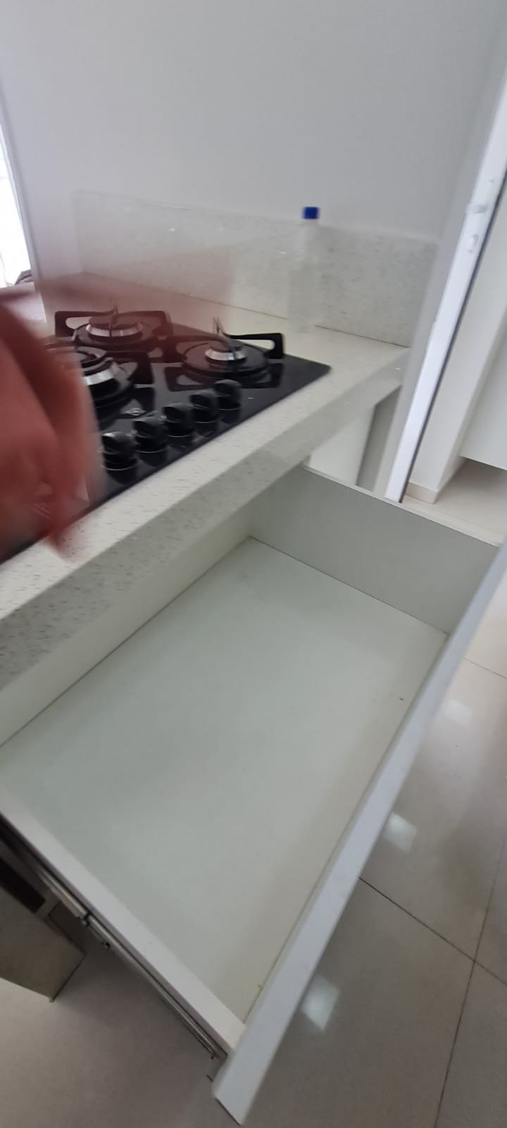 Cozinha:- Piso cerâmico na cor branco em ordem, 01 filete na entrada da cozinha em piso laminado mesclado lascado o restante em ordem, 01 soleira em Quartzo branco em ordem, paredes com a pintura nova na cor branco gelo em ordem, teto com a pintura nova na cor branco neve em ordem, gola de gesso em ordem, sanca de gesso em ordem, 01 ilha com frontão em Quartzo branco em ordem, com revestimento cerâmico na parte interior em ordem, 01 Cooktop 05 bocas marca Electrolux em ordem, 01 forno elétrico marca Electrolux em ordem, um armário embutido em madeira MDF com a pintura na cor branco contendo duas portas em ordem, puxadores embutidos em ordem, 08 dobradiças em ordem, 04 prateleiras em ordem, armário embutido contendo dois gaveteiros de correr contendo manchas de sujeira o restante em ordem, puxadores embutidos em ordem, pia em quartzo branco com frontão, parede da pia com revestimento em pastilhas contendo dois furos o restante em ordem, 01 cuba inox em ordem, 01 torneira Deca de inox em ordem, 01 sifão sanfonado em ordem, um gabinete embutido em madeira MDF na cor branca contendo 04 gavetas com puxadores embutido em ordem, uma porta basculante com duas dobradiças em ordem, dois pistão pneumáticos em ordem, um armário embutido em madeira MDF com a pintura na cor branco contendo três portas basculantes com vidro jateado em ordem, uma prateleira em ordem, 03 puxadores em ordem, 06 dobradiças em ordem, 04 pistão pneumáticos em ordem, três nichos em madeira MDF na cor marrom em ordem, armário para geladeira em madeira MDF na cor marrom em ordem, 05 tomadas com espelho em ordem, um painel porta talheres em inox em ordem, 04 plafon embutidos em ordem,