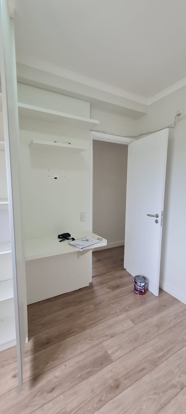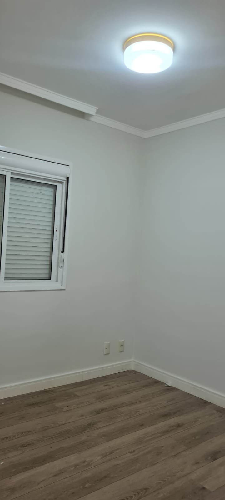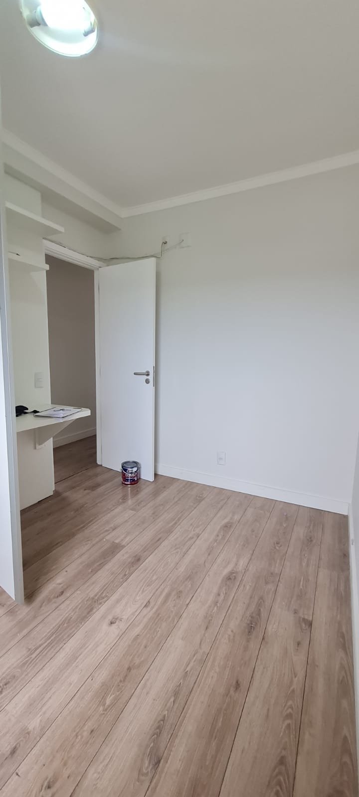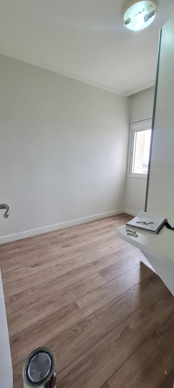 Quarto 01:- Porta de madeira com a pintura na cor branco em ordem, guarnição em ambos os lados com a pintura na cor branco em ordem, maçanetas em ordem, dobradiças em ordem, chaves em ordem, piso laminado de madeira mesclado em ordem, rodapés com manchas de sujeira o restante em ordem, paredes recém-pintadas com a pintura na cor branco gelo em ordem, gola de gesso com a pintura na cor branco neve em ordem, 01 janela com persiana integrada alumínio pintado branco blackout linha Lidinese com 02 folhas de vidro faltando às travas e enroscando o restante em ordem, sem rede de proteção o restante em ordem, guarda roupas embutido em madeira MDF na cor branco contendo 03 portas em ordem, 03 puxadores embutidos em ordem, 10 prateleiras em ordem, 12 dobradiças em ordem, 01 painel TV com duas prateleiras em ordem, 01 escrivaninha em ordem, 01 interruptor de luz com espelho em ordem, 02 interruptores de força com espelhos em ordem, 01 espelho com saída para cabo, 01 lustre tipo plafon sem a tampa com lâmpada de led em ordem, uma tampa do lustre dentro do guarda roupas.