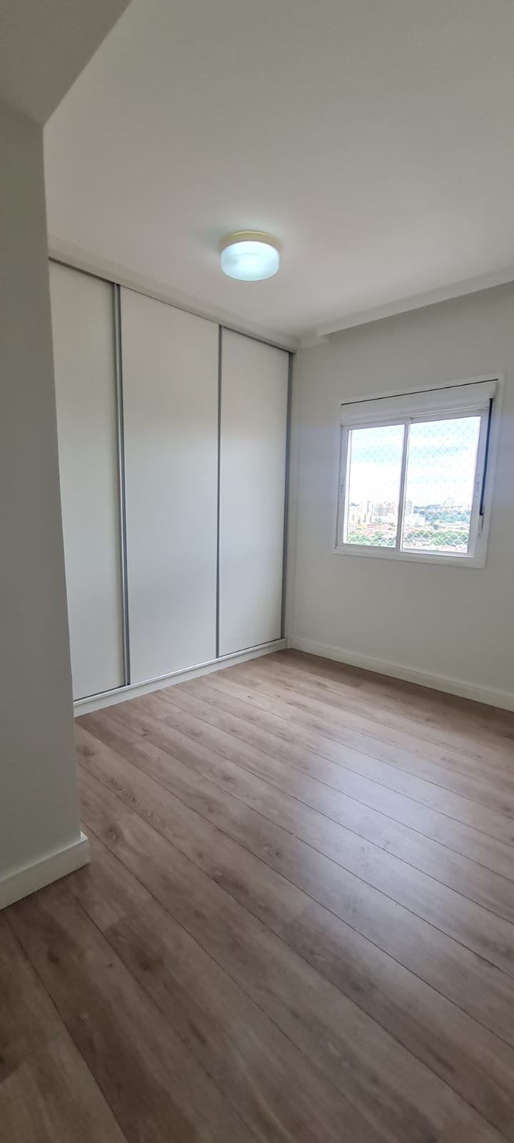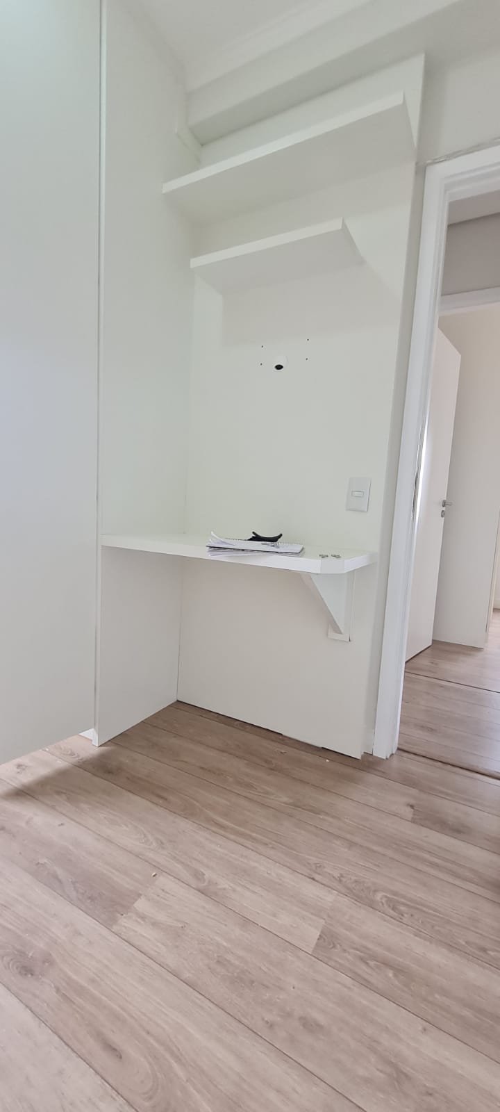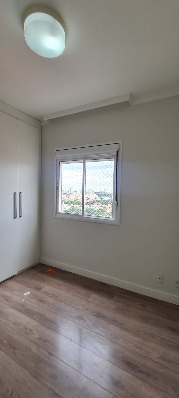Quarto 01:- Porta de madeira com a pintura na cor branco em ordem, guarnição em ambos os lados com a pintura na cor branco em ordem, maçanetas em ordem, dobradiças em ordem, chaves em ordem, piso laminado de madeira mesclado em ordem, rodapés com manchas de sujeira o restante em ordem, paredes recém-pintadas com a pintura na cor branco gelo em ordem, gola de gesso com a pintura na cor branco neve em ordem, 01 janela com persiana integrada alumínio pintado branco blackout linha Lidinese com 02 folhas de vidro faltando às travas e enroscando o restante em ordem, sem rede de proteção o restante em ordem, guarda roupas embutido em madeira MDF na cor branco contendo 03 portas em ordem, 03 puxadores embutidos em ordem, 10 prateleiras em ordem, 12 dobradiças em ordem, 01 painel TV com duas prateleiras em ordem, 01 escrivaninha em ordem, 01 interruptor de luz com espelho em ordem, 02 interruptores de força com espelhos em ordem, 01 espelho com saída para cabo, 01 lustre tipo plafon sem a tampa com lâmpada de led em ordem, uma tampa do lustre dentro do guarda roupas.