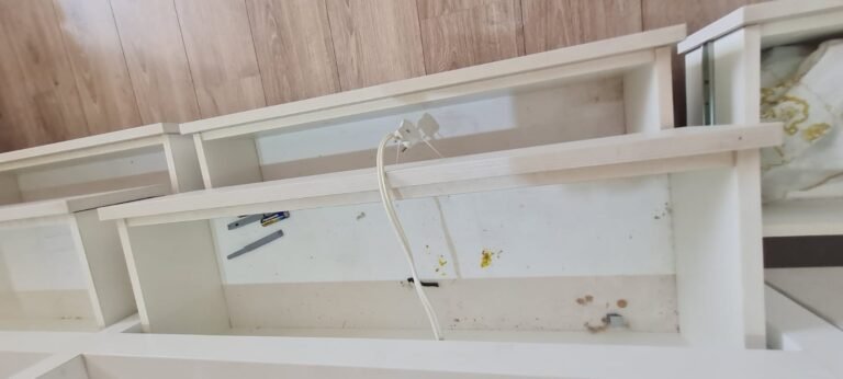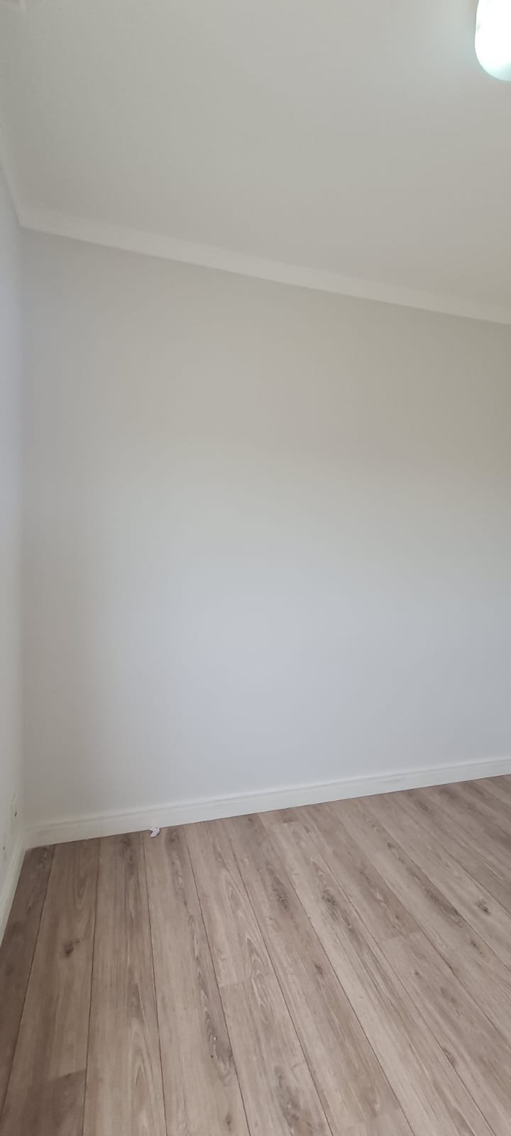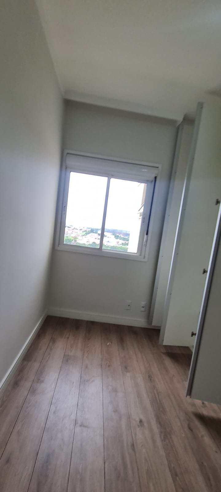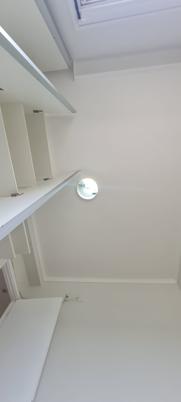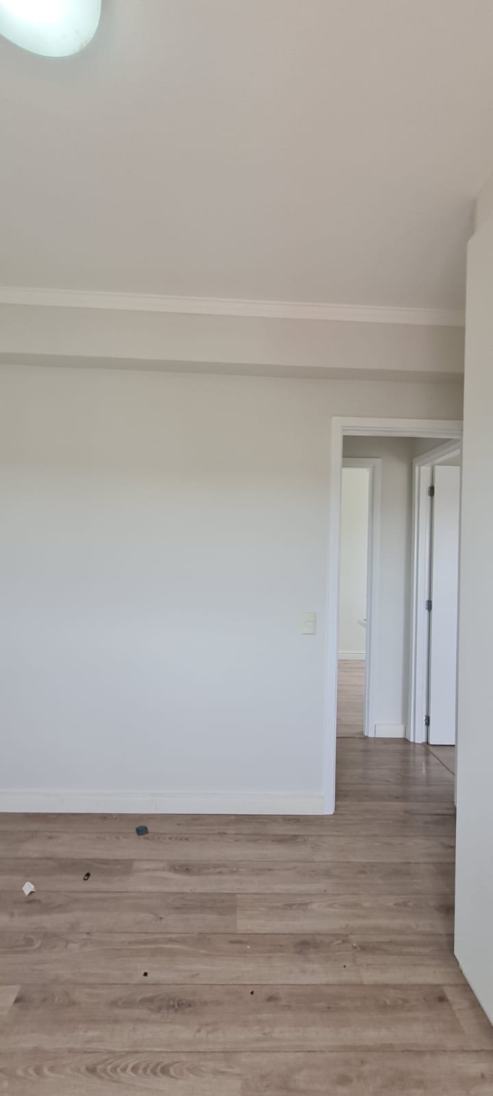 Quarto 01:- Porta de madeira com a pintura na cor branco em ordem, guarnição em ambos os lados com a pintura na cor branco em ordem, maçanetas em ordem, dobradiças em ordem, chaves em ordem, piso laminado de madeira mesclado em ordem, rodapés com manchas de sujeira o restante em ordem, paredes recém-pintadas com a pintura na cor branco gelo em ordem, gola de gesso com a pintura na cor branco neve em ordem, 01 janela com persiana integrada alumínio pintado branco blackout linha Lidinese com 02 folhas de vidro faltando às travas e enroscando o restante em ordem, sem rede de proteção o restante em ordem, guarda roupas embutido em madeira MDF na cor branco contendo 03 portas em ordem, 03 puxadores embutidos em ordem, 10 prateleiras em ordem, 12 dobradiças em ordem, 01 painel TV com duas prateleiras em ordem, 01 escrivaninha em ordem, 01 interruptor de luz com espelho em ordem, 02 interruptores de força com espelhos em ordem, 01 espelho com saída para cabo, 01 lustre tipo plafon sem a tampa com lâmpada de led em ordem, uma tampa do lustre dentro do guarda roupas.