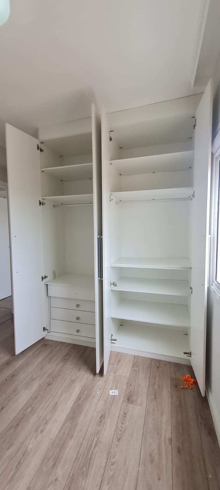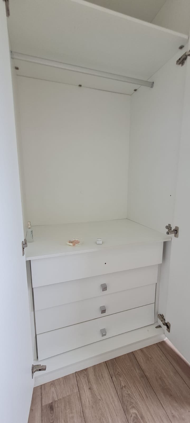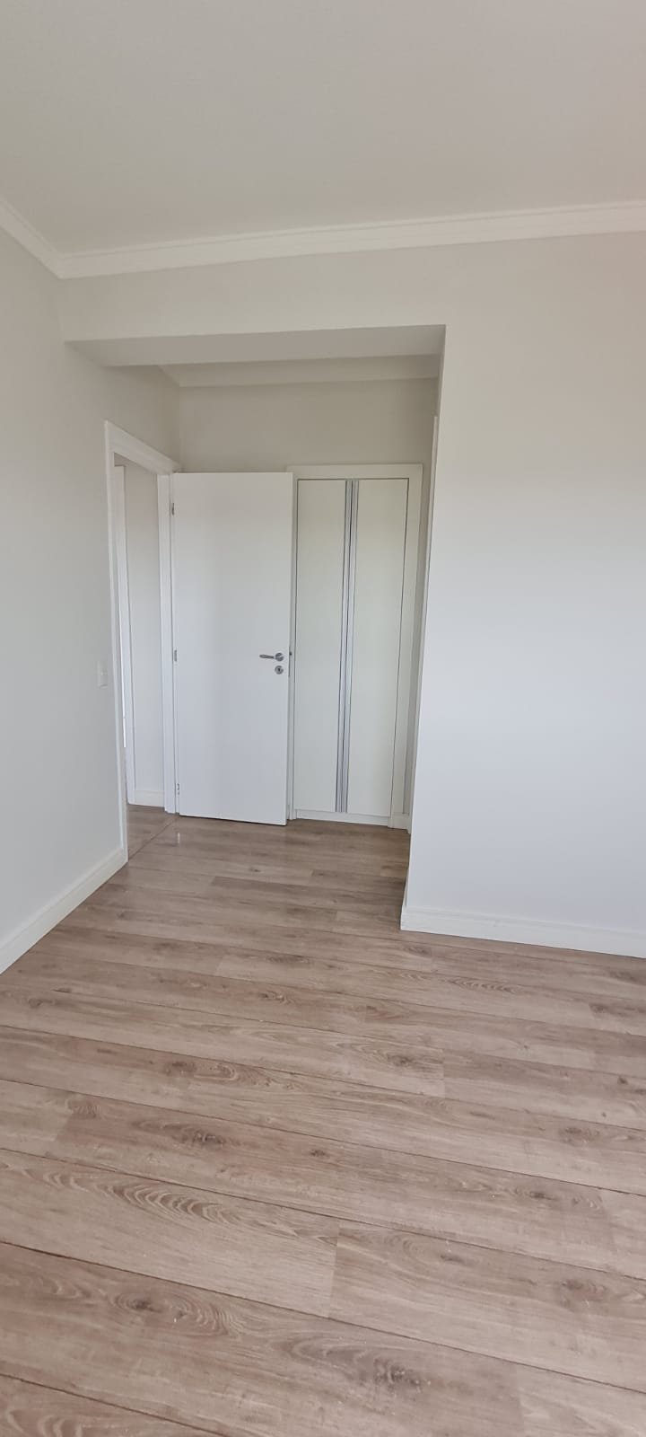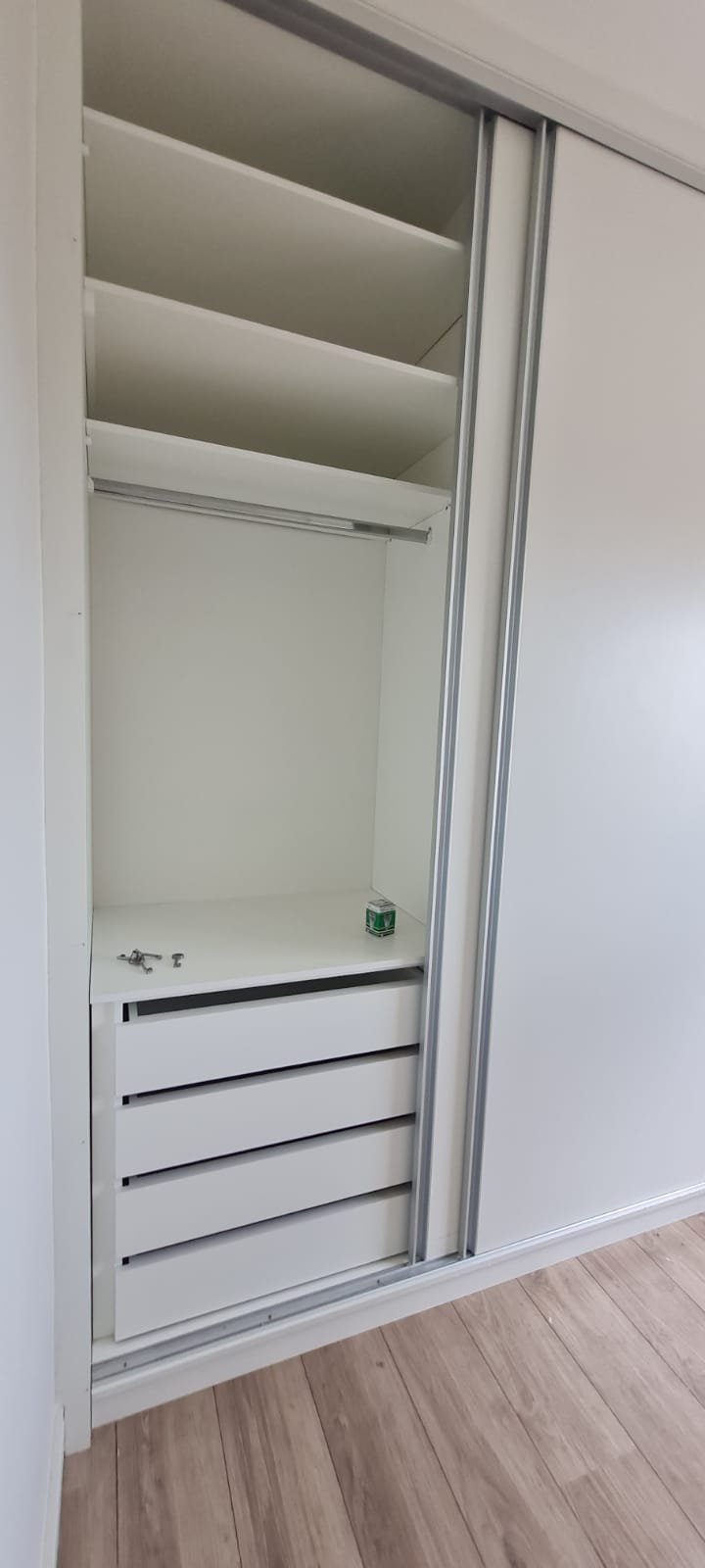 Suíte:- Porta de madeira com a pintura na cor branco em ordem, guarnição em ambos os lados com a pintura na cor branco em ordem, maçanetas em ordem, dobradiças em ordem, chaves em ordem, piso laminado de madeira mesclado em ordem, rodapés com manchas de sujeira o restante em ordem, paredes recém-pintadas com a pintura na cor branco gelo em ordem, gola de gesso com a pintura na cor branco neve em ordem, guarda roupas em madeira MDF com a pintura na cor branco contendo 03 portas de correr emperrando com lascos o restante em ordem, 03 puxadores embutidos em ordem, 06 dobradiças em ordem, 08 gavetas de correr em ordem, 07 prateleiras em ordem, 01 maleiro em ordem, 04 cabineiros em ordem, 01 sapateira embutida em madeira MDF na cor branco contendo 02 portas, 02 puxadores embutidos em ordem, 09 prateleiras fixas em ordem 06 dobradiças em ordem, 01 tomada com espelho em ordem, 01 interruptor de energia com espelho em ordem, 01 espelho com saída para cabo com cabo sobrando o restante em ordem, 01 spot de luz em ordem, 01 lustre tipo plafon com lâmpada de led em ordem, 01 janela com persiana integrada alumínio pintado branco blackout linha Lidinese com 02 folhas de vidro em ordem, com rede de proteção em ordem,