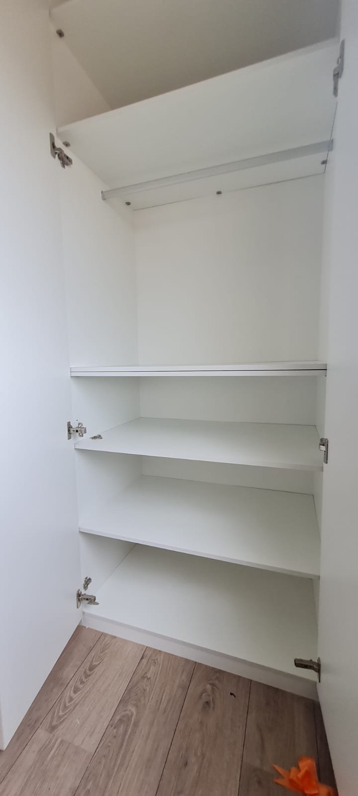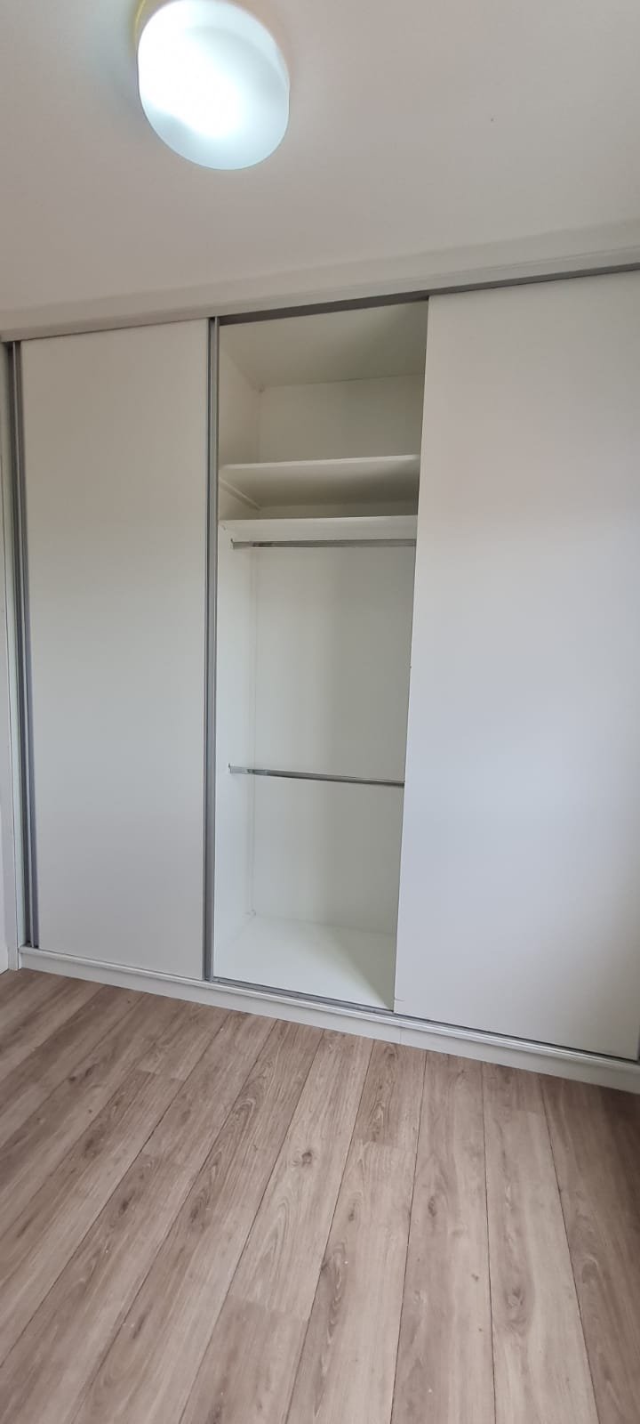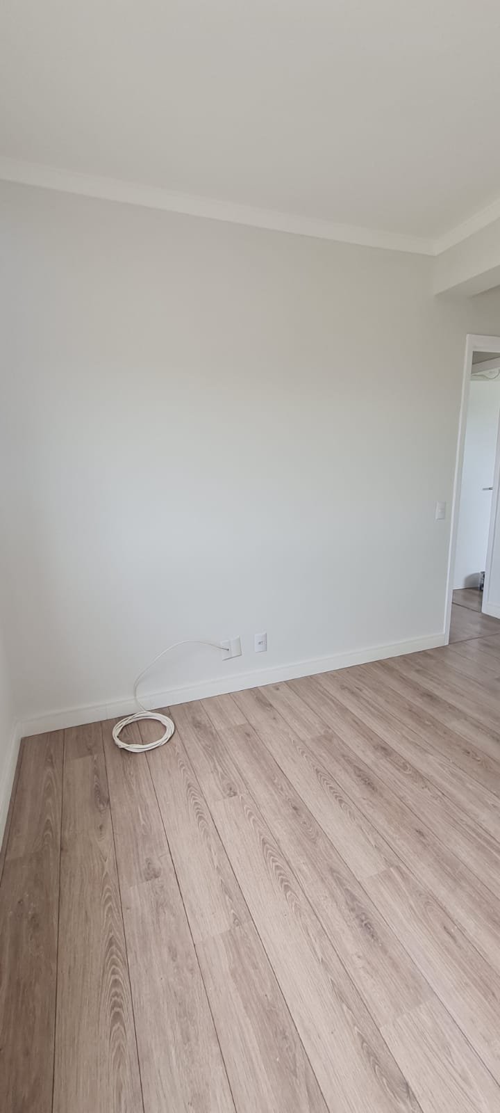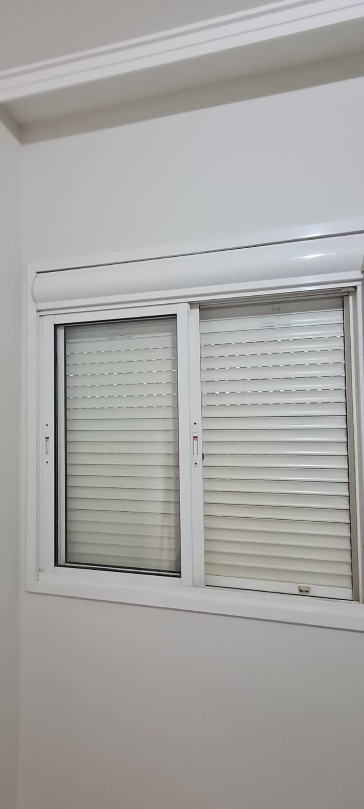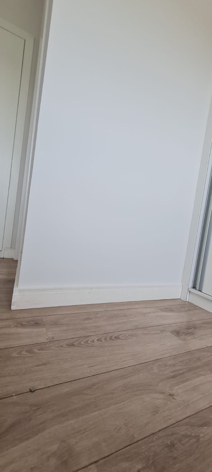 Suíte:- Porta de madeira com a pintura na cor branco em ordem, guarnição em ambos os lados com a pintura na cor branco em ordem, maçanetas em ordem, dobradiças em ordem, chaves em ordem, piso laminado de madeira mesclado em ordem, rodapés com manchas de sujeira o restante em ordem, paredes recém-pintadas com a pintura na cor branco gelo em ordem, gola de gesso com a pintura na cor branco neve em ordem, guarda roupas em madeira MDF com a pintura na cor branco contendo 03 portas de correr emperrando com lascos o restante em ordem, 03 puxadores embutidos em ordem, 06 dobradiças em ordem, 08 gavetas de correr em ordem, 07 prateleiras em ordem, 01 maleiro em ordem, 04 cabineiros em ordem, 01 sapateira embutida em madeira MDF na cor branco contendo 02 portas, 02 puxadores embutidos em ordem, 09 prateleiras fixas em ordem 06 dobradiças em ordem, 01 tomada com espelho em ordem, 01 interruptor de energia com espelho em ordem, 01 espelho com saída para cabo com cabo sobrando o restante em ordem, 01 spot de luz em ordem, 01 lustre tipo plafon com lâmpada de led em ordem, 01 janela com persiana integrada alumínio pintado branco blackout linha Lidinese com 02 folhas de vidro em ordem, com rede de proteção em ordem,