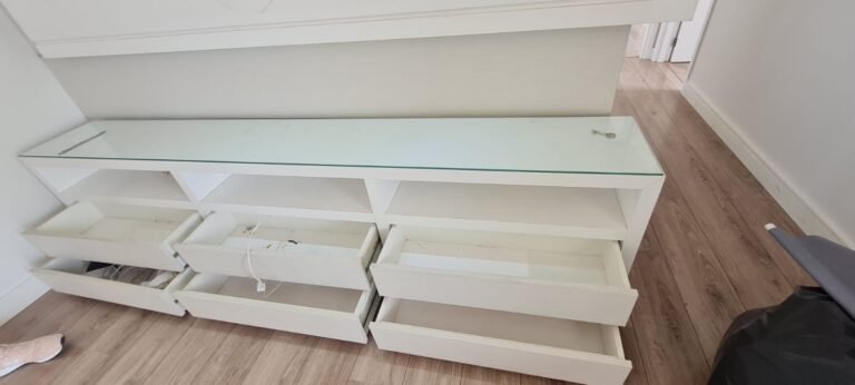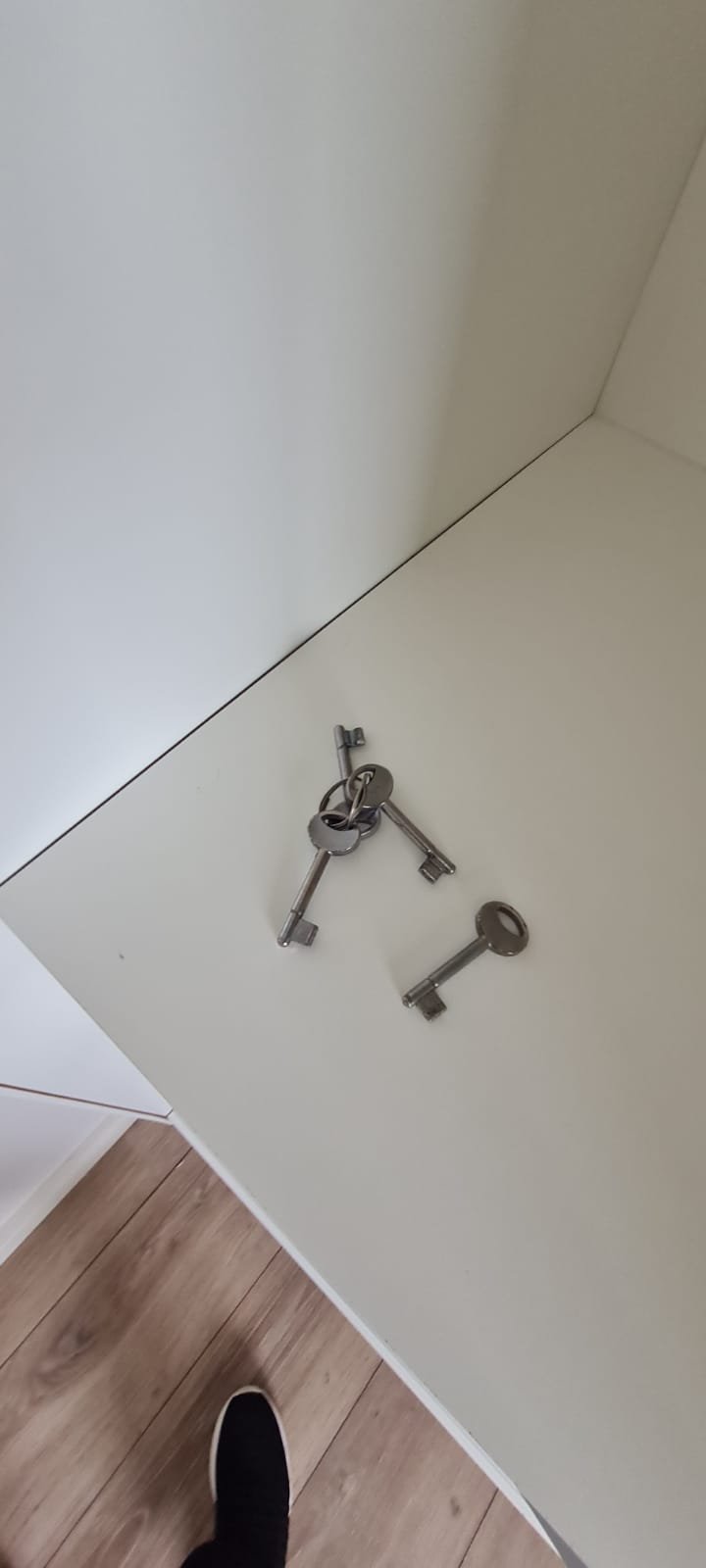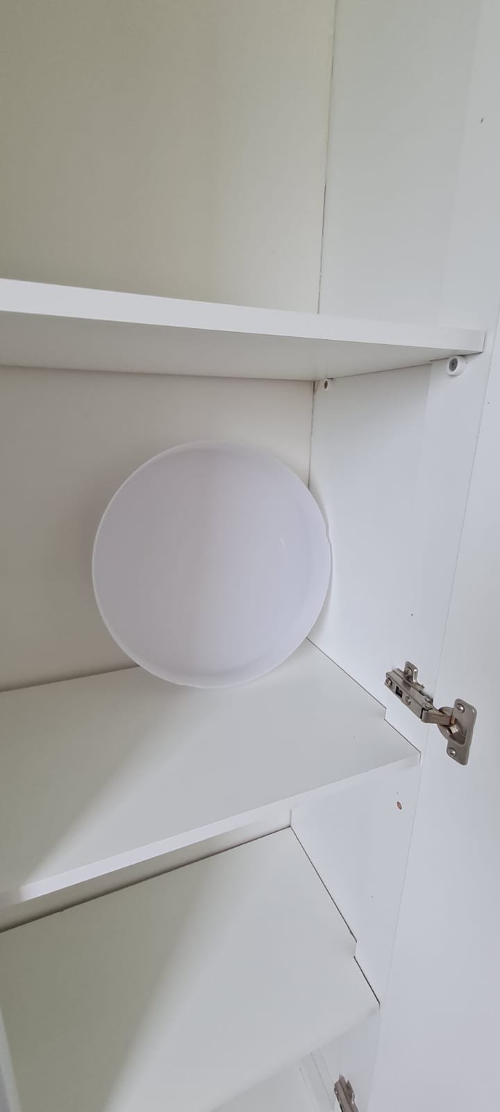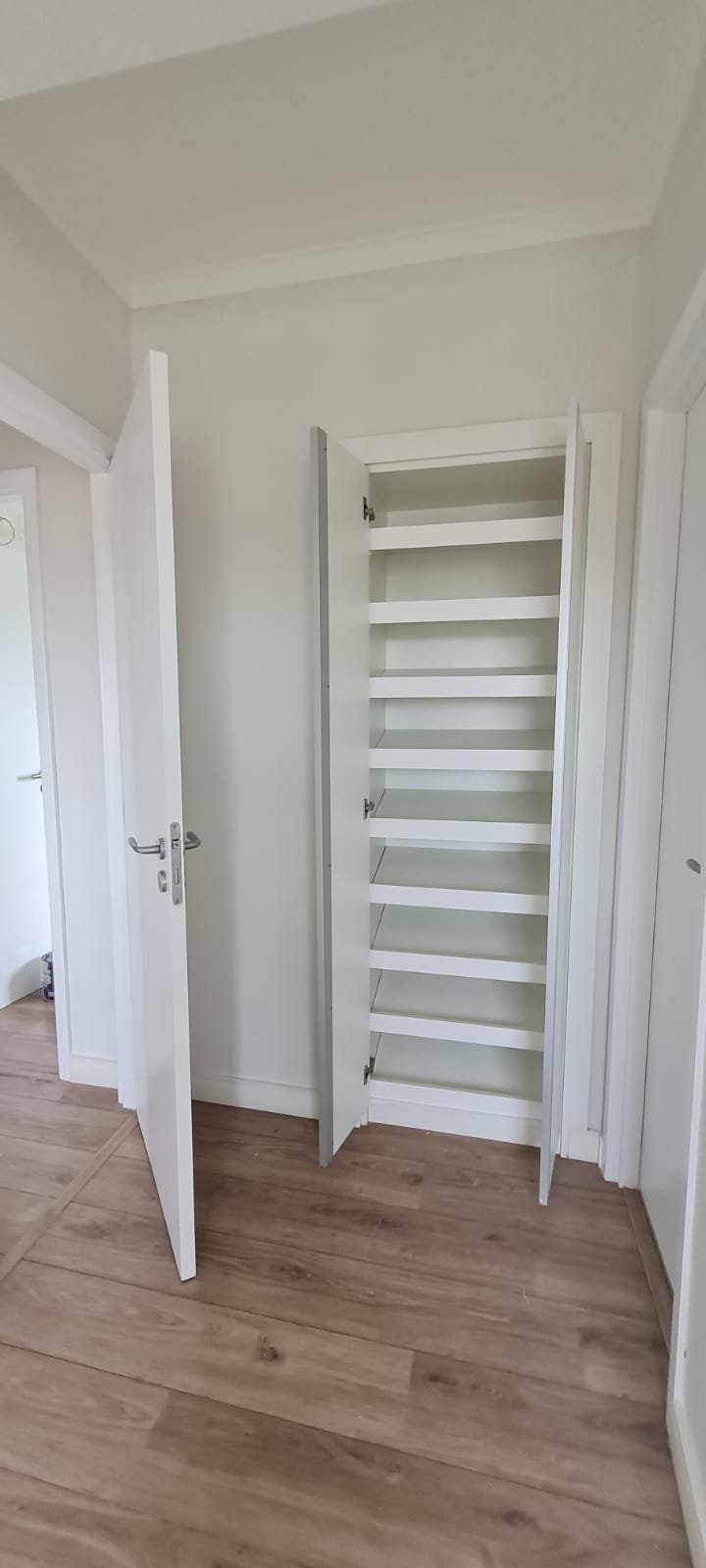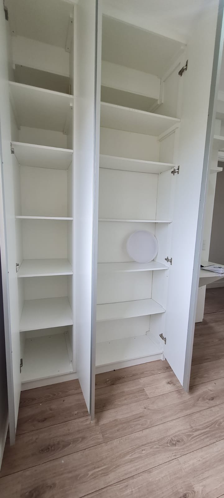 Suíte:- Porta de madeira com a pintura na cor branco em ordem, guarnição em ambos os lados com a pintura na cor branco em ordem, maçanetas em ordem, dobradiças em ordem, chaves em ordem, piso laminado de madeira mesclado em ordem, rodapés com manchas de sujeira o restante em ordem, paredes recém-pintadas com a pintura na cor branco gelo em ordem, gola de gesso com a pintura na cor branco neve em ordem, guarda roupas em madeira MDF com a pintura na cor branco contendo 03 portas de correr emperrando com lascos o restante em ordem, 03 puxadores embutidos em ordem, 06 dobradiças em ordem, 08 gavetas de correr em ordem, 07 prateleiras em ordem, 01 maleiro em ordem, 04 cabineiros em ordem, 01 sapateira embutida em madeira MDF na cor branco contendo 02 portas, 02 puxadores embutidos em ordem, 09 prateleiras fixas em ordem 06 dobradiças em ordem, 01 tomada com espelho em ordem, 01 interruptor de energia com espelho em ordem, 01 espelho com saída para cabo com cabo sobrando o restante em ordem, 01 spot de luz em ordem, 01 lustre tipo plafon com lâmpada de led em ordem, 01 janela com persiana integrada alumínio pintado branco blackout linha Lidinese com 02 folhas de vidro em ordem, com rede de proteção em ordem,