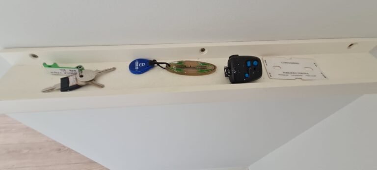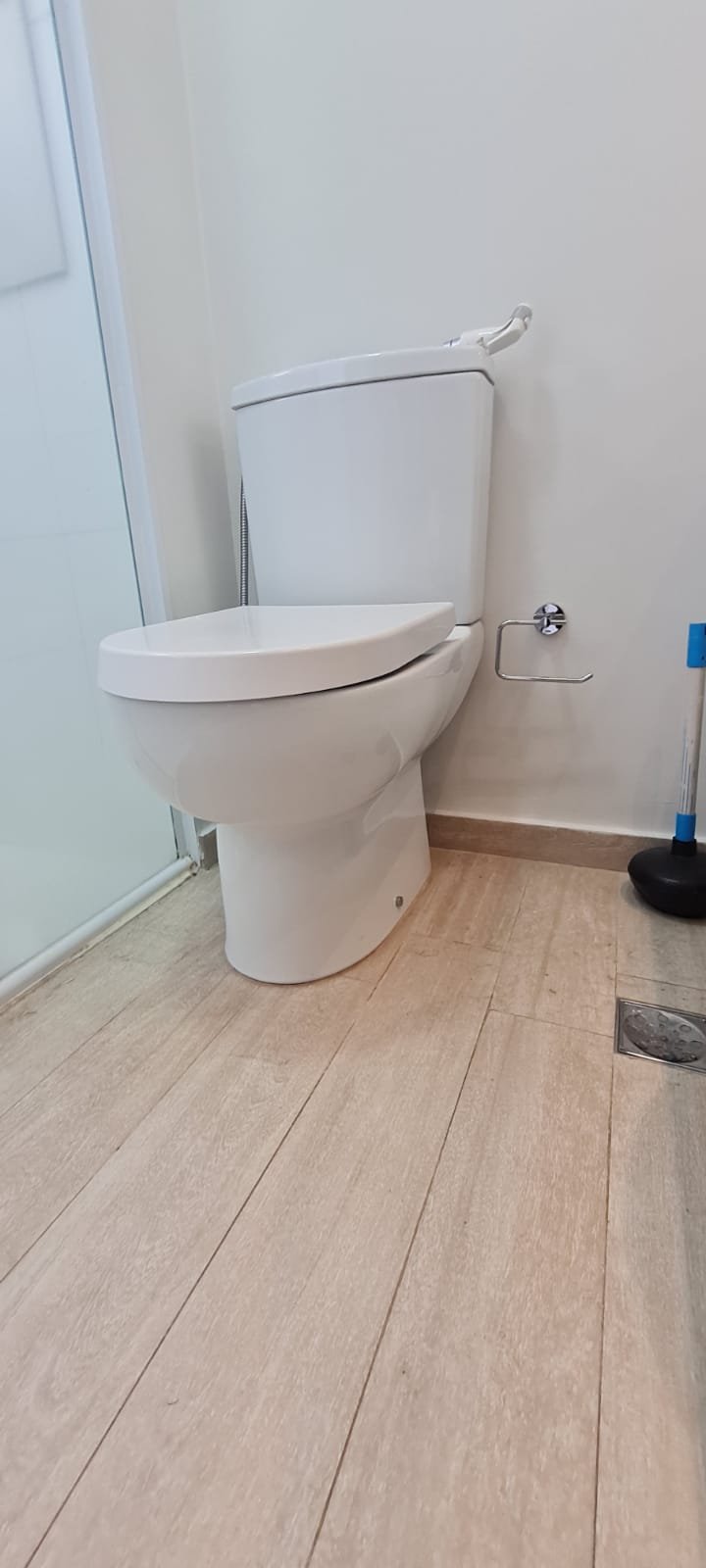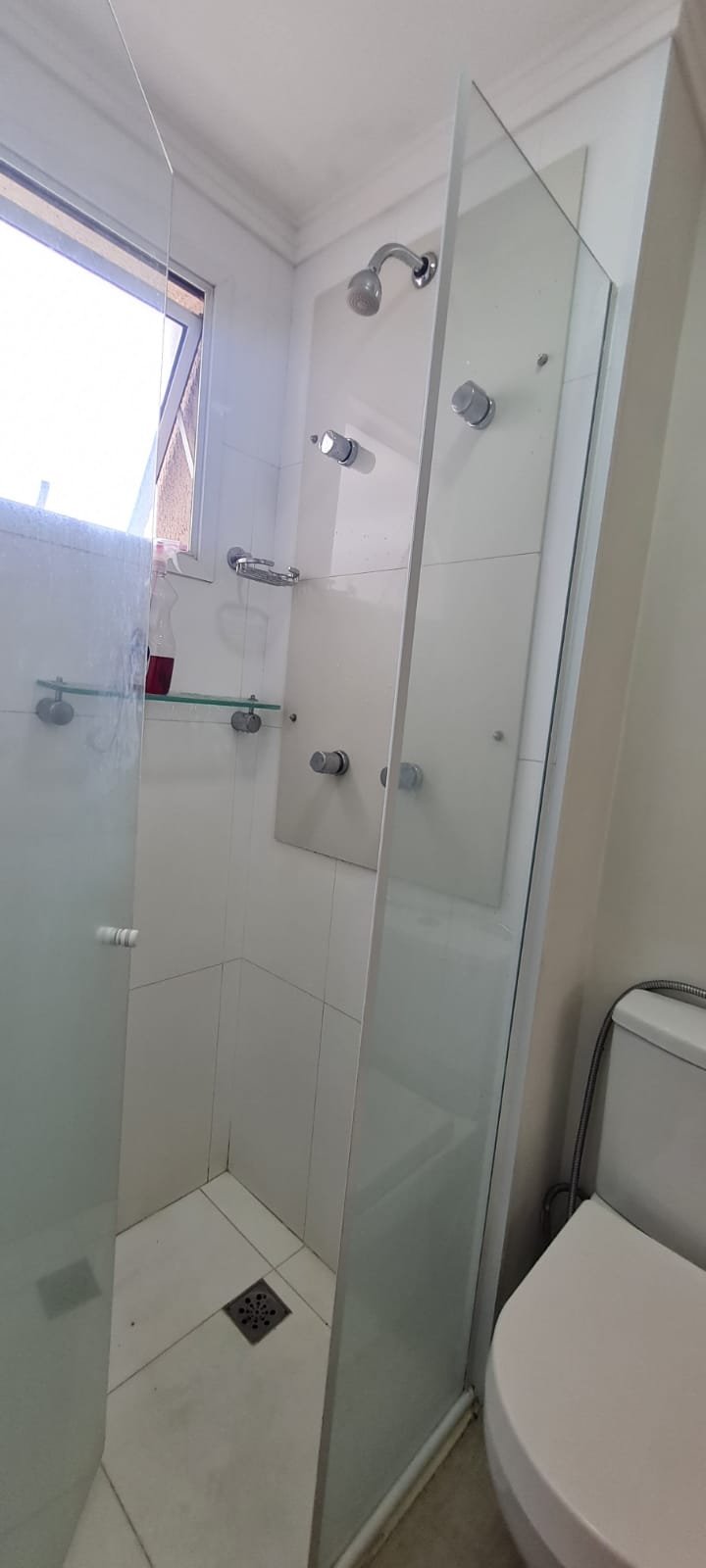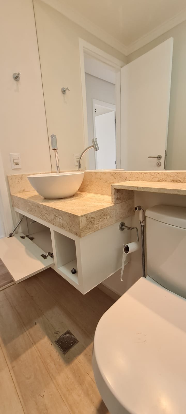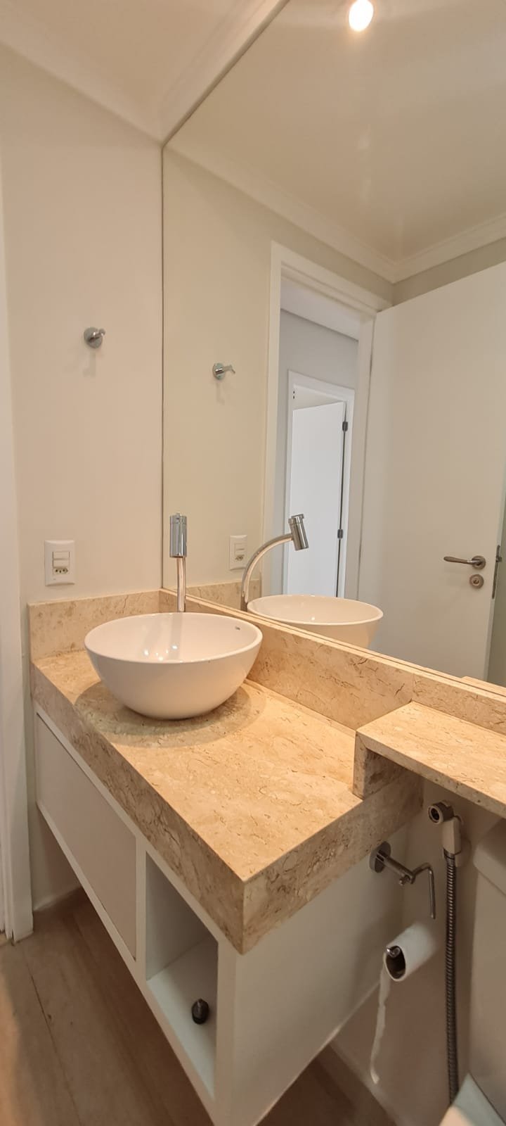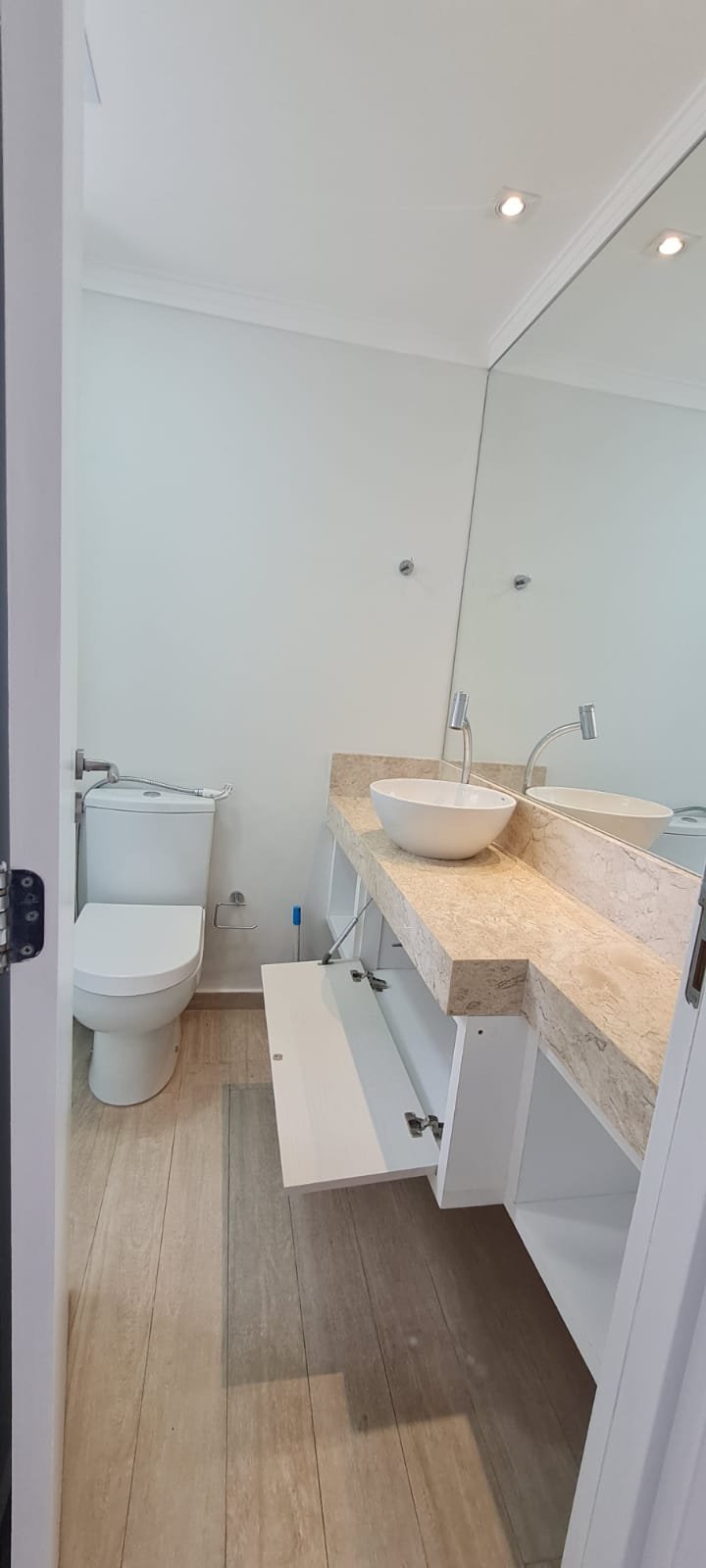 WC SOCIAL:- Porta de madeira com a pintura na cor branco com porta toalhas em ordem, guarnição em ambos os lados em ordem, maçaneta em ordem, dobradiças em ordem, chave embutida em ordem, Piso porcelanato mesclado em ordem, rodapés piso porcelanato mesclado em ordem, filete de soleira em granito Travertino em ordem, paredes recém-pintadas na cor branco gelo em ordem, teto com a pintura na cor branco neve em ordem, gola de gesso com a pintura na cor branco neve em ordem, 01 luminária embutida de led em ordem, 02 spot embutidos com lâmpada dicroica em ordem, Pia em granito em granito Travertino com frontão em ordem, 01 cuba de sobrepor Celite em ordem, válvula em ordem, 01 sifão desentupido em ordem, 01 tampinha em ordem, 01 torneira de pia bica alta cromada marca roca em ordem, um armário embutido em madeira MDF contendo 01 porta em MDF linho couro em ordem, 02 dobradiças em ordem, 01 pistão pneumático em ordem, 01 nichos em ordem, 02 ralos de inox desentupido em ordem, 01 espelho lapidado em ordem, 01 porta papel higiênico em ordem, 01 porta toalhas em ordem, 01 saboneteira em ordem, 01 porta shampoo de vidro em ordem, 01 box blidex incolor contendo 02 folhas sendo 01 folha de correr ordem e a outra fixa em ordem, paredes do box com revestimento cerâmico branco ate o teto na cor branco em ordem, piso em revestimento cerâmico (azulejos) na cor banco em ordem, 02 pisos porcelanato bege na parede do chuveiro com 04 parafusos em ordem, 04 registros Deca em ordem, 01 chuveiro de parede Deca em ordem, 01 janela basculante em alumínio com a pintura na cor branco em ordem, 01 vaso sanitário com caixa acoplada cerâmica na cor branco da marca Celite em ordem, 01 ducha higiênica com o suporte da parede em ordem, 01 interruptor com espelho em ordem.