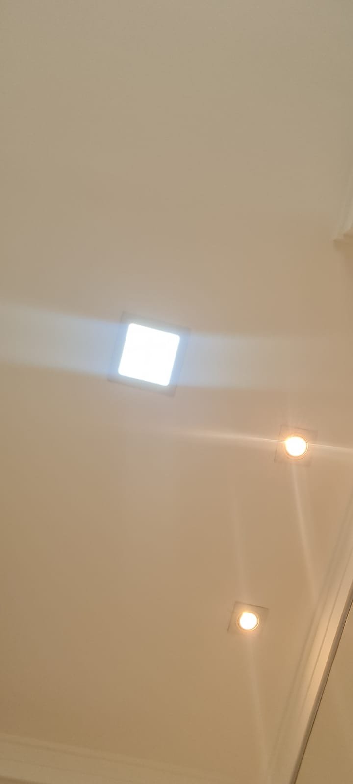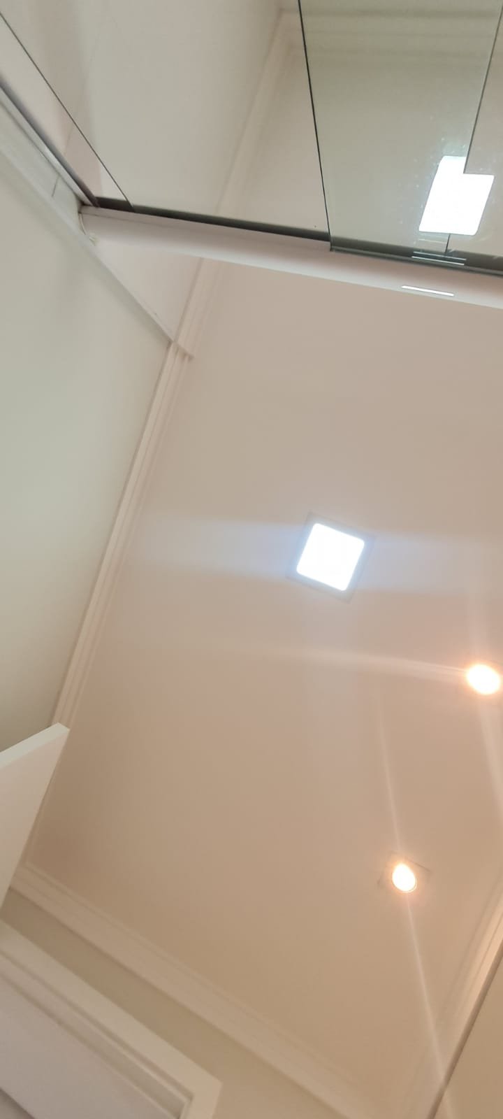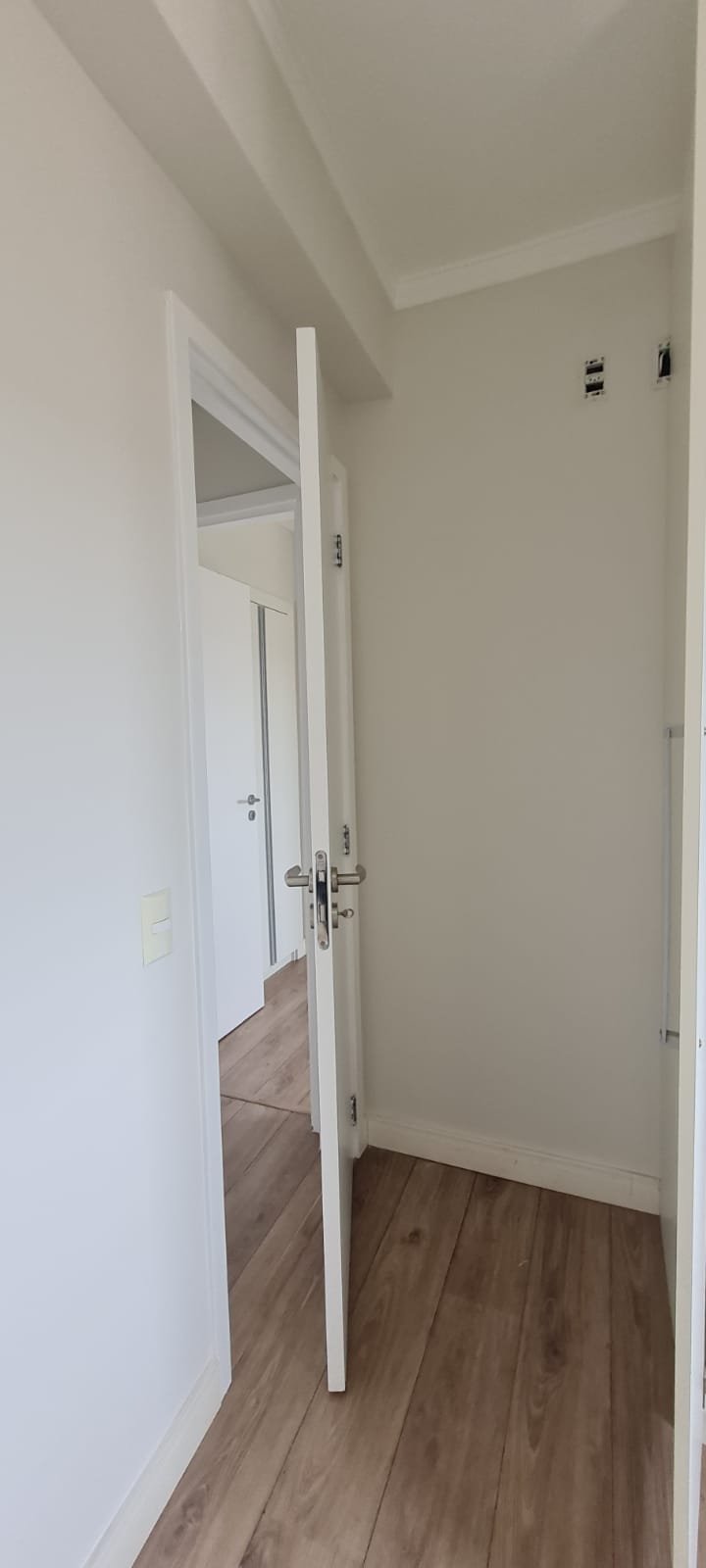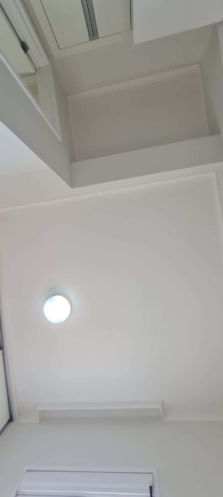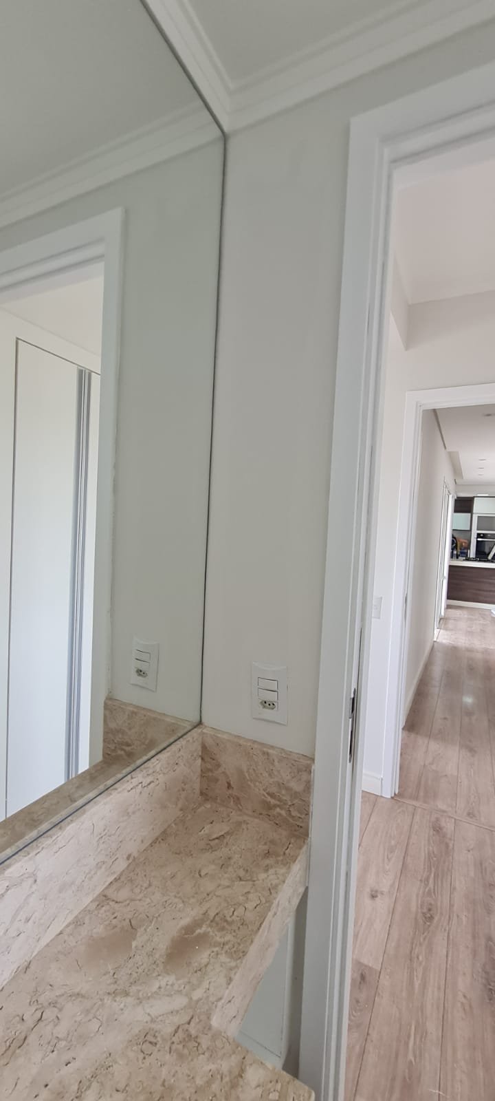 Corredor:- Piso Laminado de madeira mesclado em ordem, rodapés com manchas de sujeira o restante m ordem, paredes recém-pintadas com pintura na cor branco gelo em ordem, teto com a pintura na cor branco neve em ordem, sanca de gesso em ordem, 03 spot sendo 02 queimados o restante em ordem, 01 interruptor com espelho de luz em ordem,