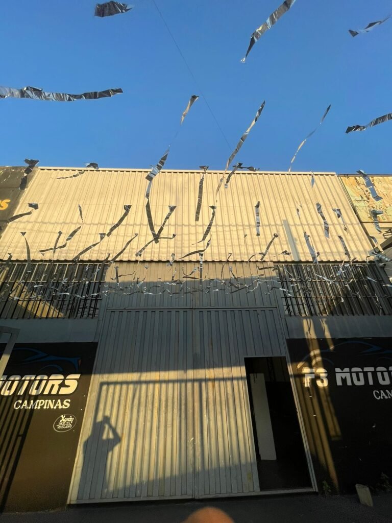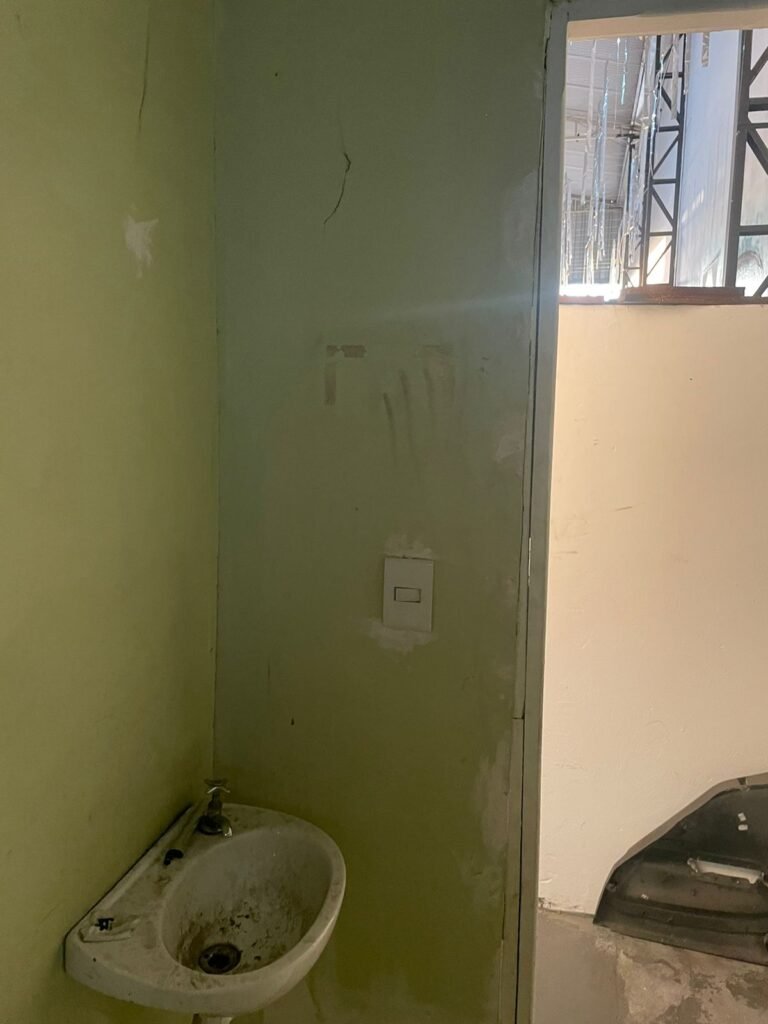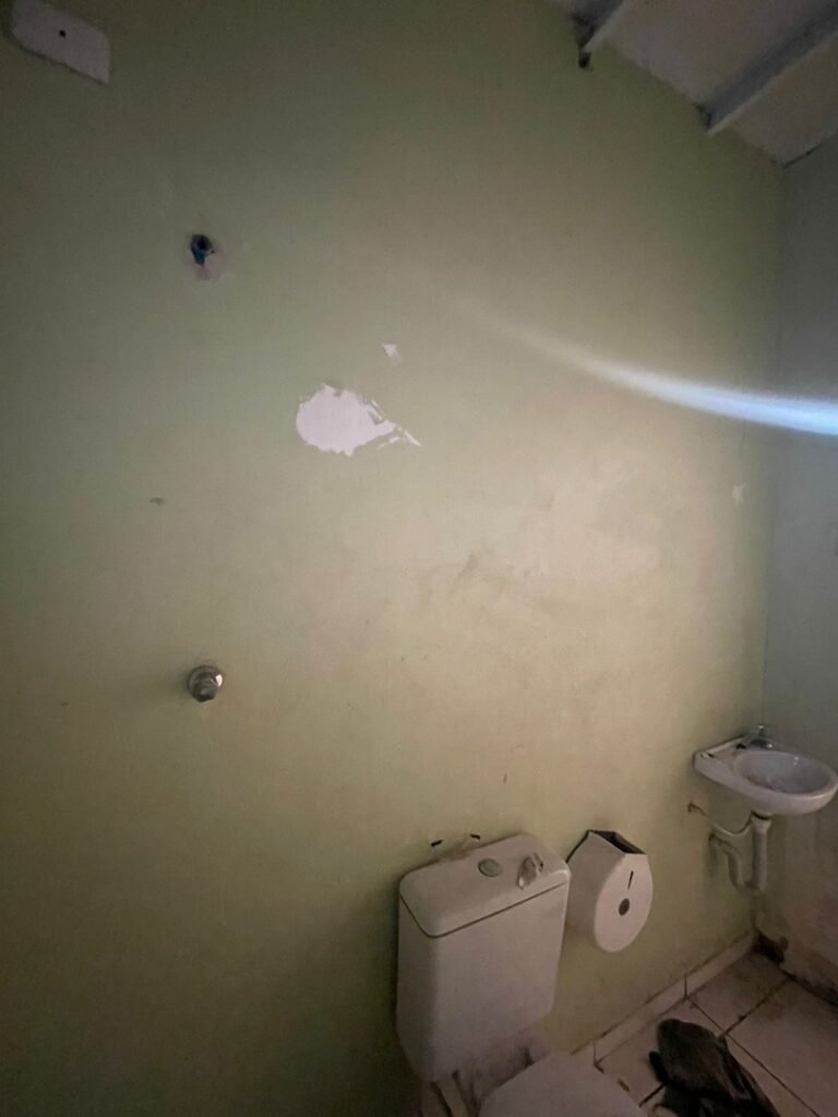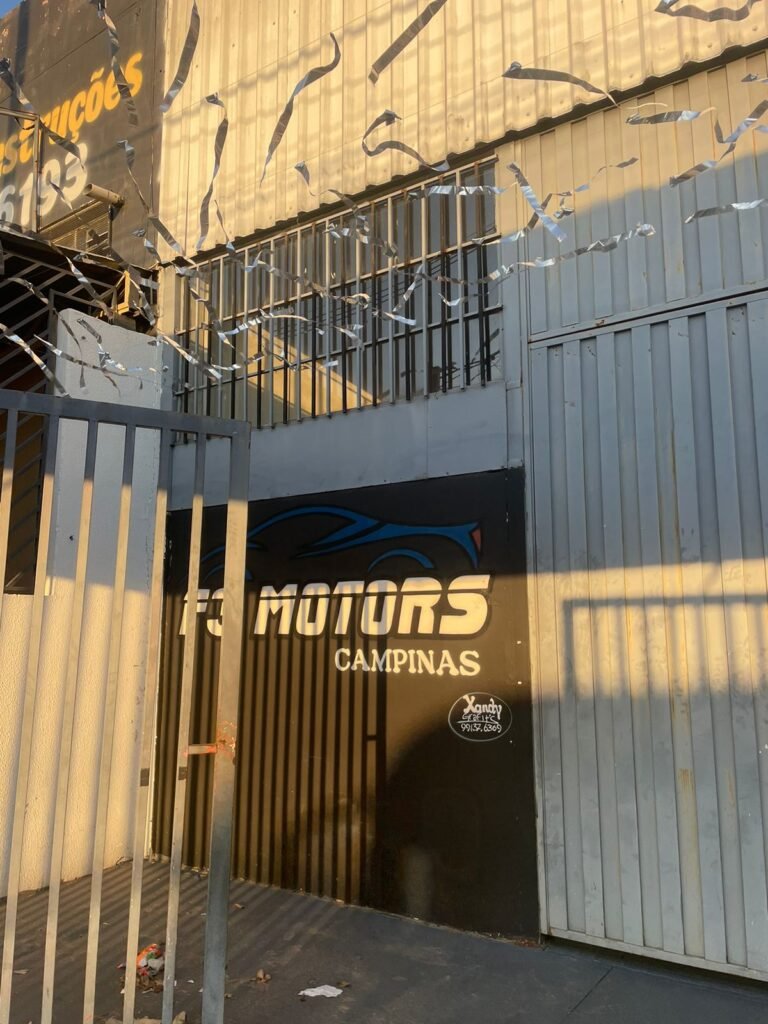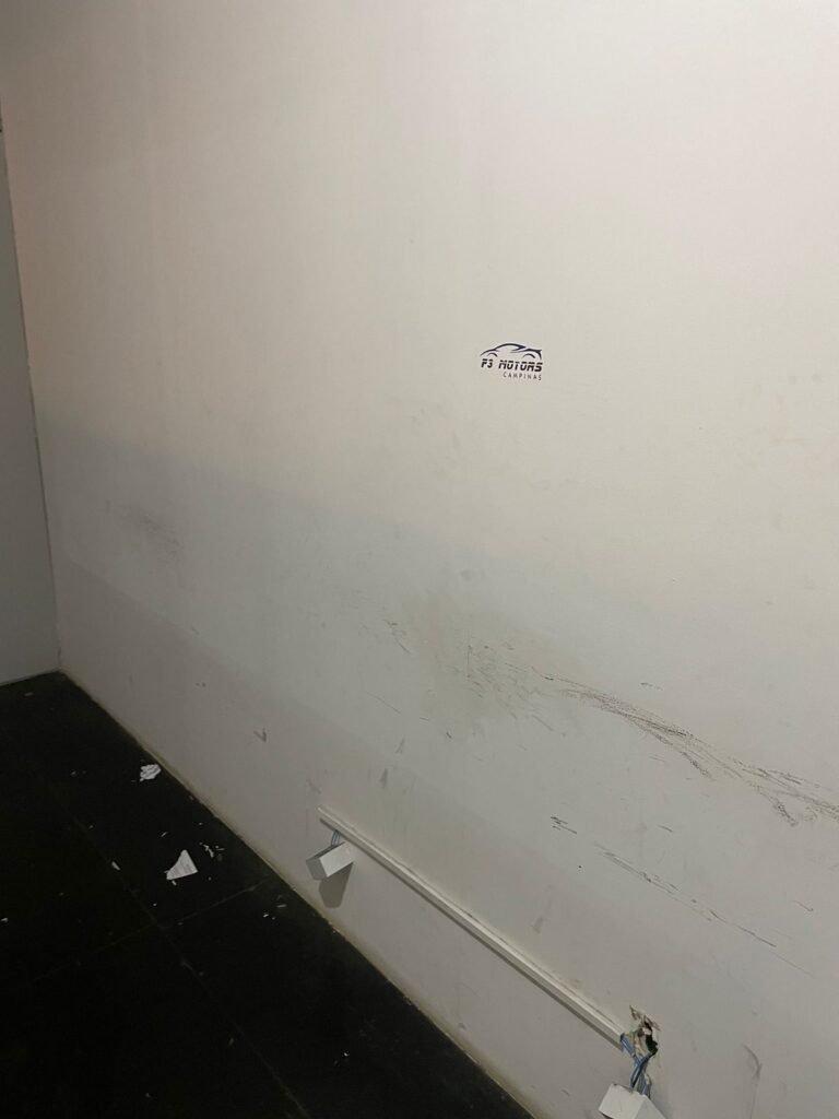 GARAGEM:- Piso de concreto polido cor azul com desgaste natural e trincos, paredes laterais com textura branco gelo com trinca em toda extensão da parede ( do lado direito de quem da rua olha para o barracão, fachada do prédio de alvenaria e telha trapezoidal cor branca em ordem, portão de ferro metalon e de chapa dobrada tipo carreta com cor cinza desgastada, 01 porta social de metalon e chapa dobrada com 02 chaves tetra, maçanetas e fechadura yale em ordem, paredes com pintura preta e grafitada com racho por toda extensão, janelas de vidro temperado com grade de proteção de ferro metalon em ordem, 01 câmera de vigilância Siemens.