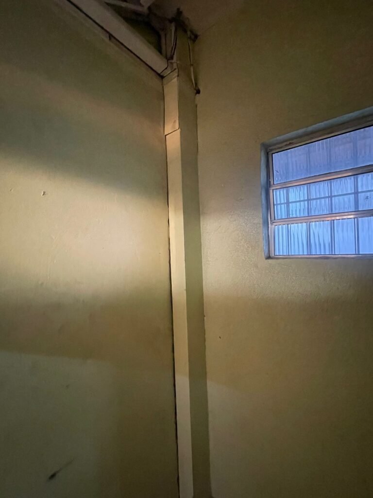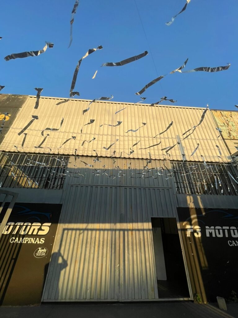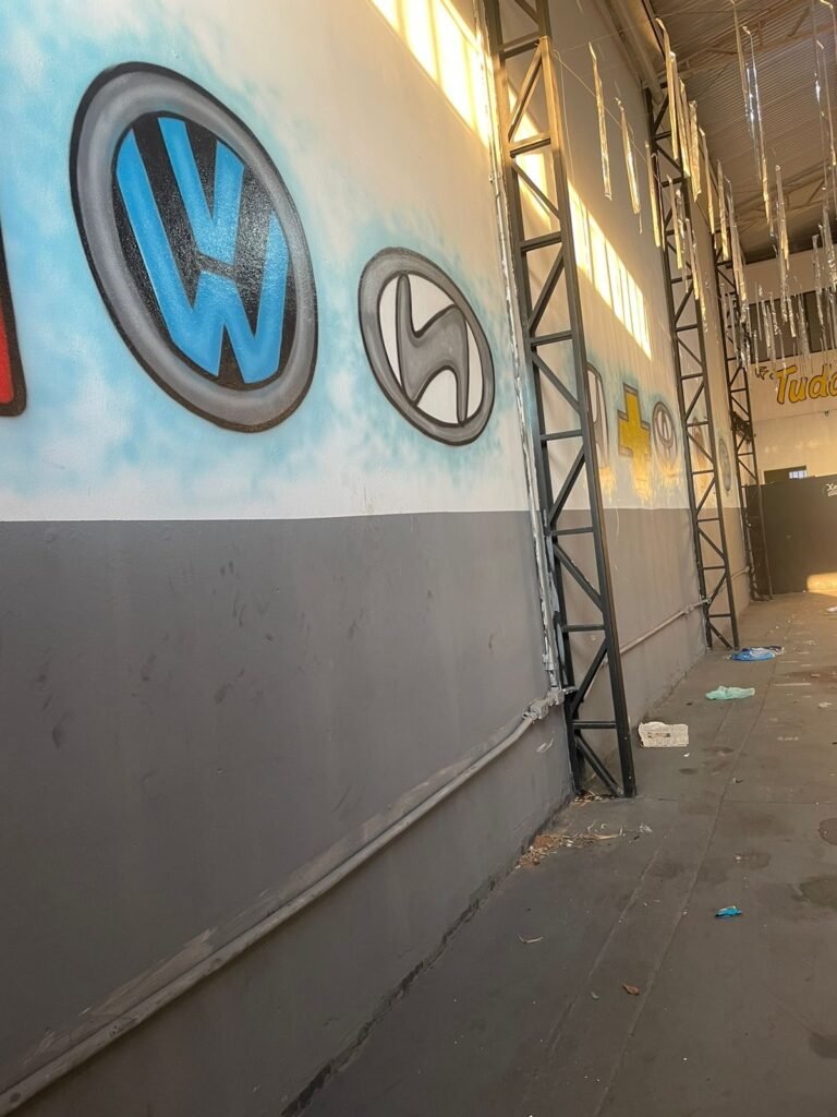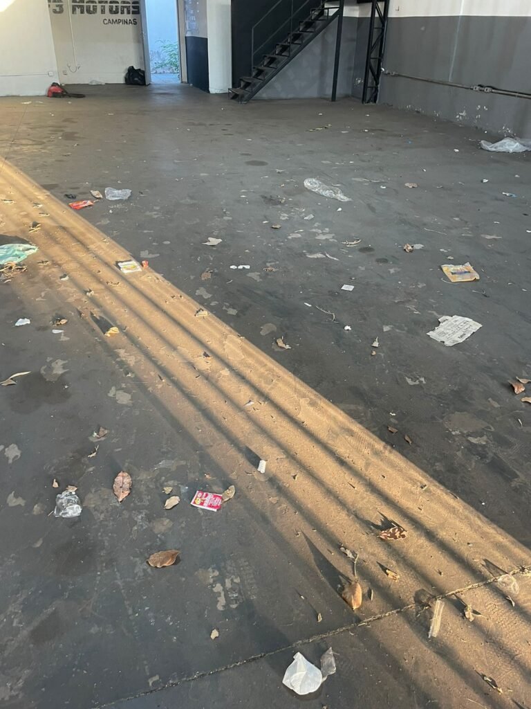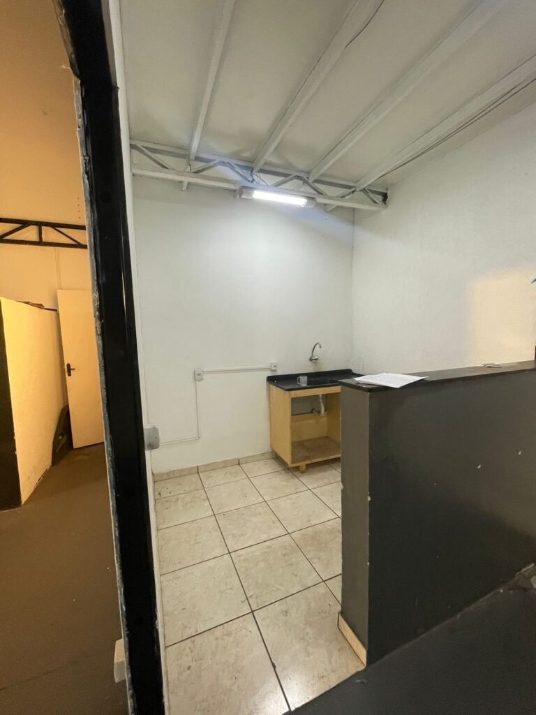 GARAGEM:- Piso de concreto polido cor azul com desgaste natural e trincos, paredes laterais com textura branco gelo com trinca em toda extensão da parede ( do lado direito de quem da rua olha para o barracão, fachada do prédio de alvenaria e telha trapezoidal cor branca em ordem, portão de ferro metalon e de chapa dobrada tipo carreta com cor cinza desgastada, 01 porta social de metalon e chapa dobrada com 02 chaves tetra, maçanetas e fechadura yale em ordem, paredes com pintura preta e grafitada com racho por toda extensão, janelas de vidro temperado com grade de proteção de ferro metalon em ordem, 01 câmera de vigilância Siemens.