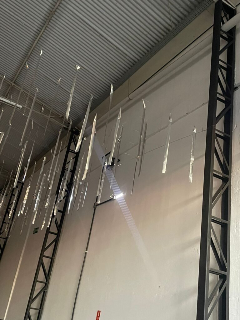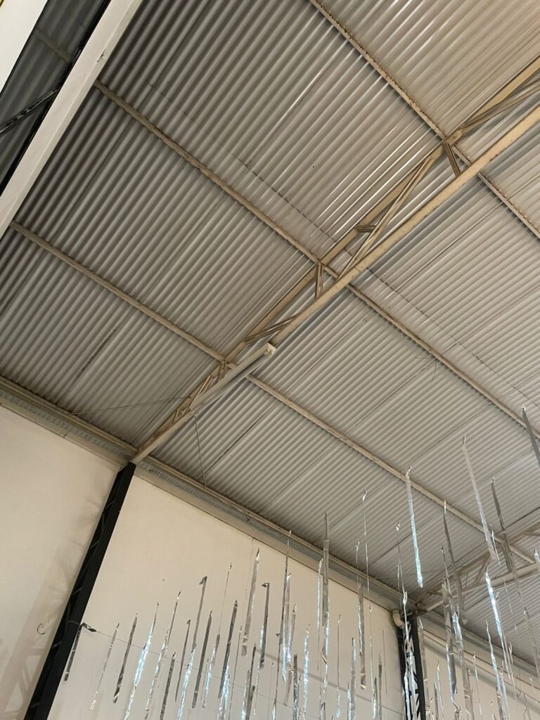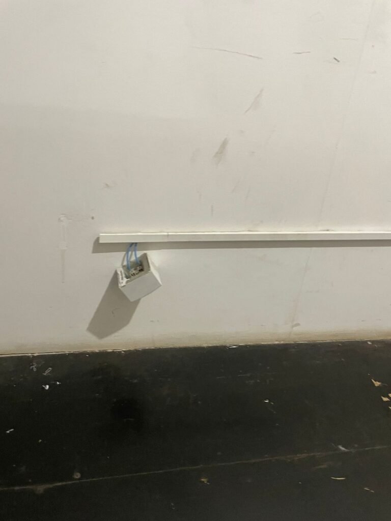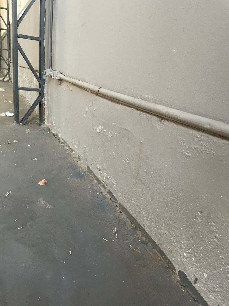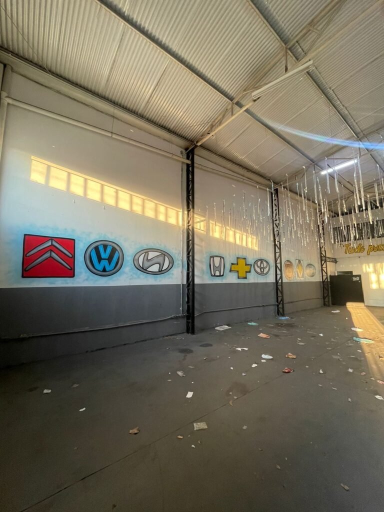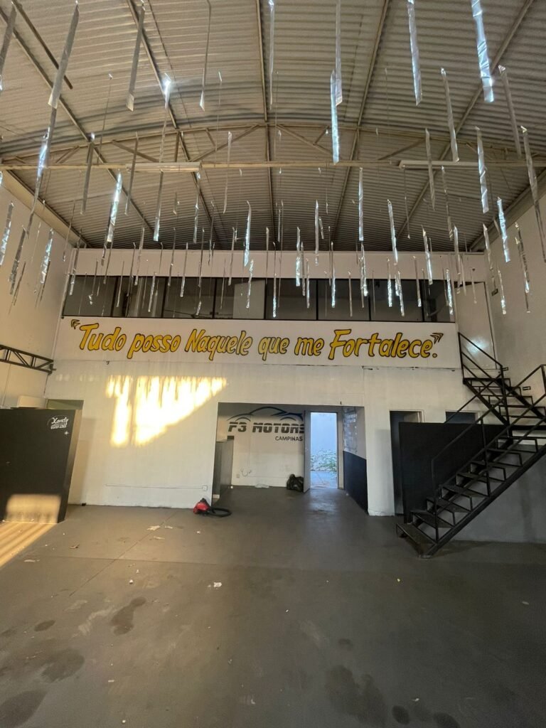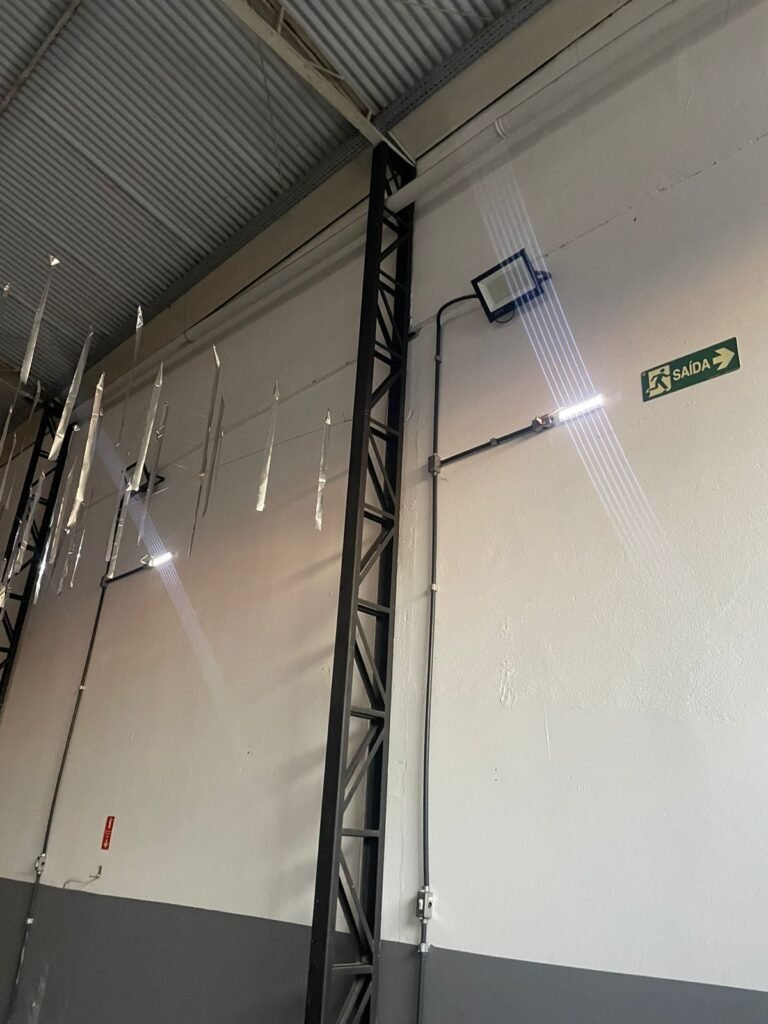 GALPÃO:- Piso de concreto usinado e polido com pintura tinta piso na cor cinza descascando e com manchas, paredes laterais com grafites de alvenaria com pintura barrado na cor cinza e restante na cor branco neve com desgaste natural, descasque e marcas de infiltração, demarcação de extintor no piso, 03 placas de extintores, telhado de estrutura metálica com telhas galvanizada na cor branca, caixa de disjuntores com 01 disjuntor trifásico 63A, 07 disjuntores bifásico 20A, 06 disjuntores monofásico 16A, 02 disjuntores bifásico 32A, 06 luminárias duplas com 03 lâmpadas fluorescentes tubulares em ordem, 05 lâmpadas fluorescentes danificadas, 03 interruptores em ordem, interação elétrica por conduletes externos com 20 tomadas, 02 tomadas sem espelho, 03 holofotes 400w LED em ordem, 02 luminárias de emergência.