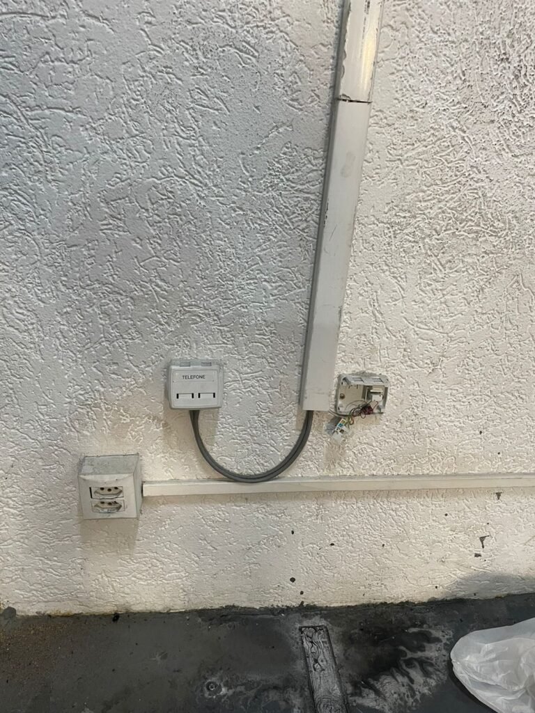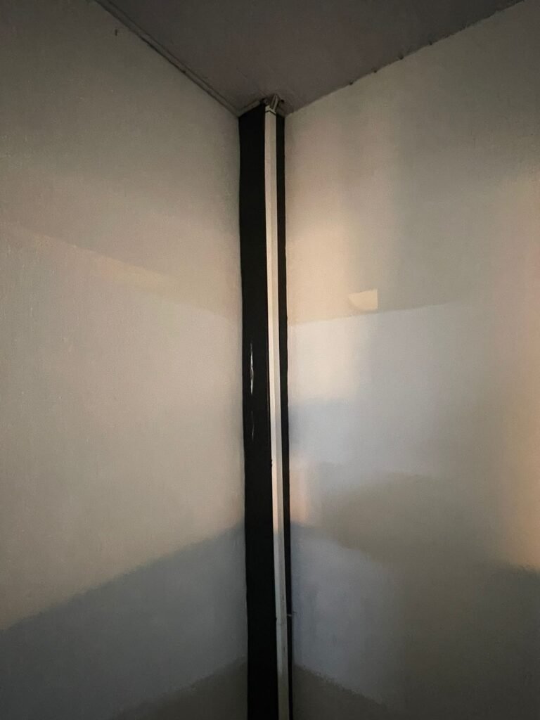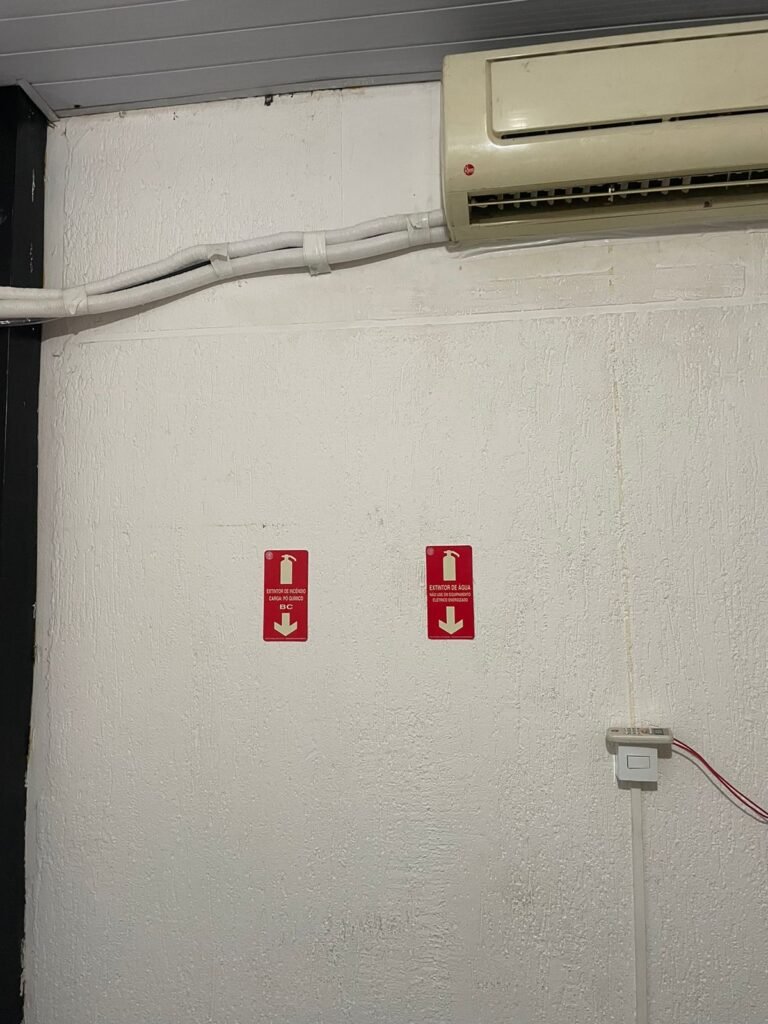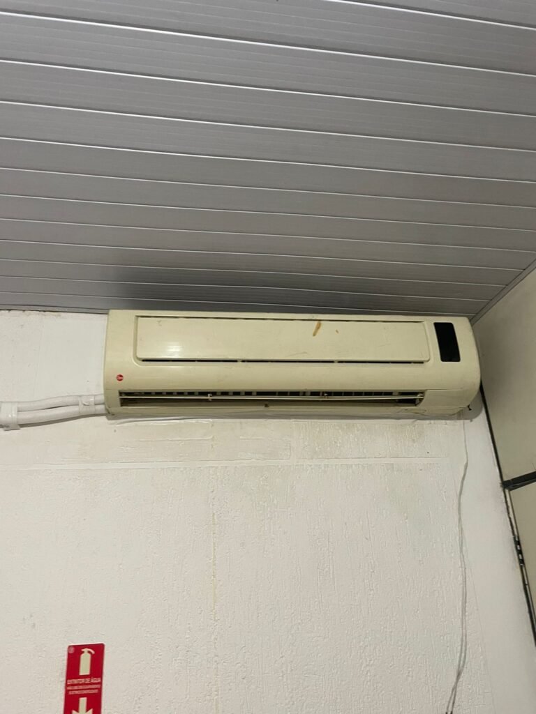 SALA 01: Porta da divisória naval com maçaneta com tranca embutida, piso de madeira na cor preta com saindo lascas, paredes com reboco e pintura na cor branco neve com manchas, ar condicionado Rheem com 01 controle remoto em ordem, divisória naval com porta cinza, janelas com 04 vidros lisos transparentes em ordem, 01 interruptor de luz com fio exposto, 02 tomadas duplas danificadas, 01 luminária dupla com 01 lâmpada bulbo, teto de PVC na cor branco em ordem.