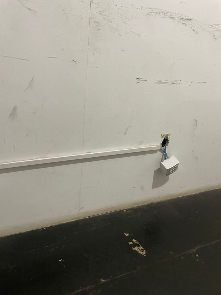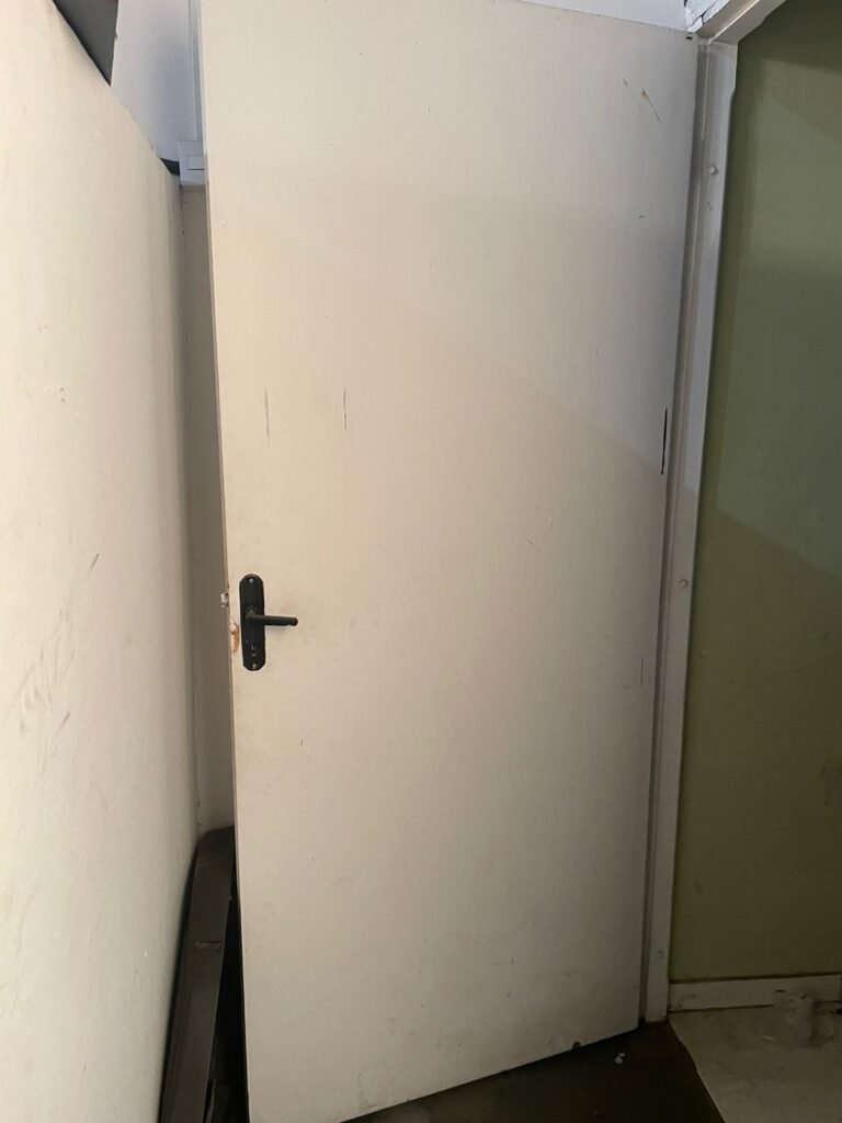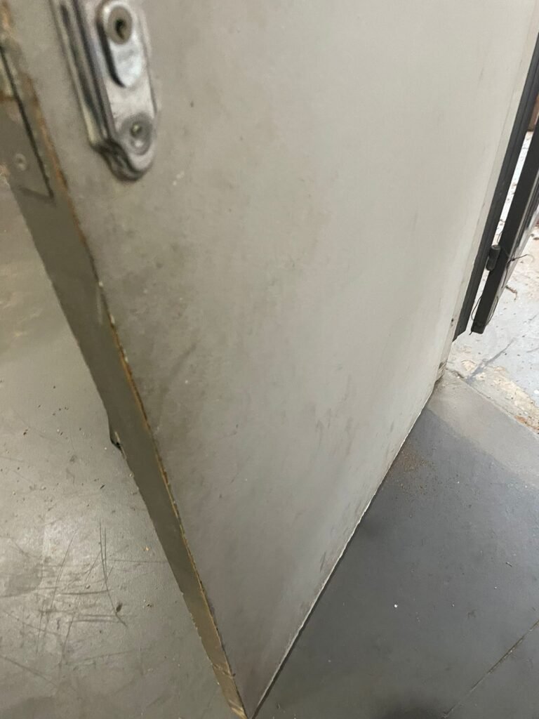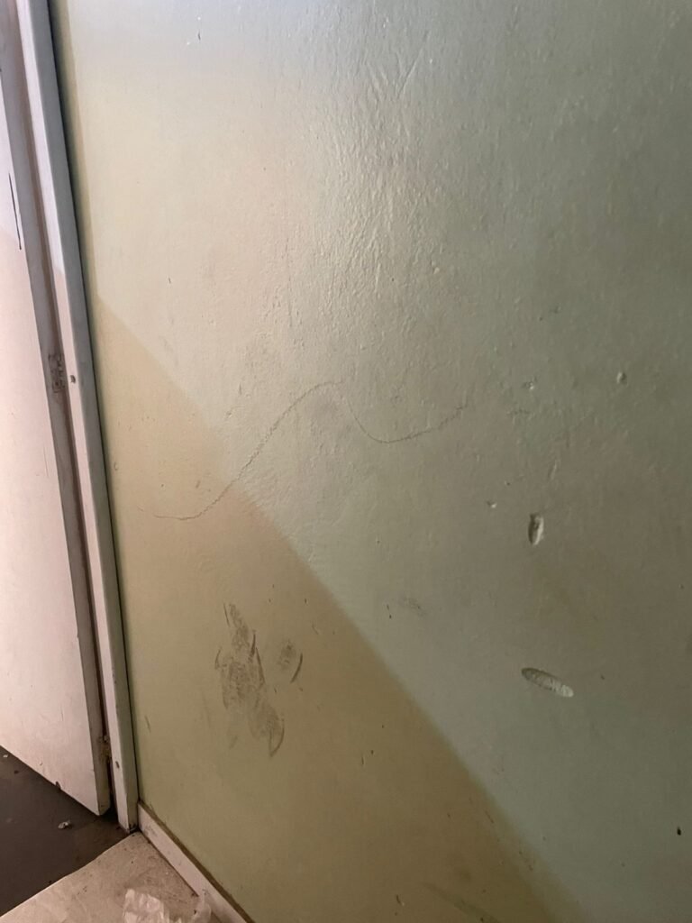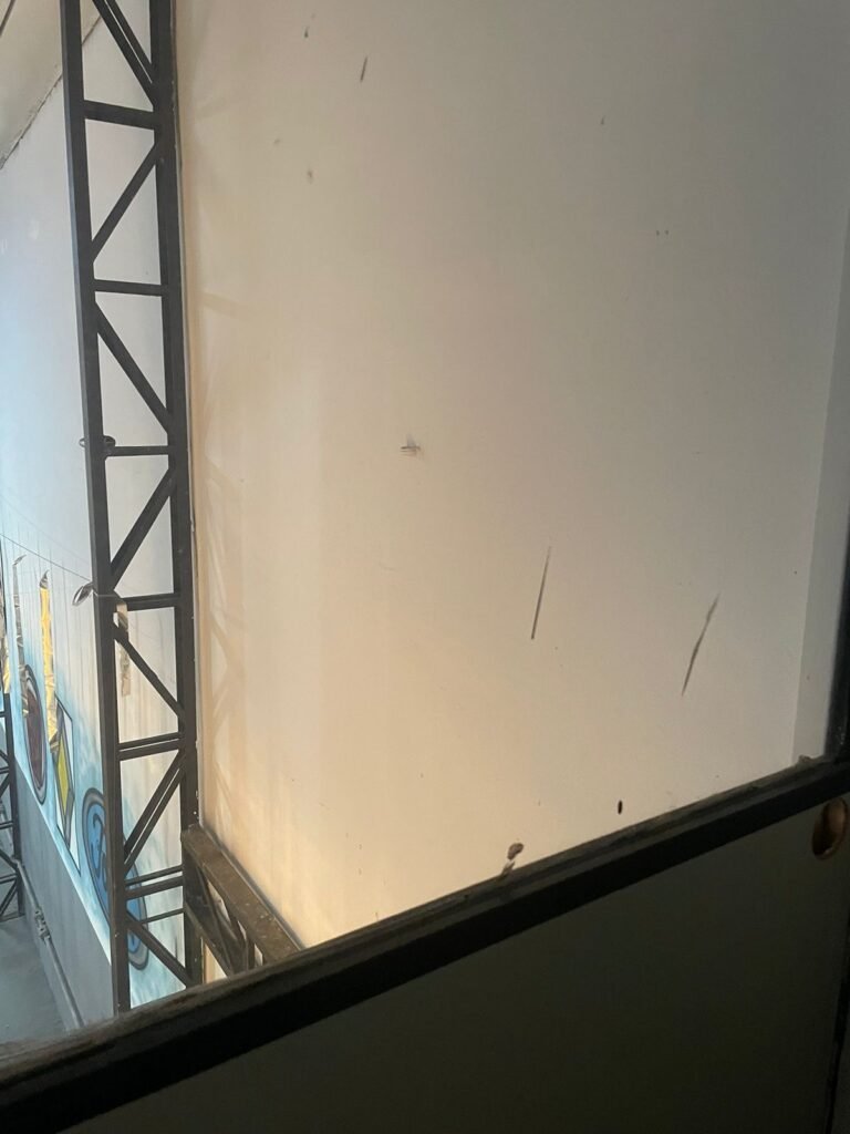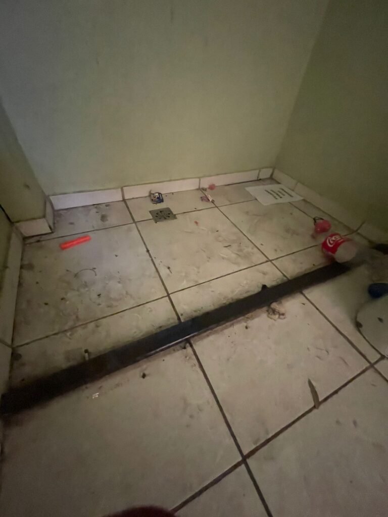 SALA 02-: Porta da divisória naval com maçaneta com tranca embutida e danificada, piso de madeira na cor preta com saindo lascas, paredes com reboco e pintura na cor branco neve com manchas e com grafite, divisória naval com 02 enforca gato e com porta cinza, janelas com 03 vidros lisos transparentes em ordem, 01 interruptor de luz com fio exposto, 01 tomadas, 01 luminária dupla com 01 lâmpada bulbo danificada e 01 lâmpada de LED, teto de PVC na cor branco em ordem.