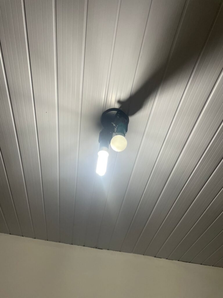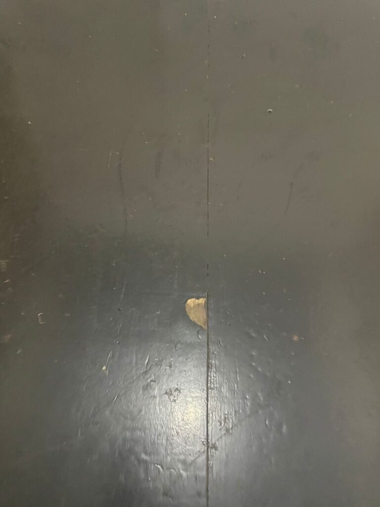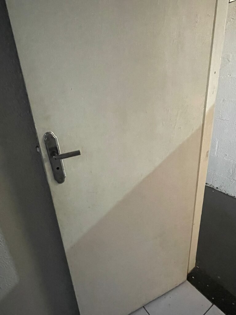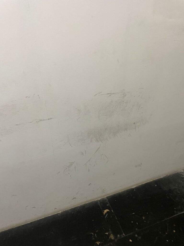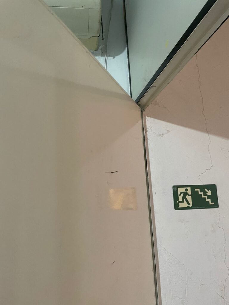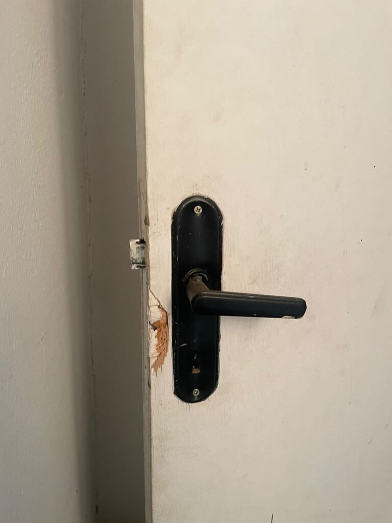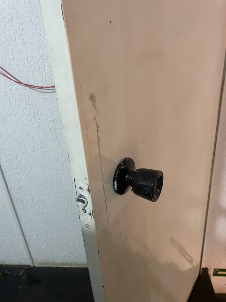 SALA 02-: Porta da divisória naval com maçaneta com tranca embutida e danificada, piso de madeira na cor preta com saindo lascas, paredes com reboco e pintura na cor branco neve com manchas e com grafite, divisória naval com 02 enforca gato e com porta cinza, janelas com 03 vidros lisos transparentes em ordem, 01 interruptor de luz com fio exposto, 01 tomadas, 01 luminária dupla com 01 lâmpada bulbo danificada e 01 lâmpada de LED, teto de PVC na cor branco em ordem.
