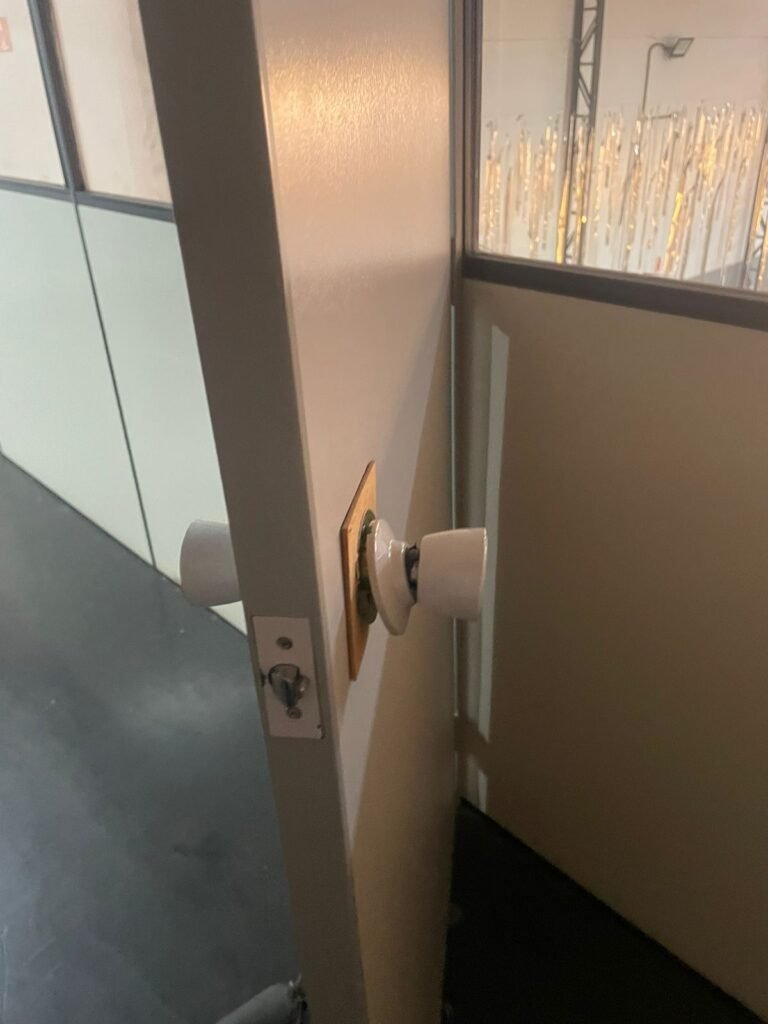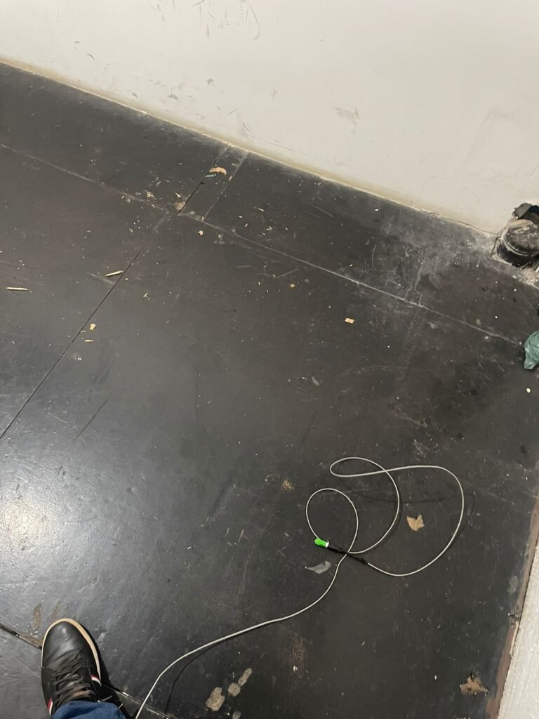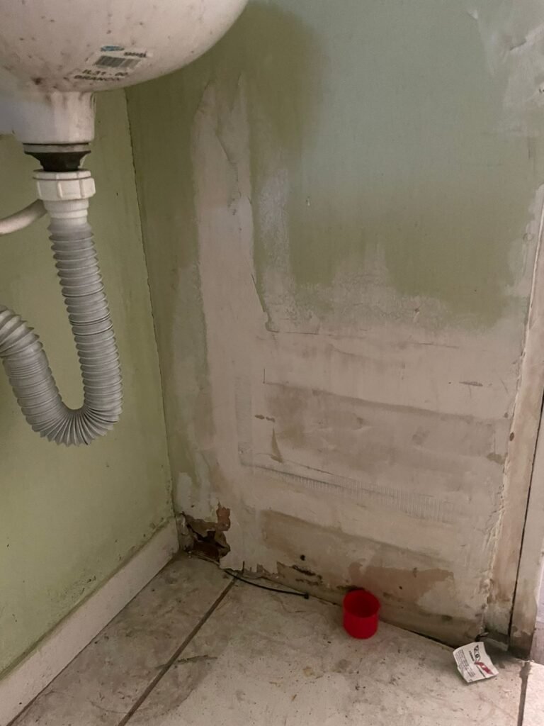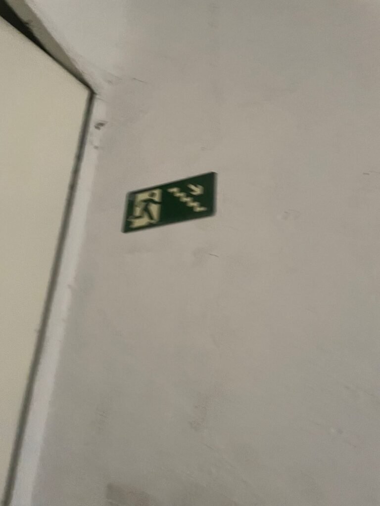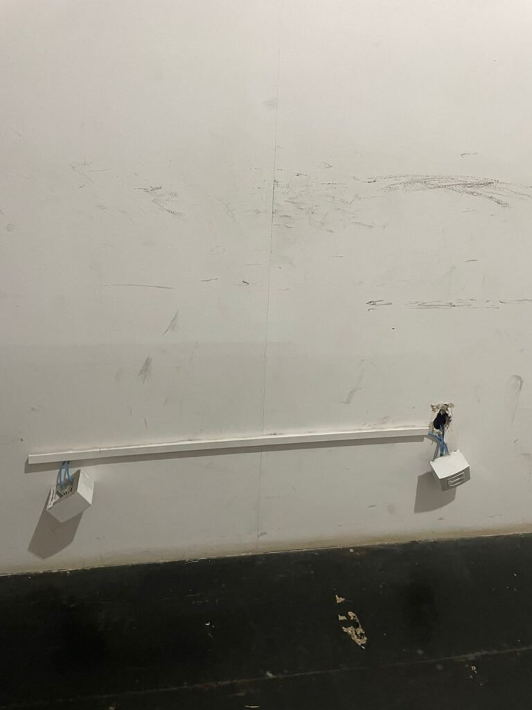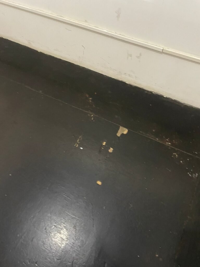 SALA 02-: Porta da divisória naval com maçaneta com tranca embutida e danificada, piso de madeira na cor preta com saindo lascas, paredes com reboco e pintura na cor branco neve com manchas e com grafite, divisória naval com 02 enforca gato e com porta cinza, janelas com 03 vidros lisos transparentes em ordem, 01 interruptor de luz com fio exposto, 01 tomadas, 01 luminária dupla com 01 lâmpada bulbo danificada e 01 lâmpada de LED, teto de PVC na cor branco em ordem.