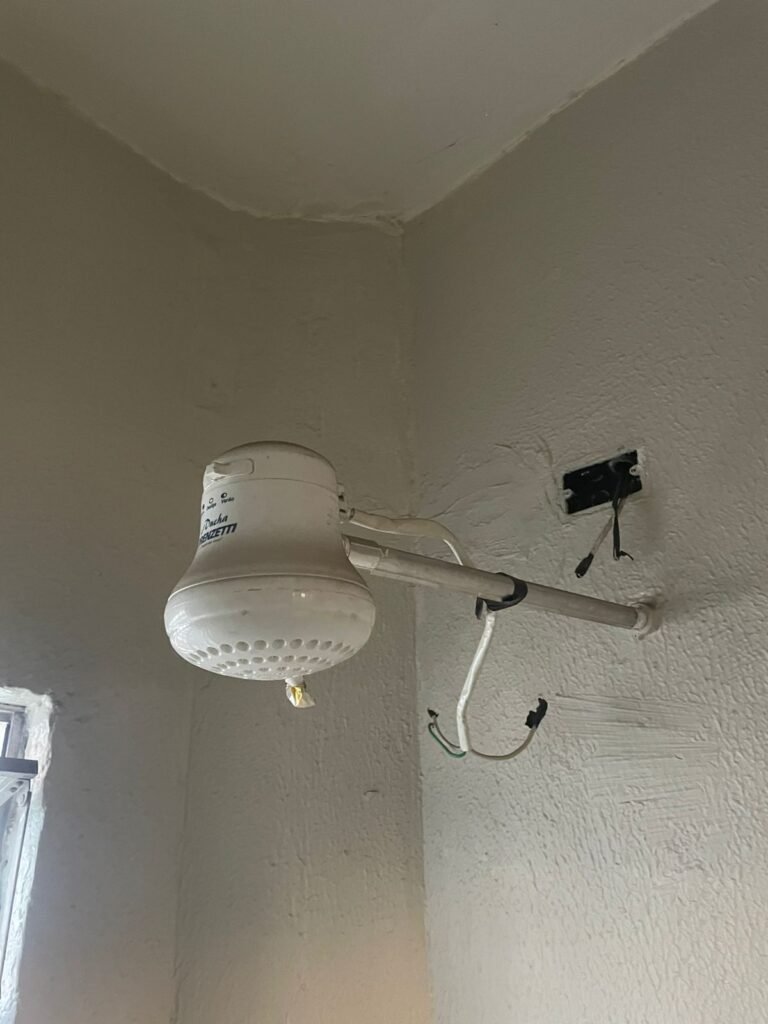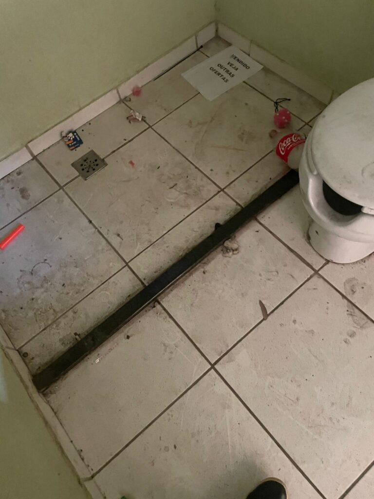 WC/3 FEMININO:- Piso frio cerâmica cor branco sendo 02 deles com trincos, ralo em ordem, parede com pintura na cor branca em ordem, 03 parafusos na parede, 01 furo no teto, conjunto vaso sanitário e caixa acoplada de descarga e tampa de plástico na cor branca em ordem, 01 pia cerâmica branca sifão sanfonado em ordem, 01 vitrô em ordem, porta de madeira branca em ordem, maçanetas danificadas, fechaduras em ordem, teto branco em ordem, 01 interruptor em ordem, 01 luminária em ordem, 01 suporte de papel higiênico em ordem, 01 suporte para sabonete liquido, 01 suporte de papel de mão, 01 registro para chuveiro, 01 chuveiro Lorenzetti, 01 espelho sem tampa, 01 lâmpada bulbo.