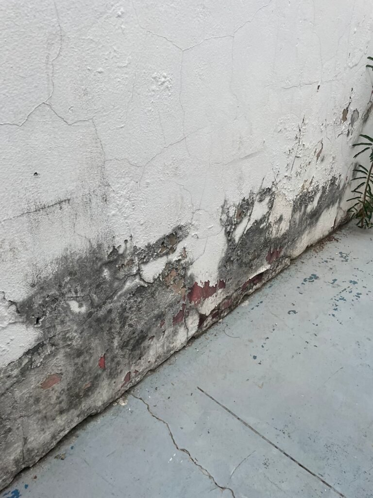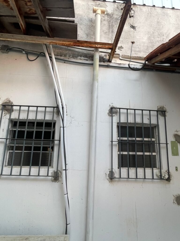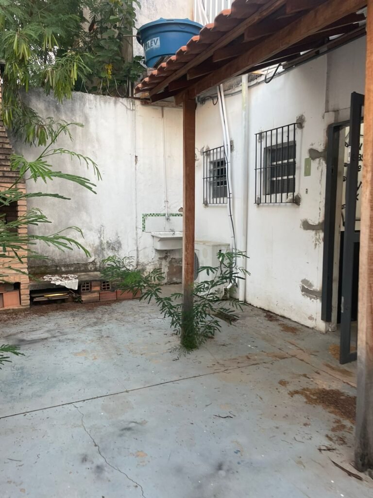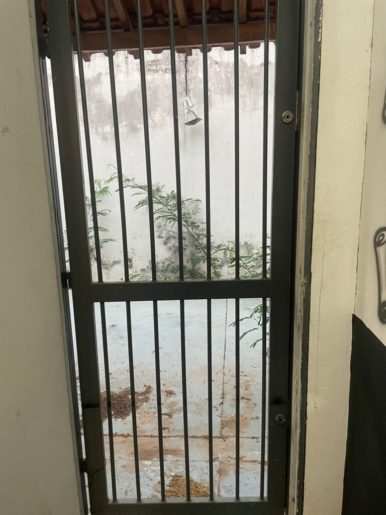 FUNDOS:- Piso de concreto com trincas e pintura descascando, mato alto com vegetação para aparar, telhado de madeira com telhas de barro em ordem, 01 lâmpada bulbo em ordem, 04 lustres tipo lampião danificados, janelas com fechamentos de telhas galvanizadas, 01 churrasqueira de tijolinho á vista, 01 caixa d´ água, 01 tanque branco com torneira sem sifão, 01 unidade condensadora de ar condicionado em ordem, 01 bebedouro de água elétrico natuvel desinstalado, 03 grades de proteção nos vitrôs, muros com reboco e pintura na cor branco com desgastes e manchas concertina em toda a extensão do muro.