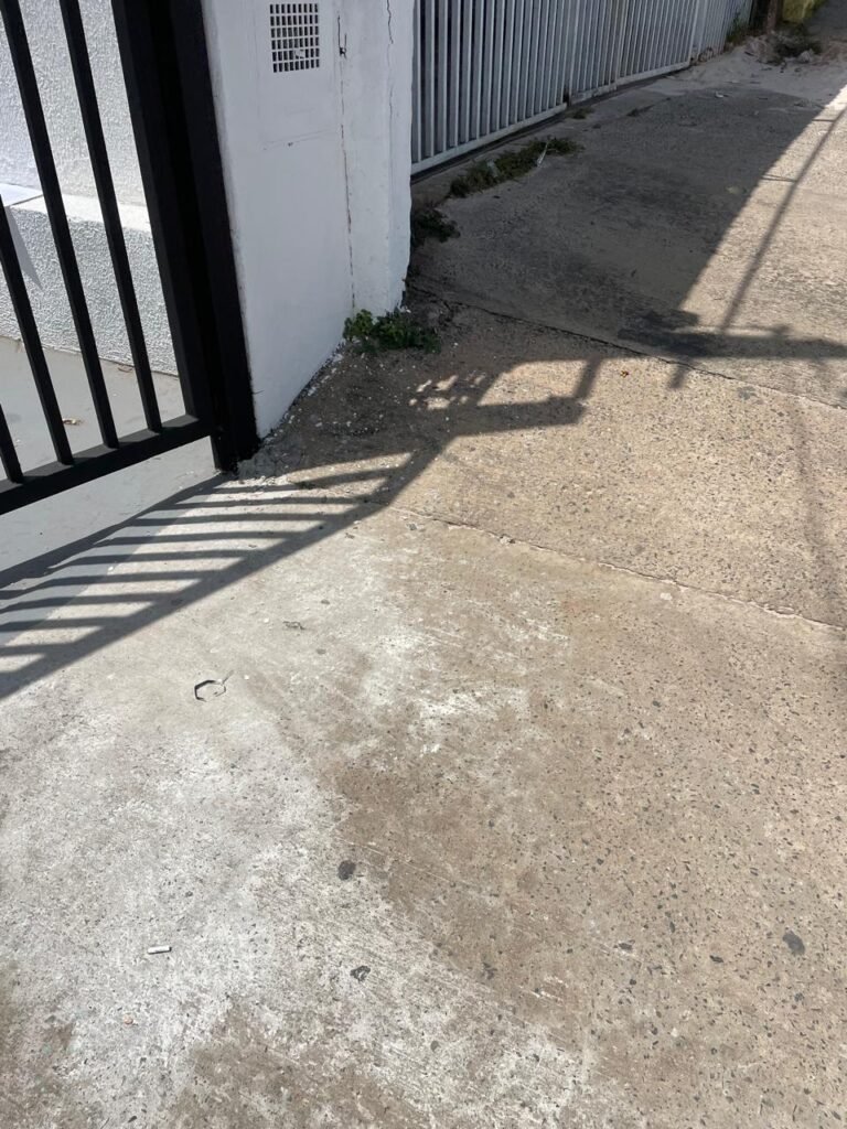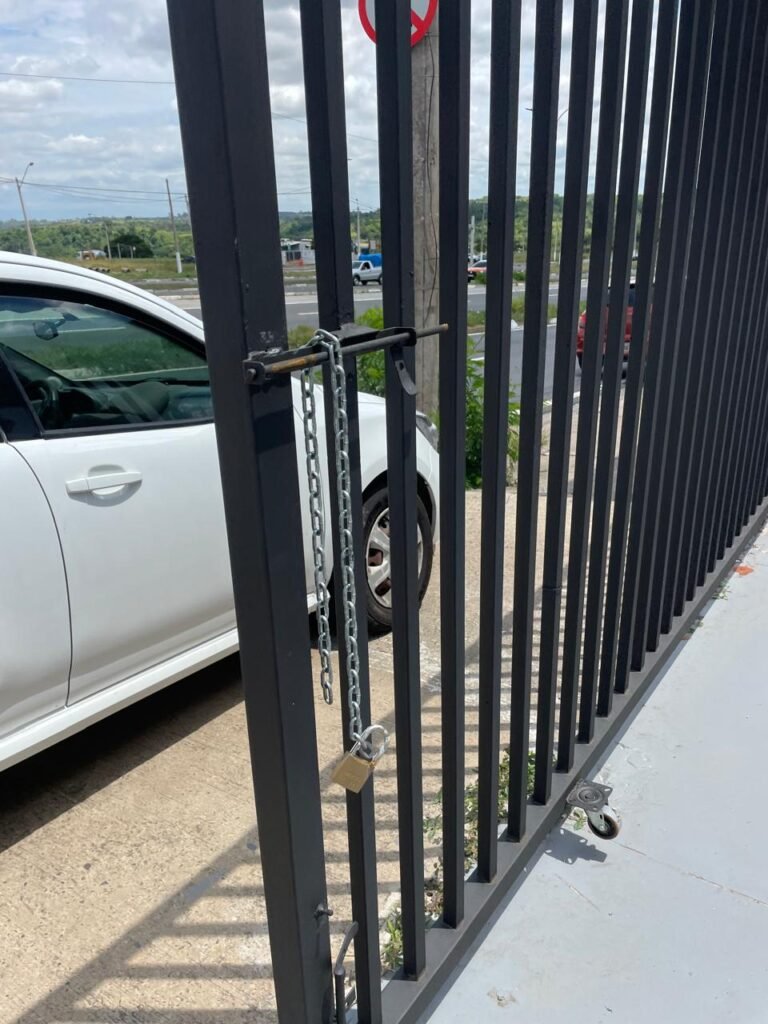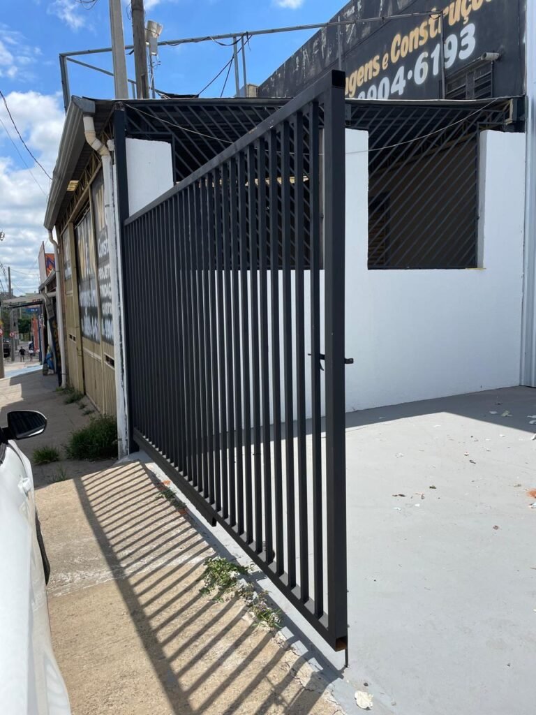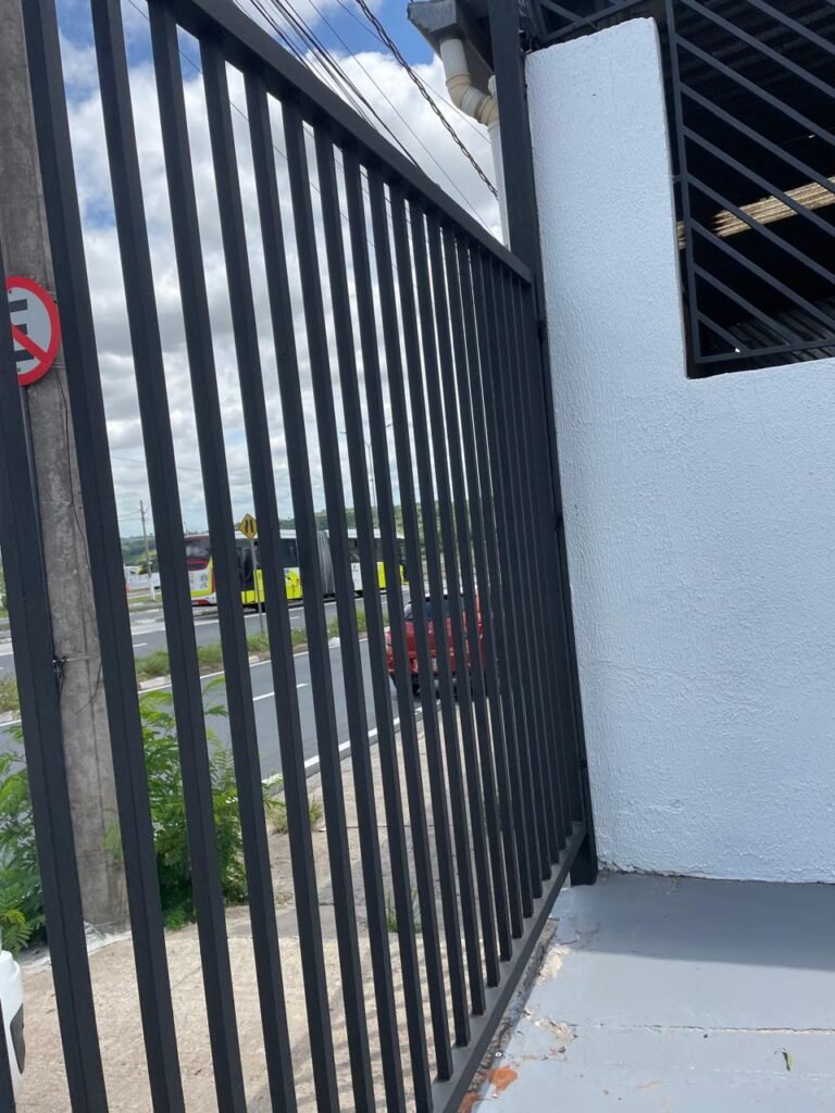 FACHADA-: Calçada de concreto com desgaste natural, vegetação a aparar, portão 02 folhas de ferro metalon, com pintura na cor preto nova e em ordem, com 02 roldanas soldadas novas e em ordem, 03 fechaduras em ordem, com 01 corrente nova e em ordem, 01 cadeado marca Pado em ordem, 01 poste padrão e relógio Cpfl em ordem, com 01 grade de proteção de ferro modelo imperial com pintura na cor preto nova e em ordem, 01 relógio e poste padrão Sanasa em ordem.