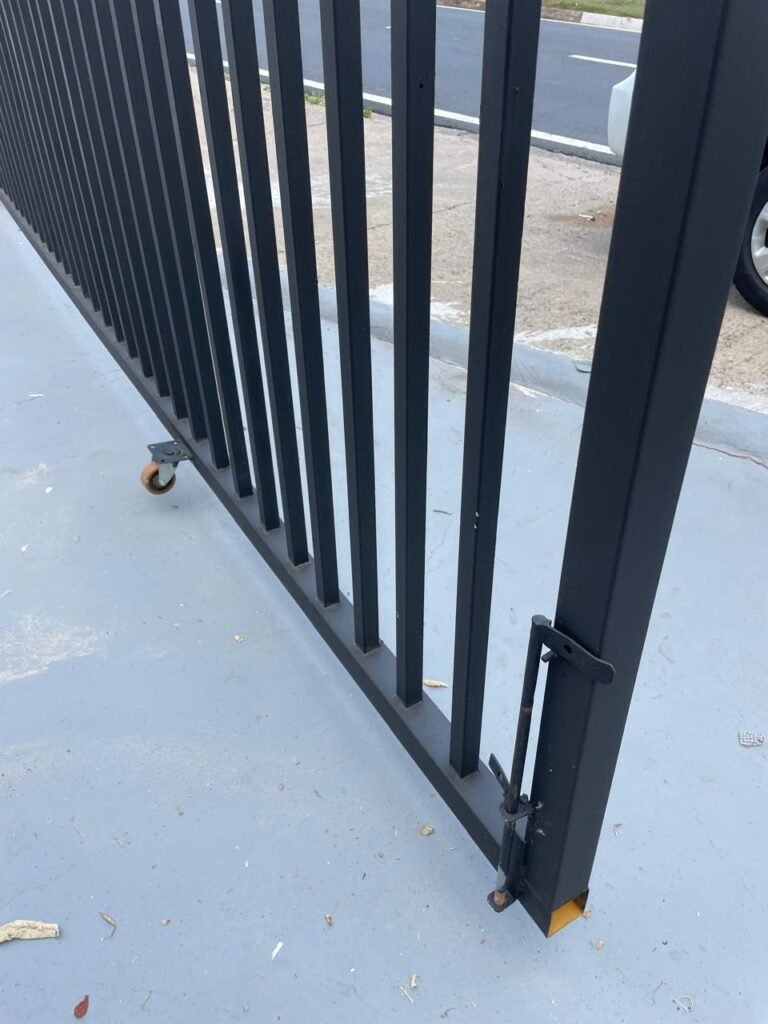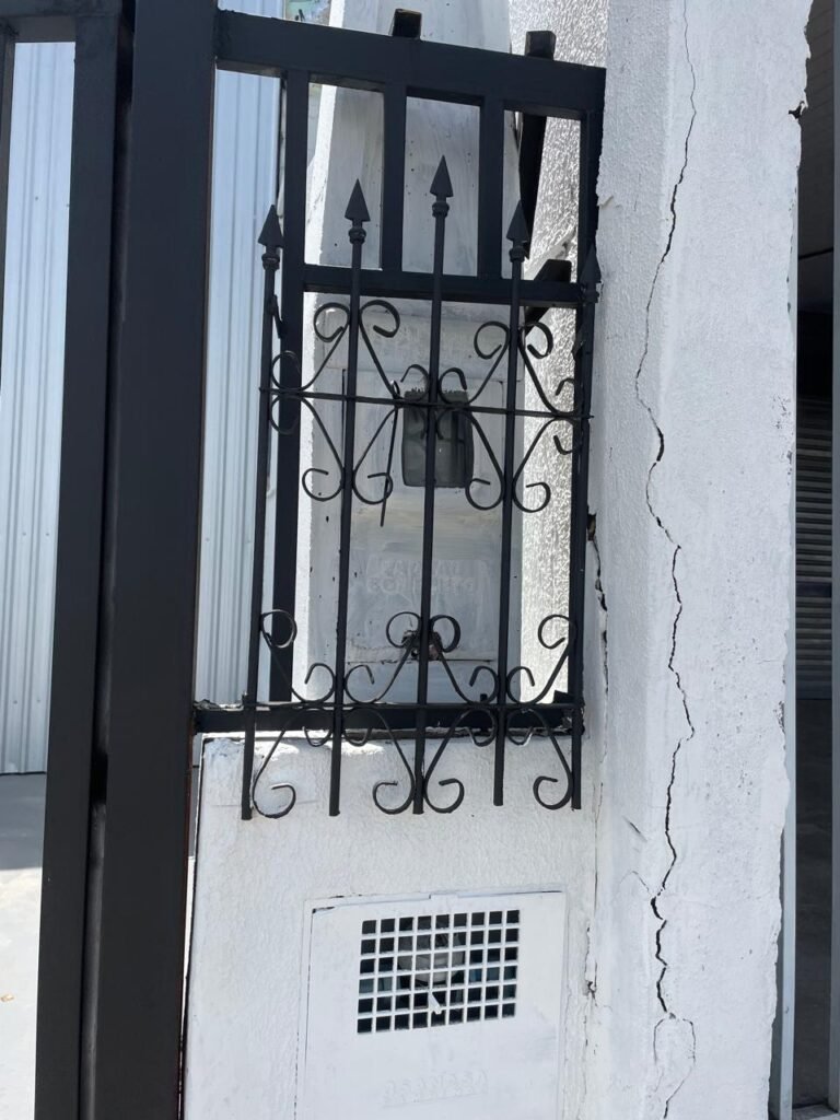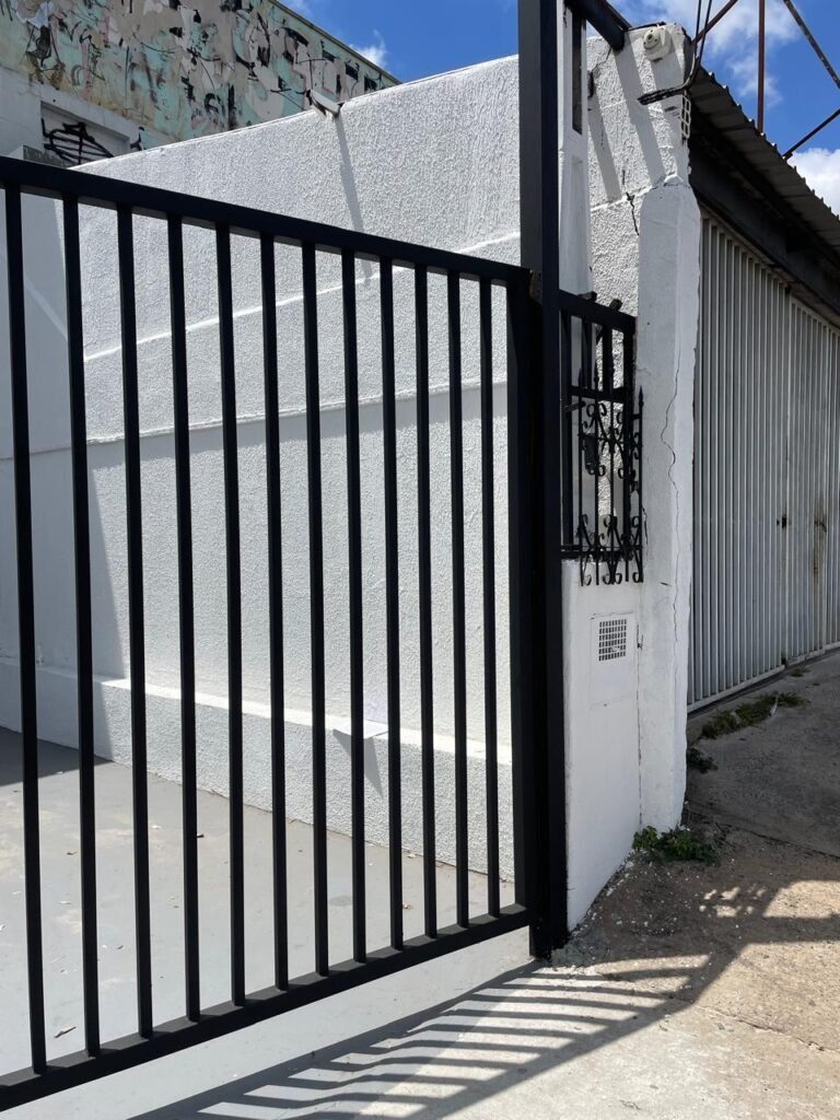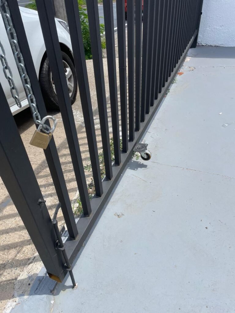 FACHADA-: Calçada de concreto com desgaste natural, vegetação a aparar, portão 02 folhas de ferro metalon, com pintura na cor preto nova e em ordem, com 02 roldanas soldadas novas e em ordem, 03 fechaduras em ordem, com 01 corrente nova e em ordem, 01 cadeado marca Pado em ordem, 01 poste padrão e relógio Cpfl em ordem, com 01 grade de proteção de ferro modelo imperial com pintura na cor preto nova e em ordem, 01 relógio e poste padrão Sanasa em ordem.