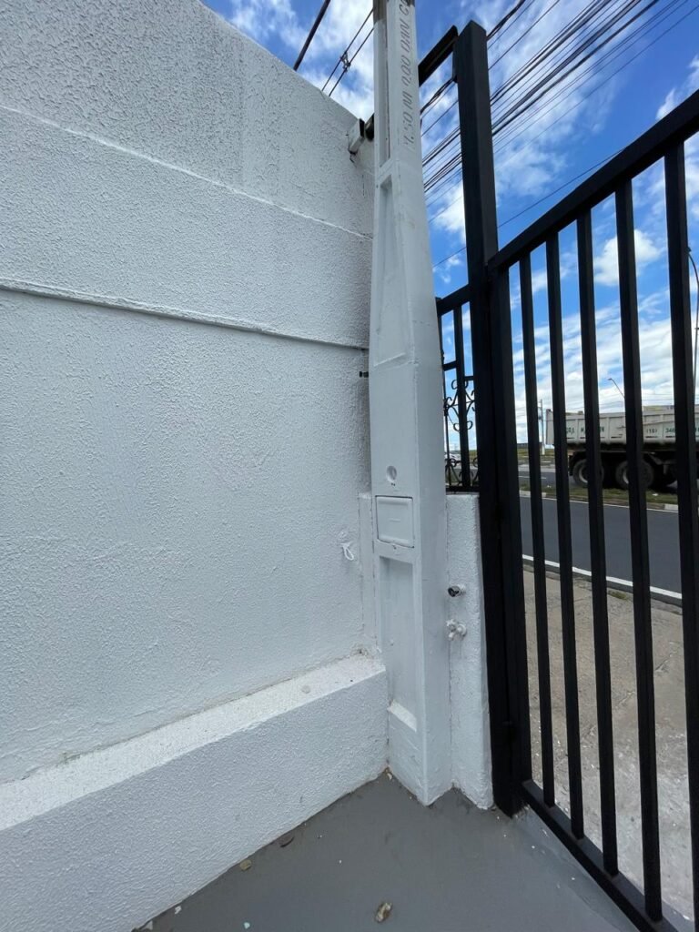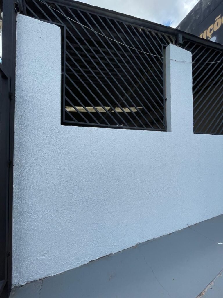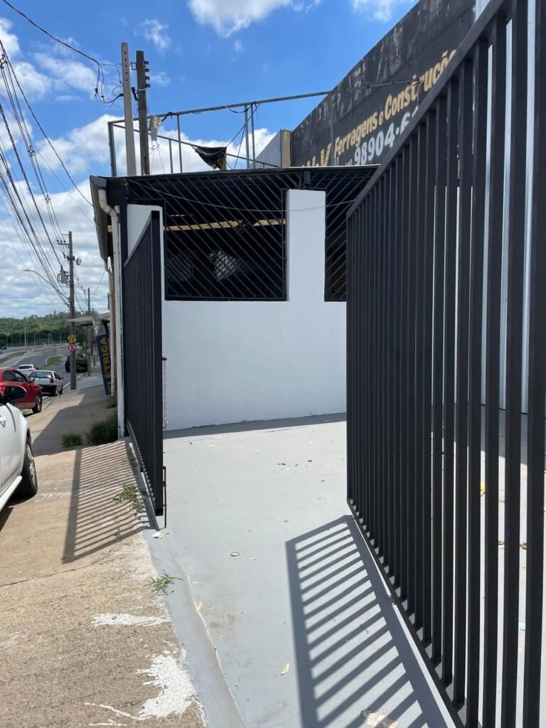 GARAGEM-: Piso de concreto polido como pintura acrílica premium na cor cinza nova e em ordem, paredes laterais com textura e com pintura na cor branco neve nova e em ordem, fachada de telhas galvanizadas novas e em ordem marca Nacional telhas, 01 canopla em inox com tampa faltando, 01 torneira de plástico cor branco marca Hydra em ordem, portão de ferro automatizado novo e em ordem, com 01 motor marca Htronix novo e em ordem, com 01 botoeira e 01 controle em ordem, 01 porta social de ferro com 02 fechaduras tetras marca Cadeado Brasilia e 02 puxadores em ordem, paredes com pintura na cor branco neve nova e em ordem.