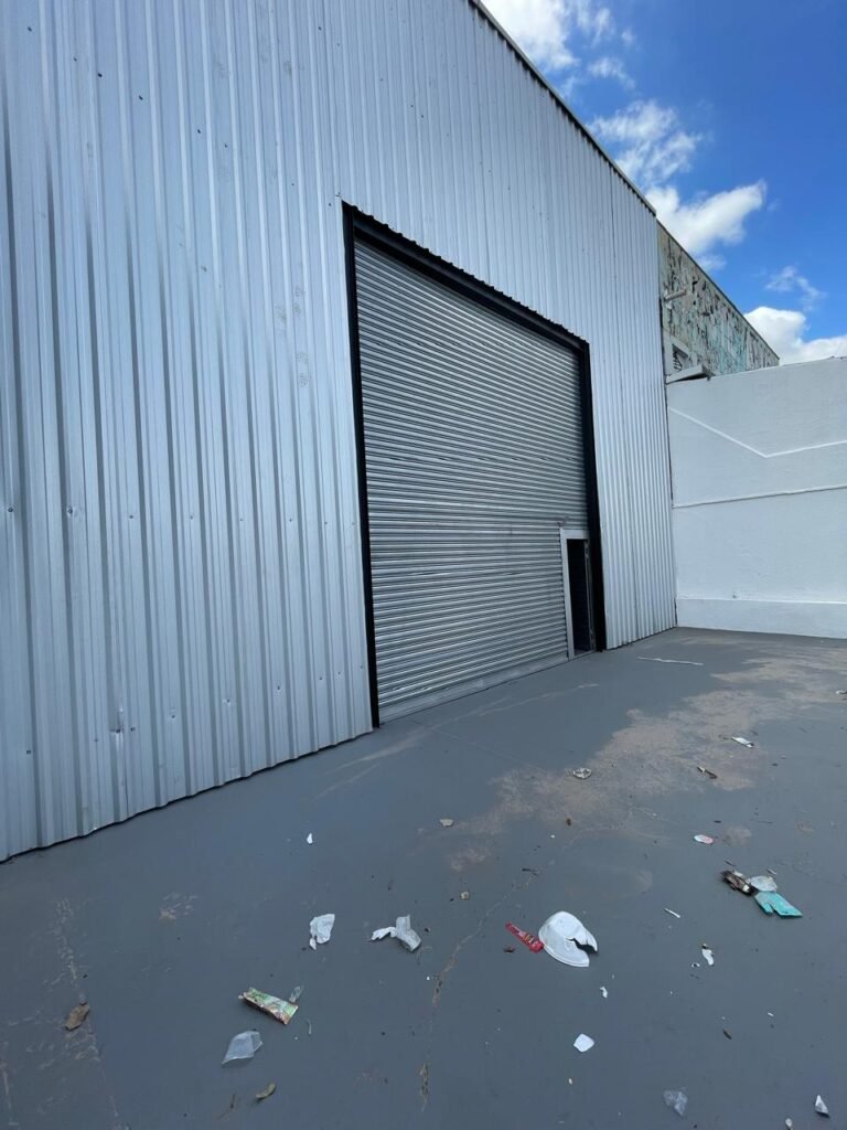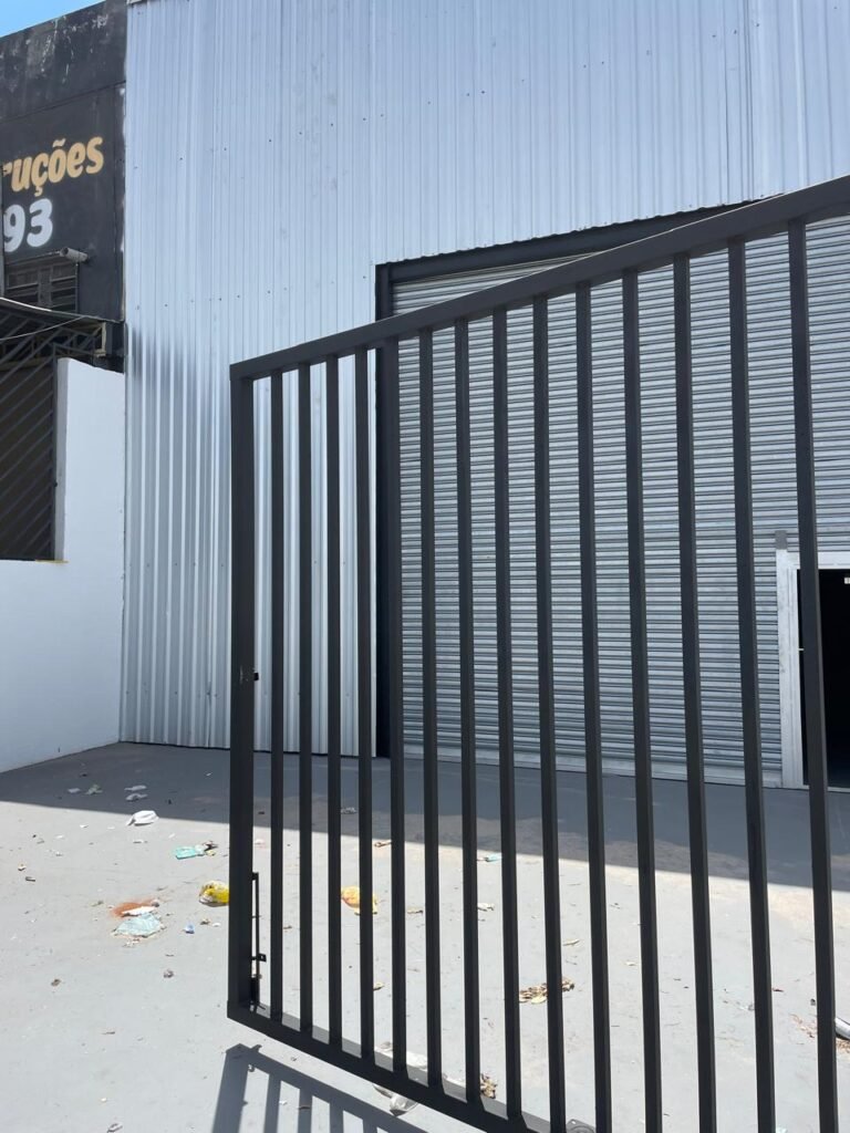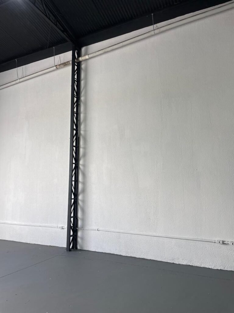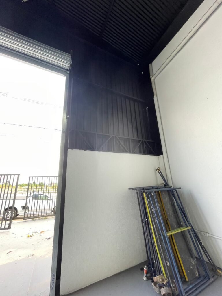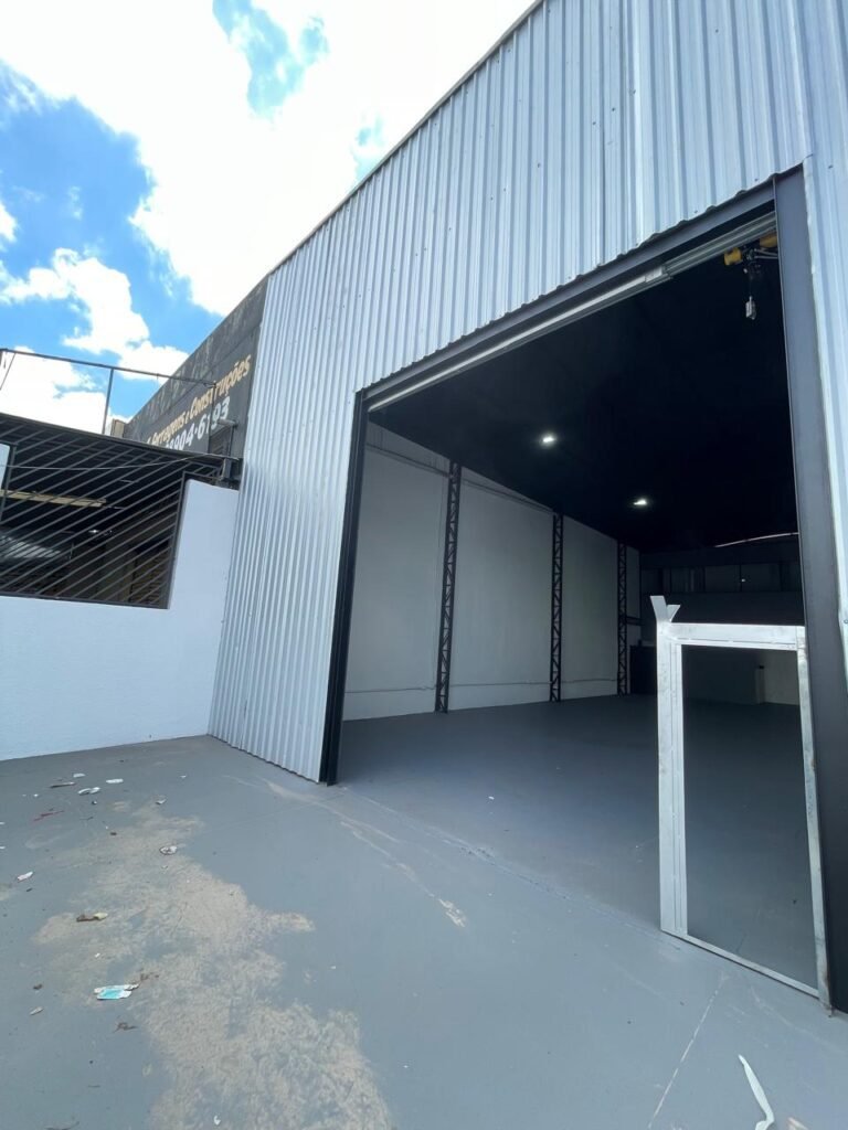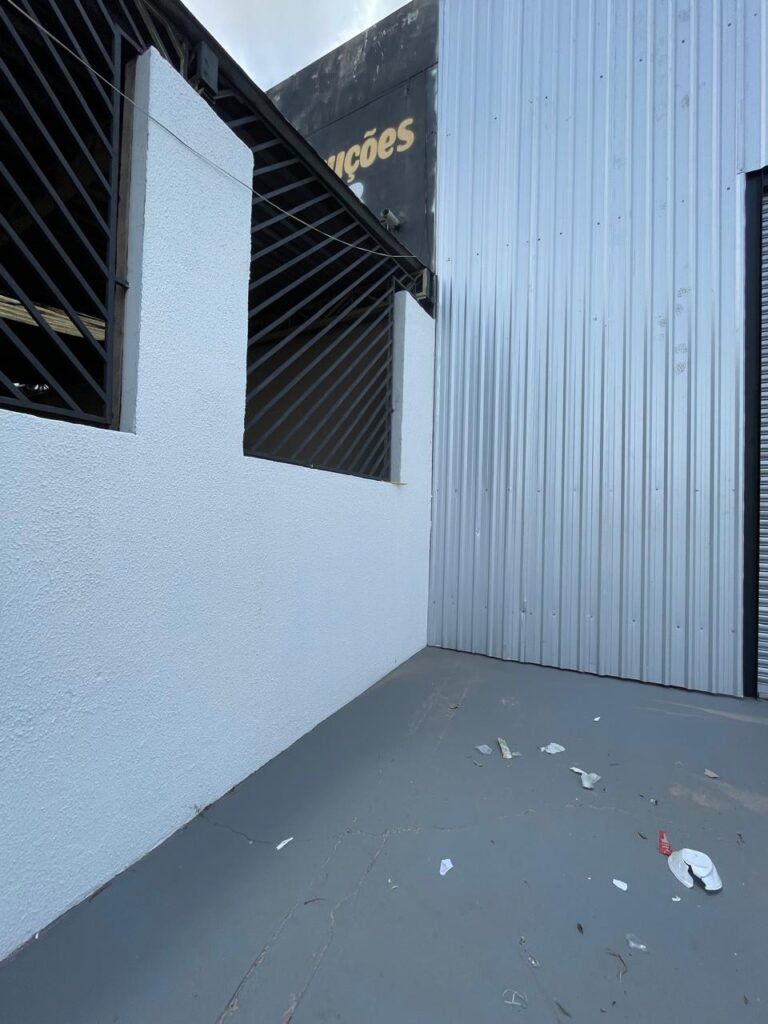 GALPÃO-: Piso de concreto usinado e polido com pintura acrílica premium na cor cinza nova e em ordem, paredes laterais com textura e pintura na cor branco neve nova e em ordem, telhado de estrutura metálica com pintura nova na cor preto nova e em ordem, com telhas galvanizadas com pintura na cor preto nova e em ordem, 01 caixa de disjuntores gerais sendo eles, 01 disjuntor trifásico 63A, 07 disjuntores bifásico 20A, 06 disjuntores monofásico 16A, 02 disjuntores bifásico 32A. 06 holofotes 300w IP66 com Led em ordem, 02 interruptores em ordem, interação elétrica por conduletes externos com 20 tomadas, 02 tomadas sem espelho.
