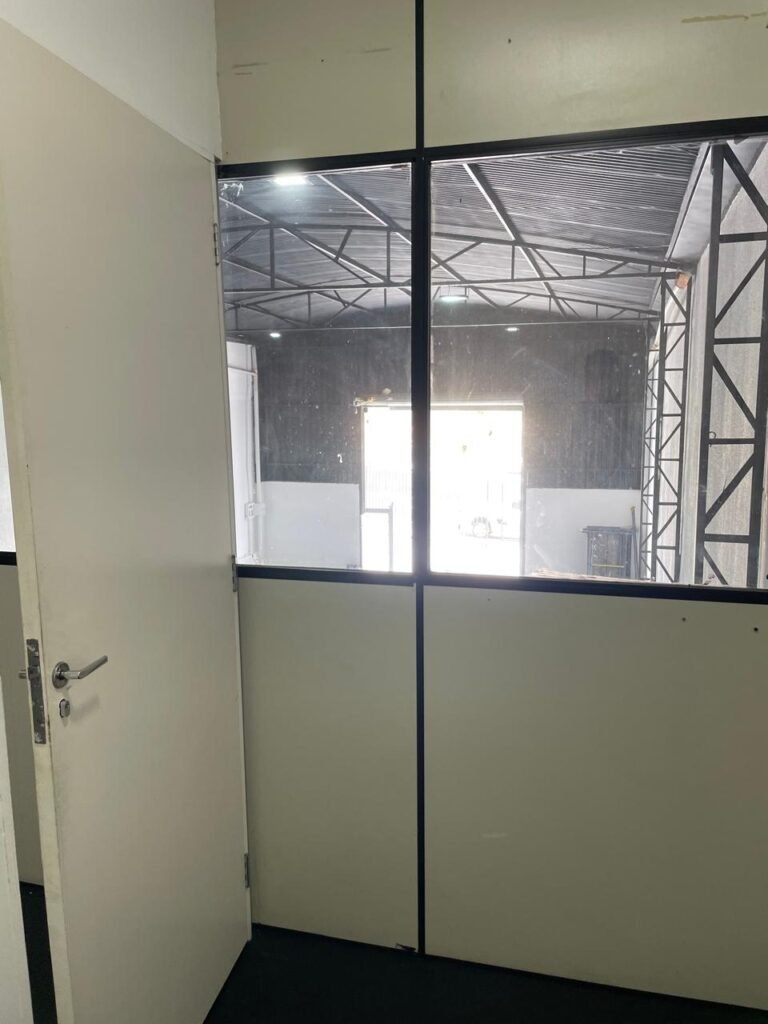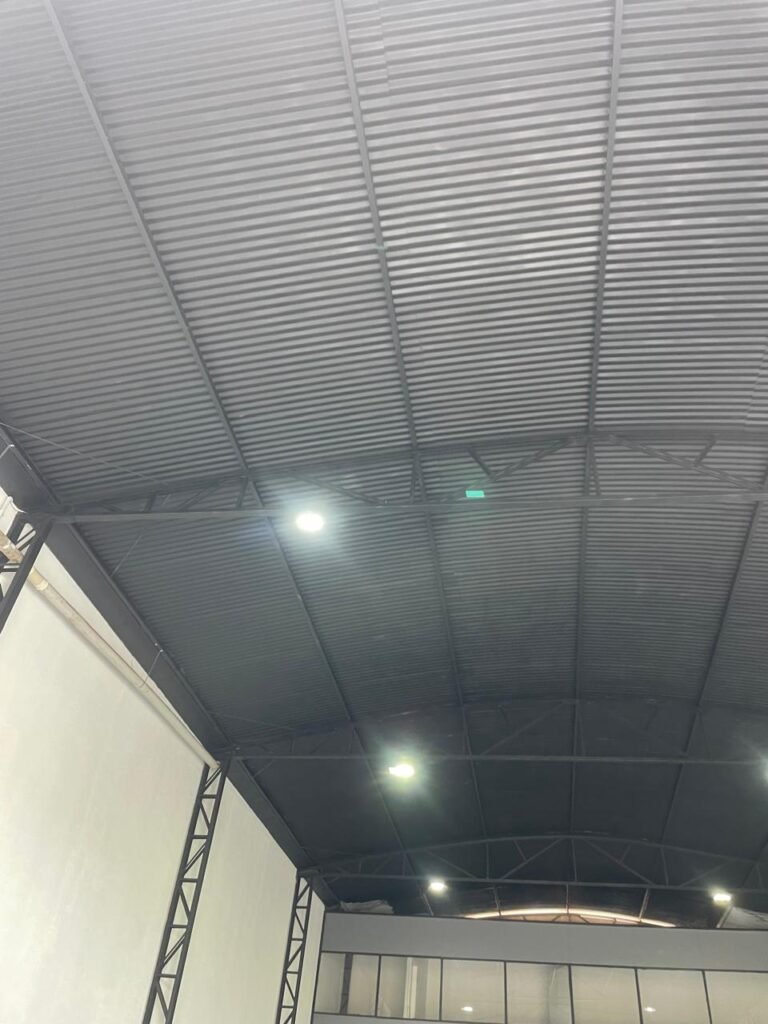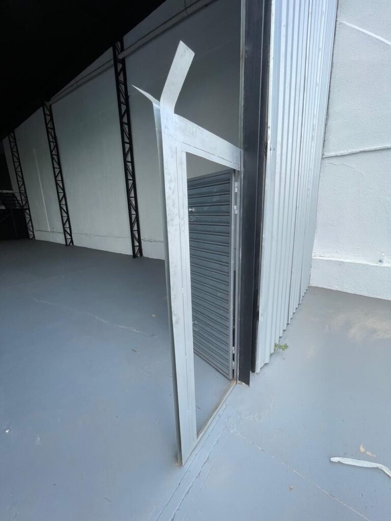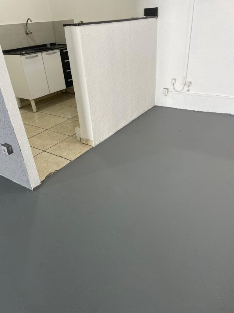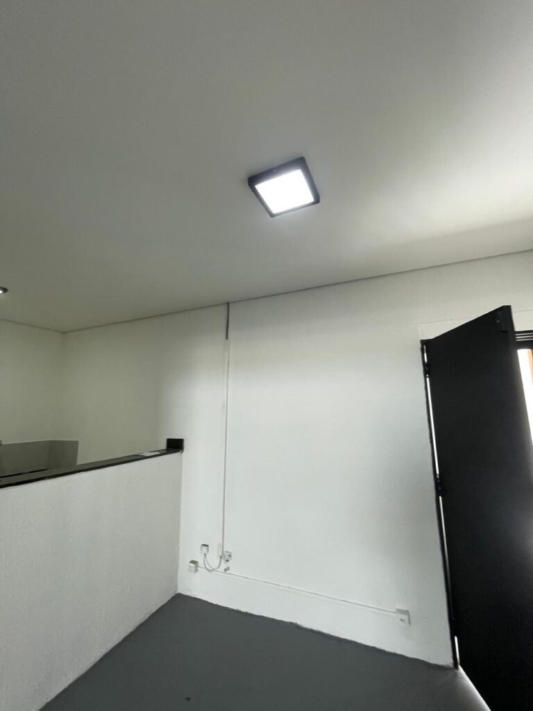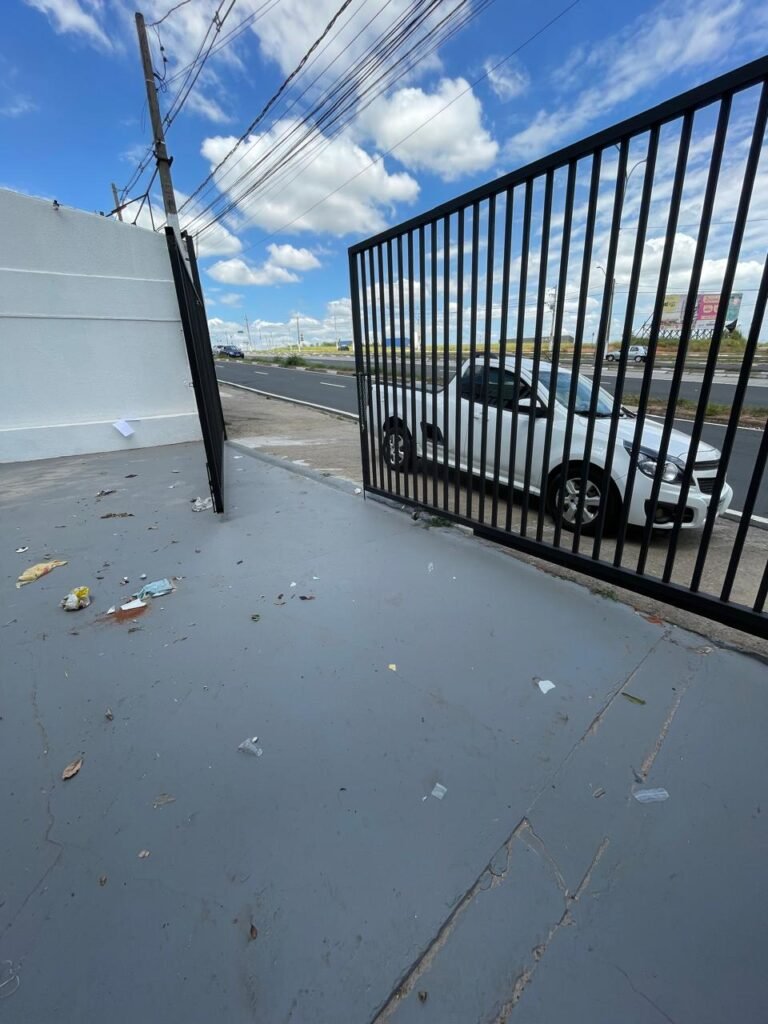 GALPÃO-: Piso de concreto usinado e polido com pintura acrílica premium na cor cinza nova e em ordem, paredes laterais com textura e pintura na cor branco neve nova e em ordem, telhado de estrutura metálica com pintura nova na cor preto nova e em ordem, com telhas galvanizadas com pintura na cor preto nova e em ordem, 01 caixa de disjuntores gerais sendo eles, 01 disjuntor trifásico 63A, 07 disjuntores bifásico 20A, 06 disjuntores monofásico 16A, 02 disjuntores bifásico 32A. 06 holofotes 300w IP66 com Led em ordem, 02 interruptores em ordem, interação elétrica por conduletes externos com 20 tomadas, 02 tomadas sem espelho.