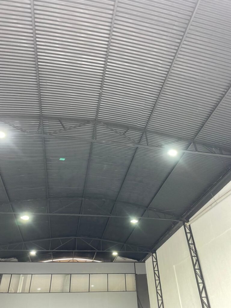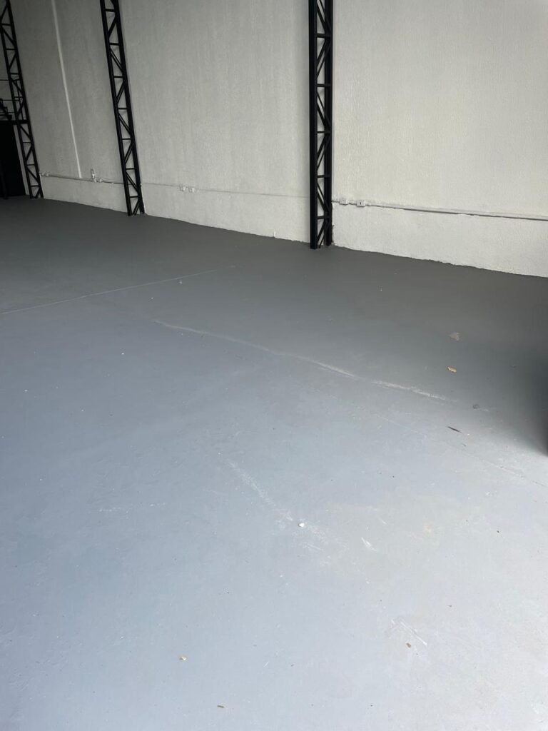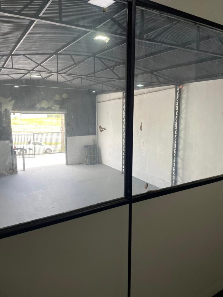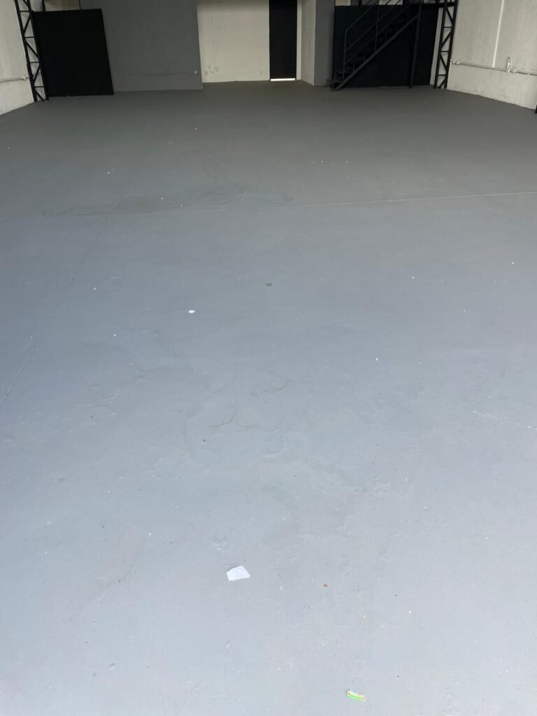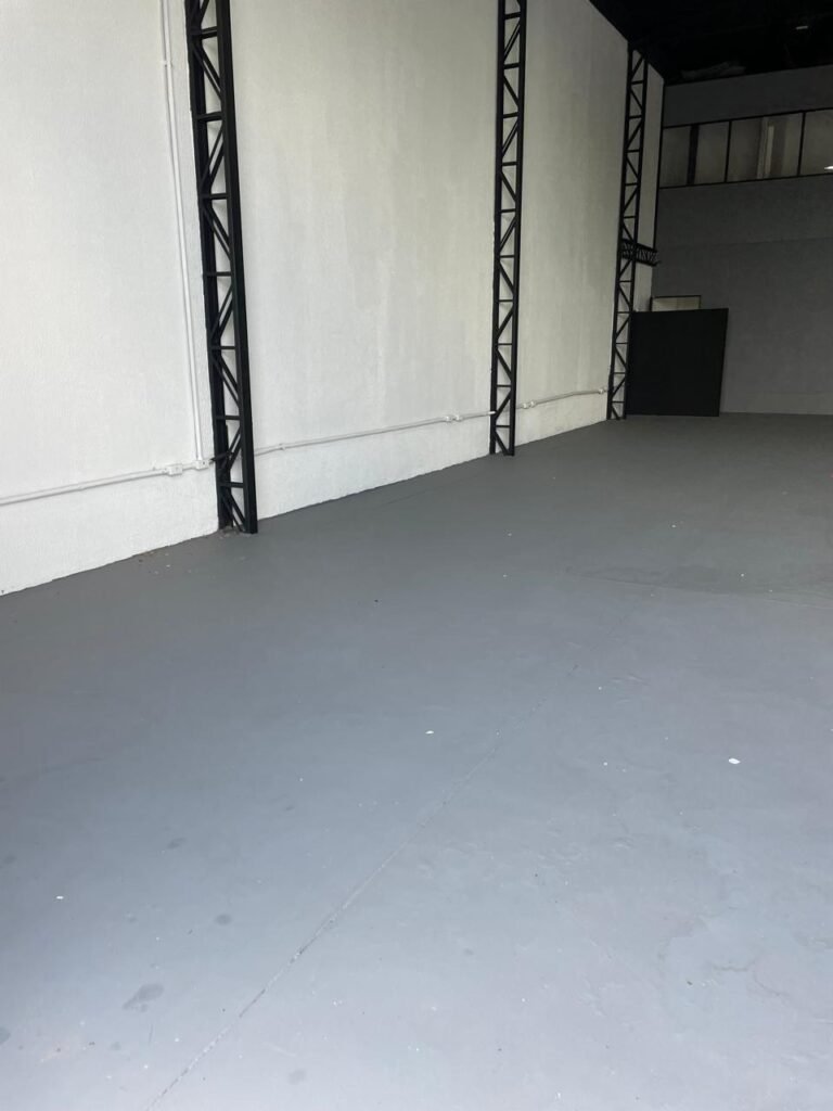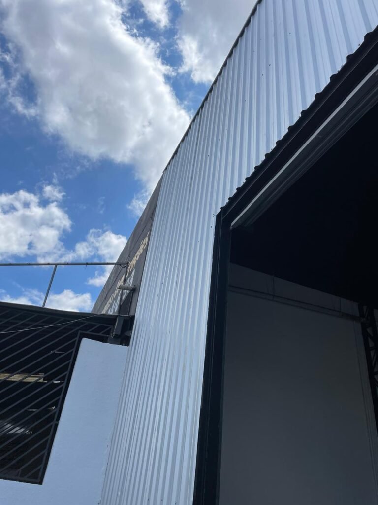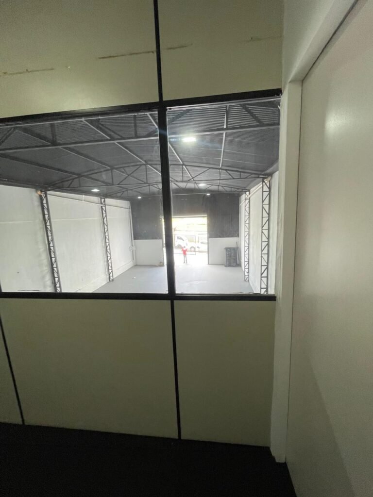 GALPÃO-: Piso de concreto usinado e polido com pintura acrílica premium na cor cinza nova e em ordem, paredes laterais com textura e pintura na cor branco neve nova e em ordem, telhado de estrutura metálica com pintura nova na cor preto nova e em ordem, com telhas galvanizadas com pintura na cor preto nova e em ordem, 01 caixa de disjuntores gerais sendo eles, 01 disjuntor trifásico 63A, 07 disjuntores bifásico 20A, 06 disjuntores monofásico 16A, 02 disjuntores bifásico 32A. 06 holofotes 300w IP66 com Led em ordem, 02 interruptores em ordem, interação elétrica por conduletes externos com 20 tomadas, 02 tomadas sem espelho.