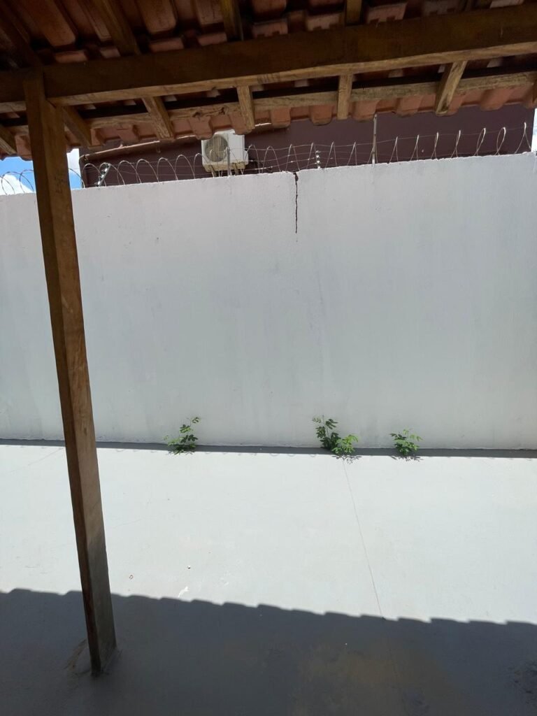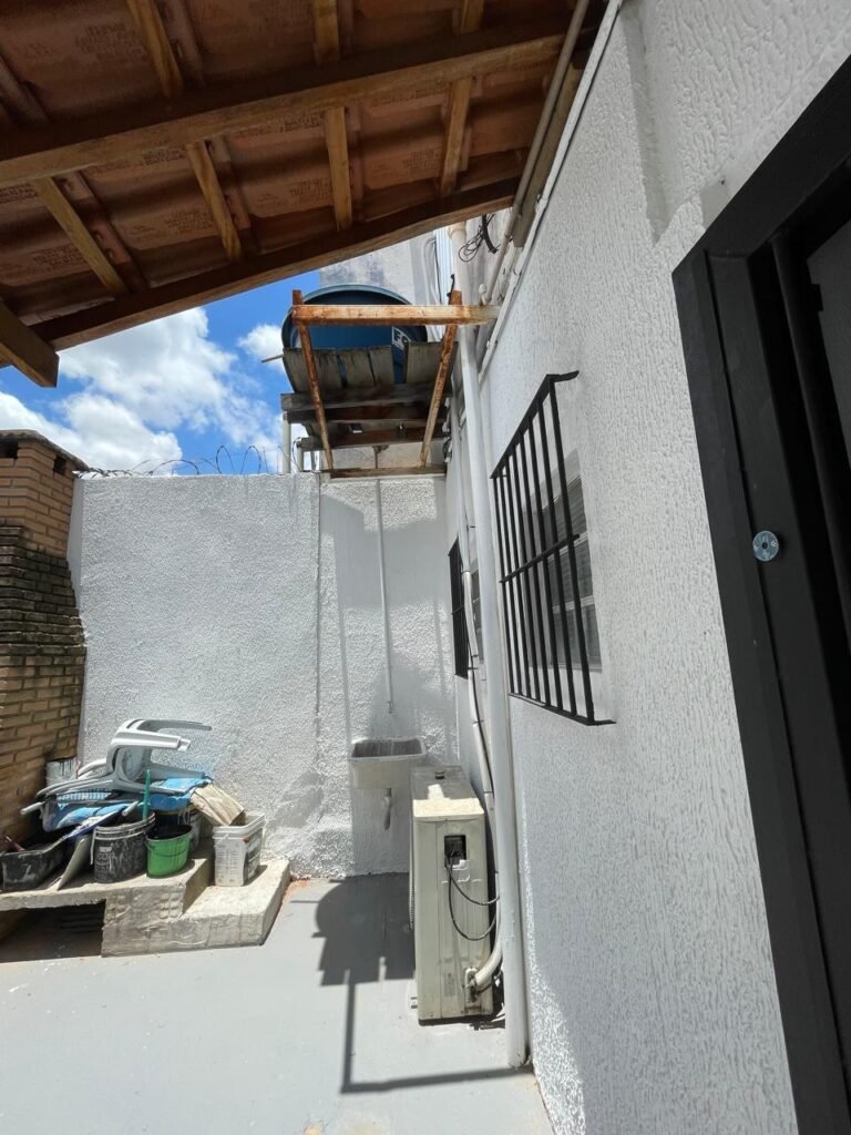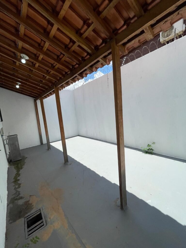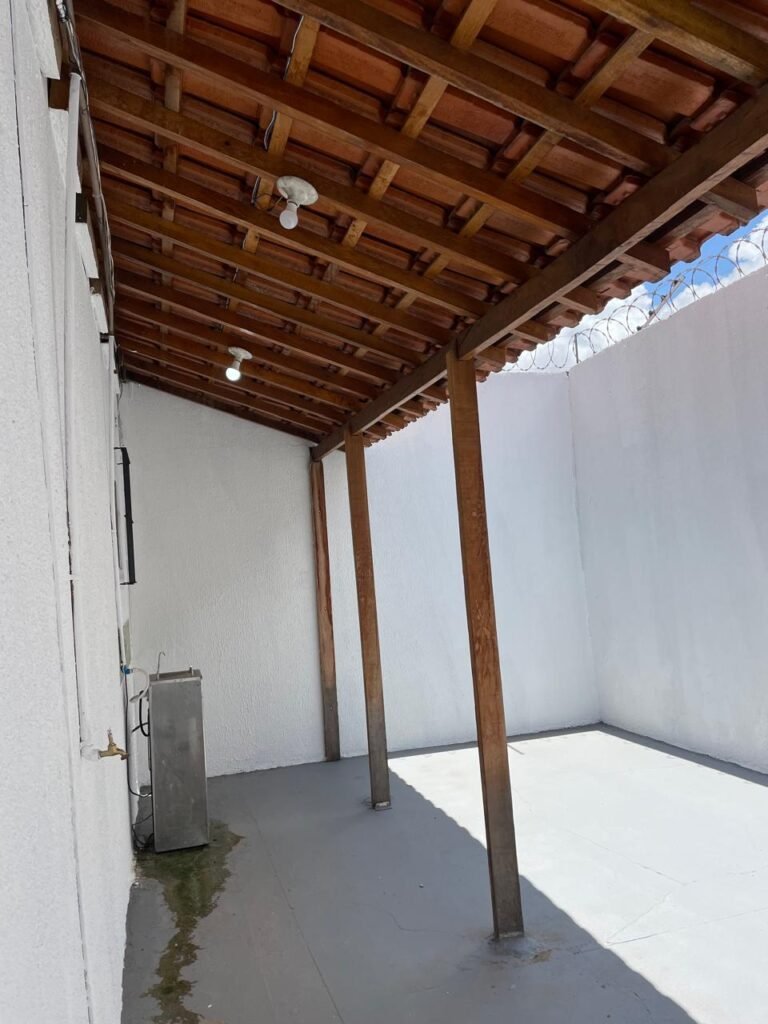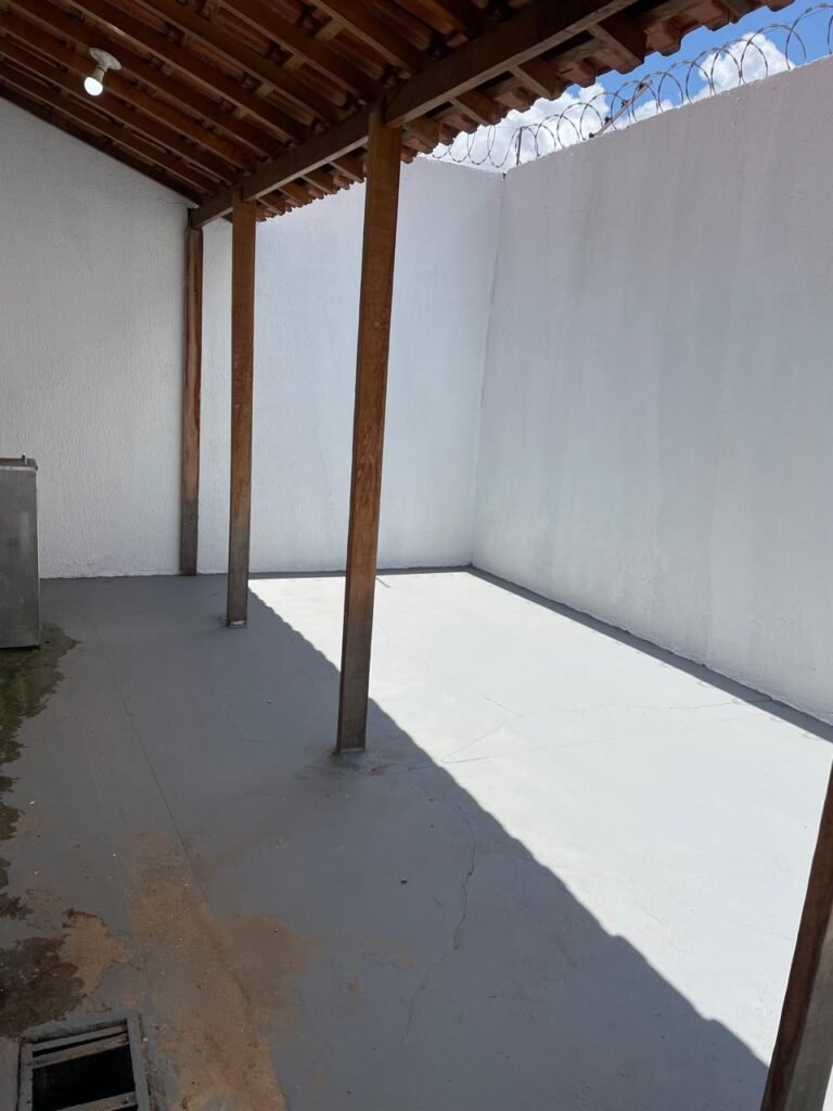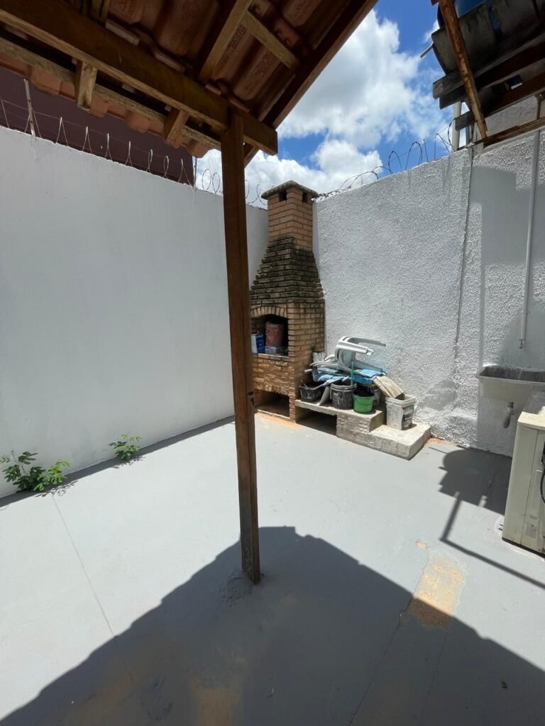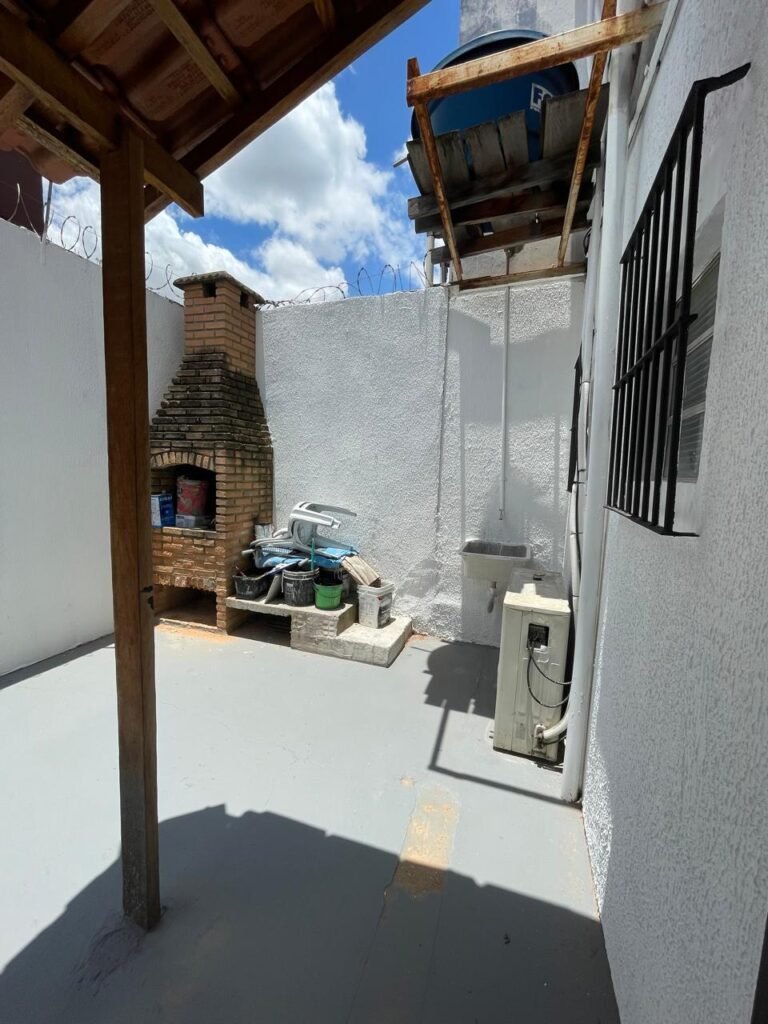 FUNDOS-: Piso de concreto usinado e polido com pintura acrílica na cor cinza nova e em ordem, telhado de madeira com telhas de barro em ordem, 03 lâmpadas bulbo em ordem, 03 grades de proteção de ferro com pintura na cor preto nova e em ordem, 01 churrasqueira de tijolinho á vista, 01 caixa d´ água, 01 tanque branco com torneira e sifão sanfonado em ordem, 01 unidade condensadora de ar condicionado em ordem, 01 bebedouro de água elétrico natuvel desinstalado, muros com pintura na cor branco neve nova e em ordem, cerca concertina em ordem.