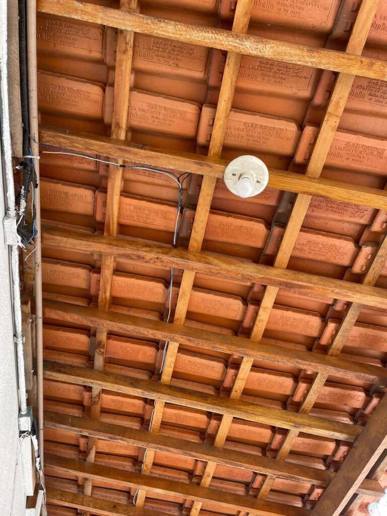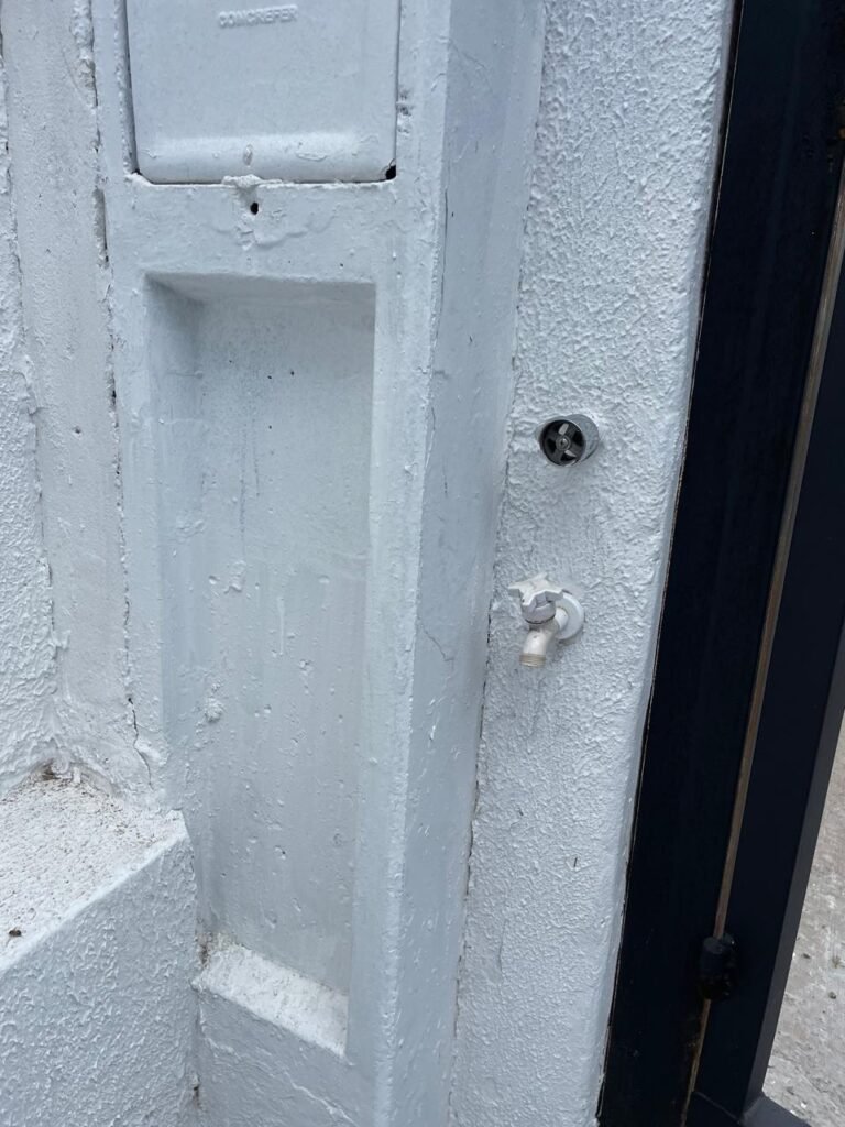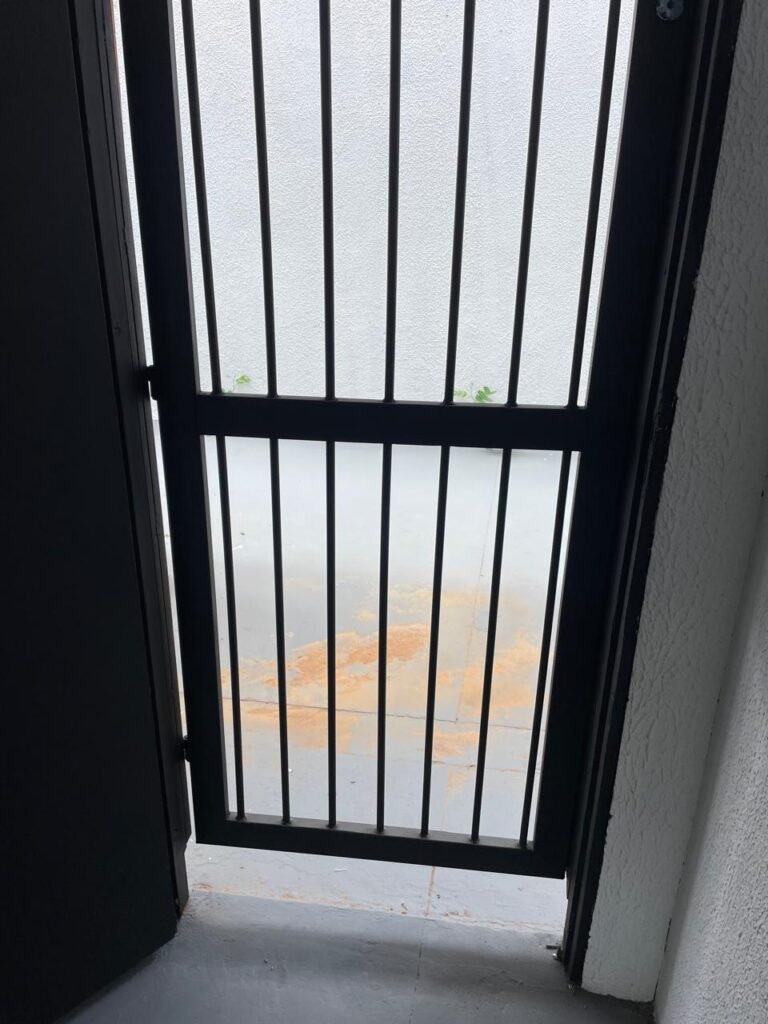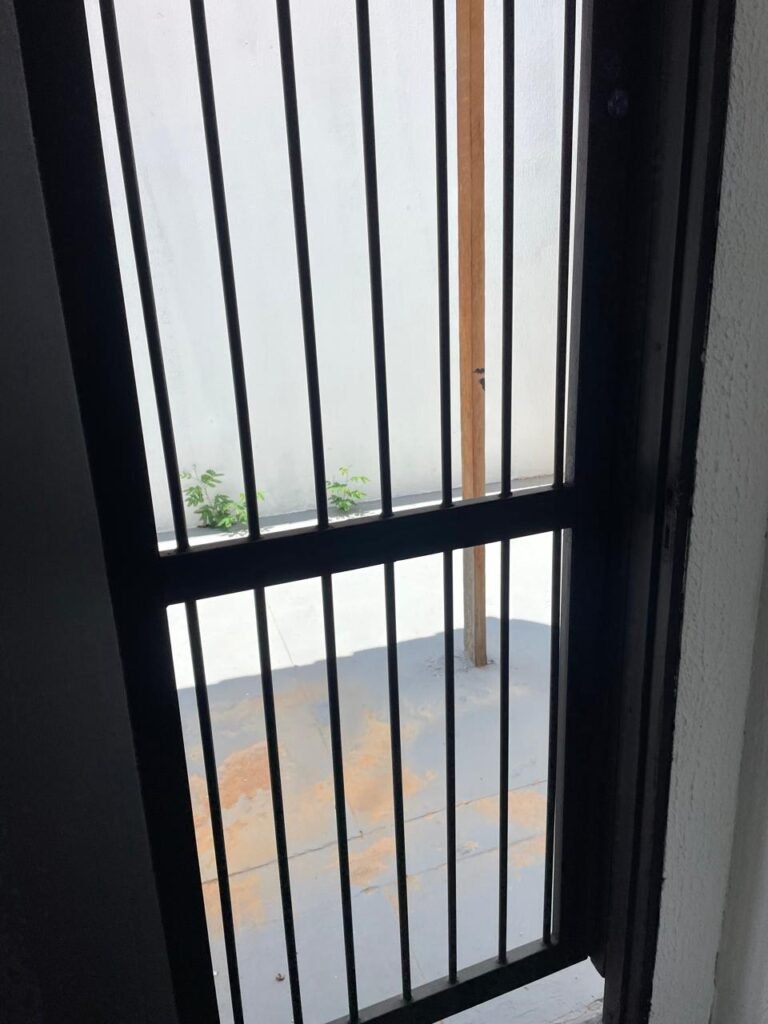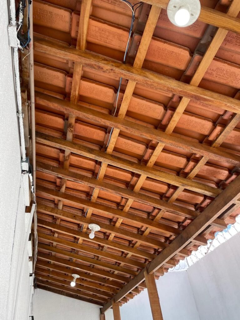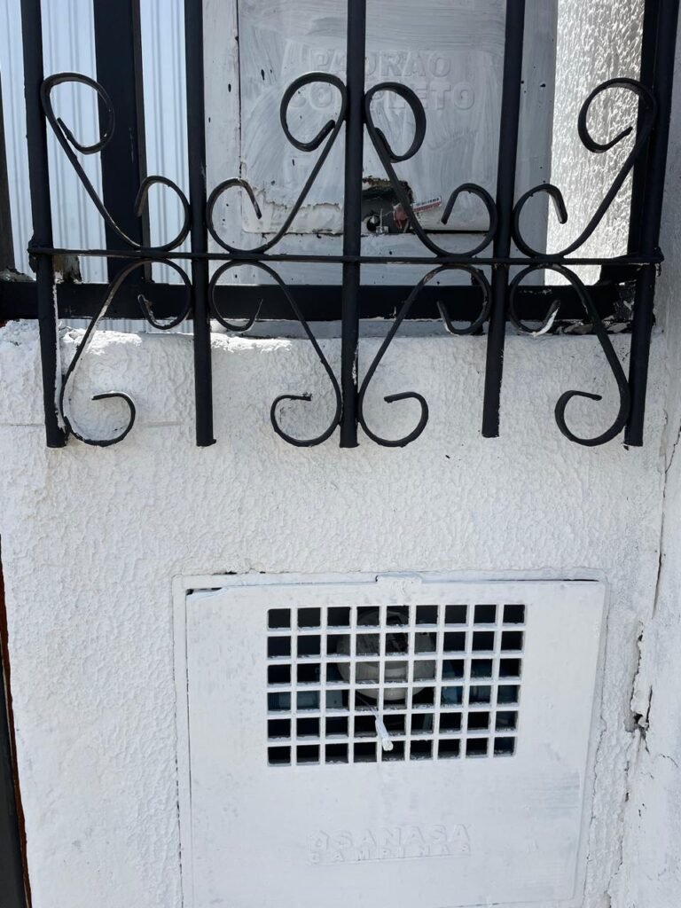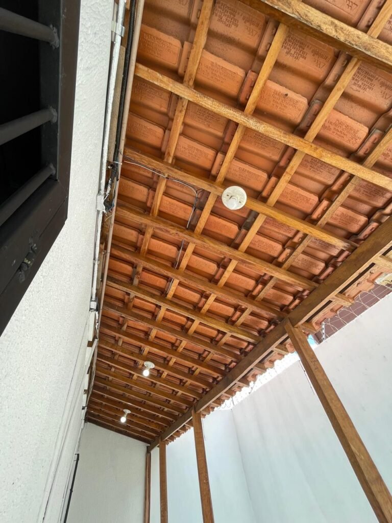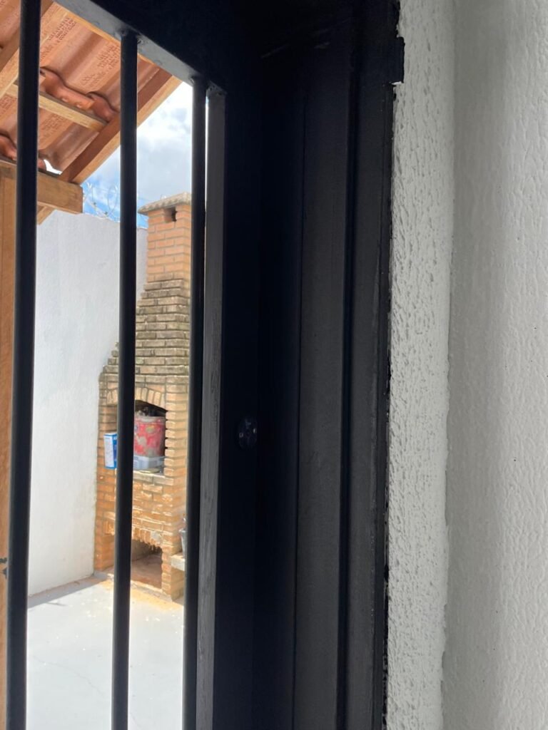 FUNDOS-: Piso de concreto usinado e polido com pintura acrílica na cor cinza nova e em ordem, telhado de madeira com telhas de barro em ordem, 03 lâmpadas bulbo em ordem, 03 grades de proteção de ferro com pintura na cor preto nova e em ordem, 01 churrasqueira de tijolinho á vista, 01 caixa d´ água, 01 tanque branco com torneira e sifão sanfonado em ordem, 01 unidade condensadora de ar condicionado em ordem, 01 bebedouro de água elétrico natuvel desinstalado, muros com pintura na cor branco neve nova e em ordem, cerca concertina em ordem.